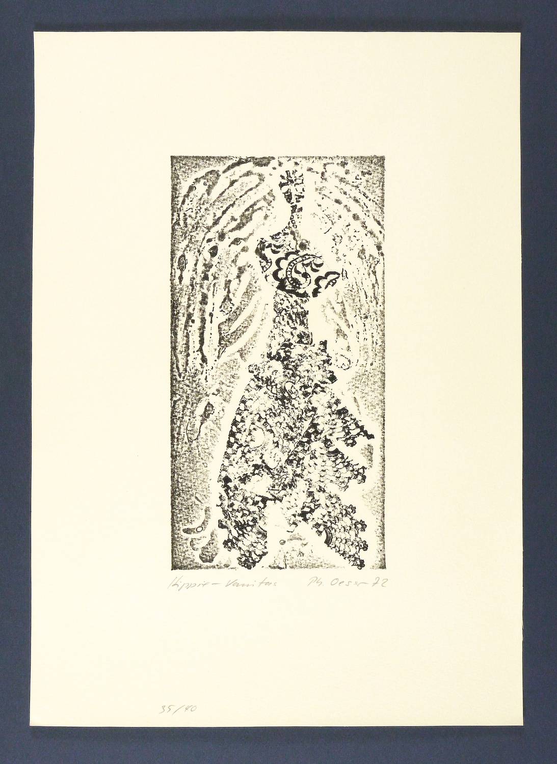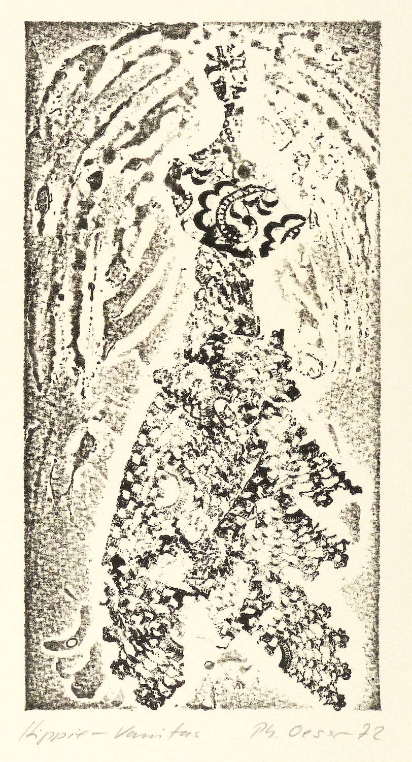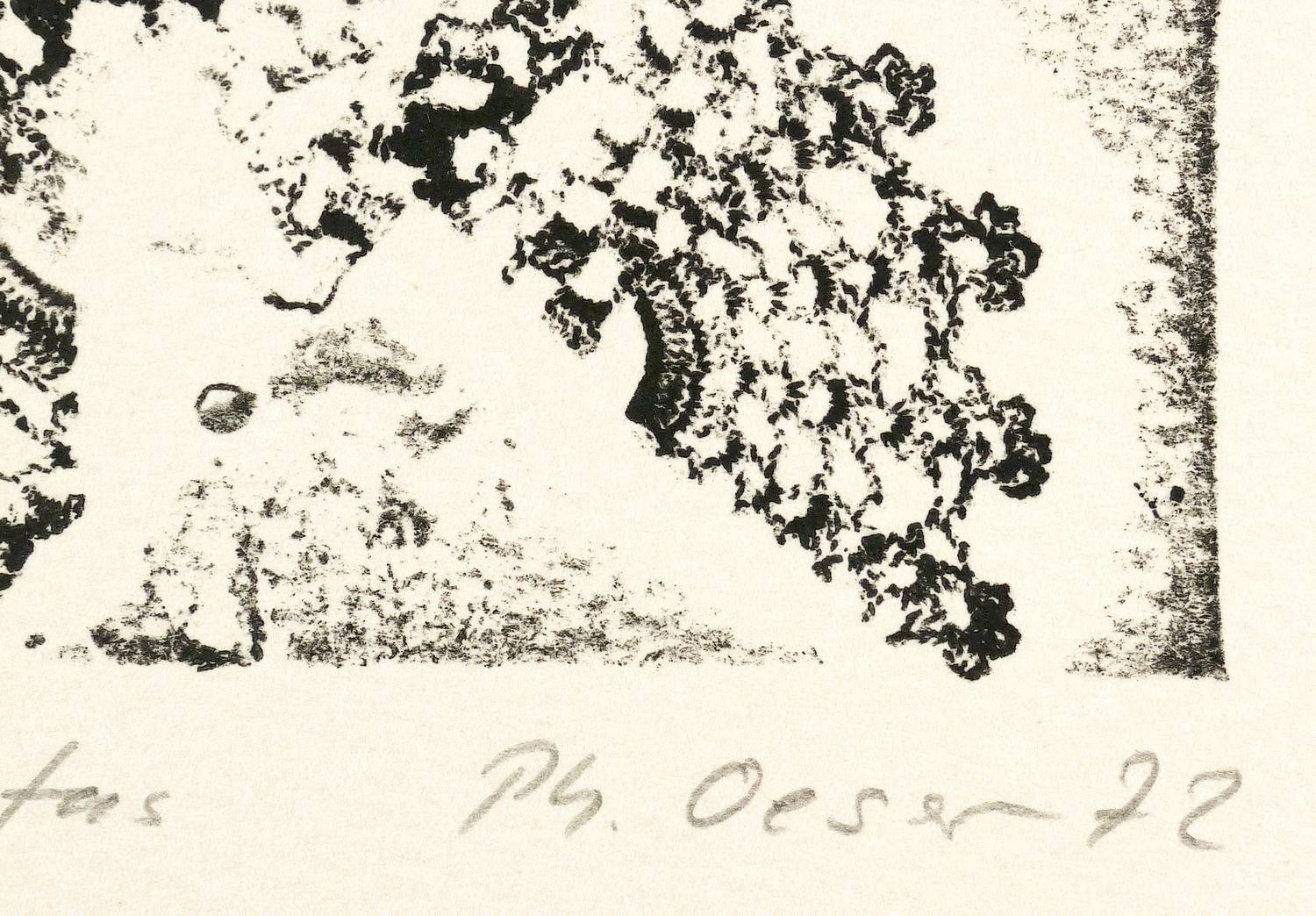 1972. Materialdruck, in Schwarz, auf hartem Maschinenpapier. – Originale Künstlergrafik, von Philip Oeser. – Auflage Exemplar Nr. 35/40. – 24,9 x 13,0 cm (Darstellung / Platte), 42 x 30 cm (Blatt).