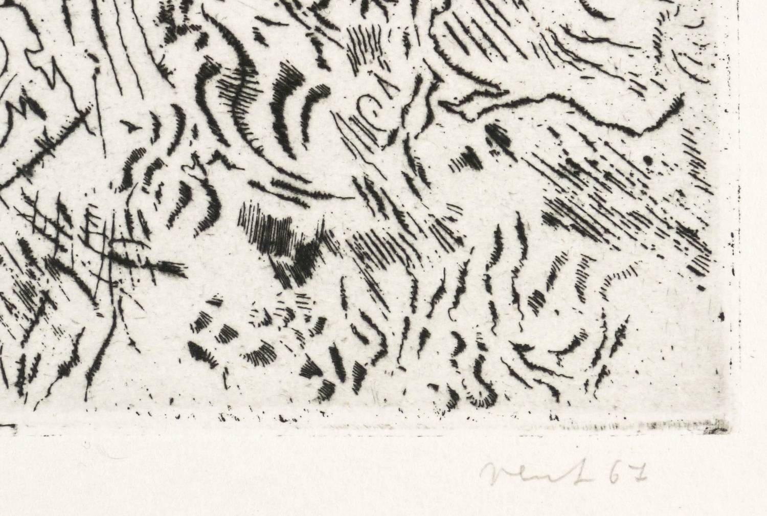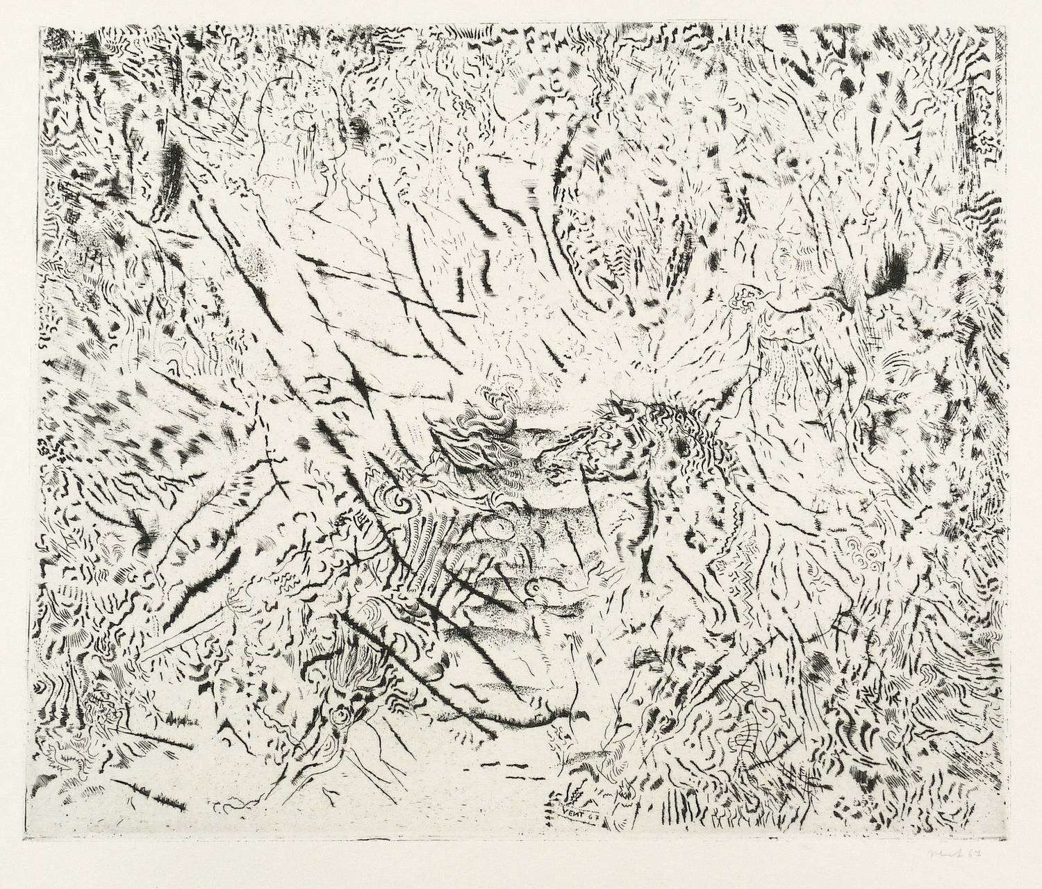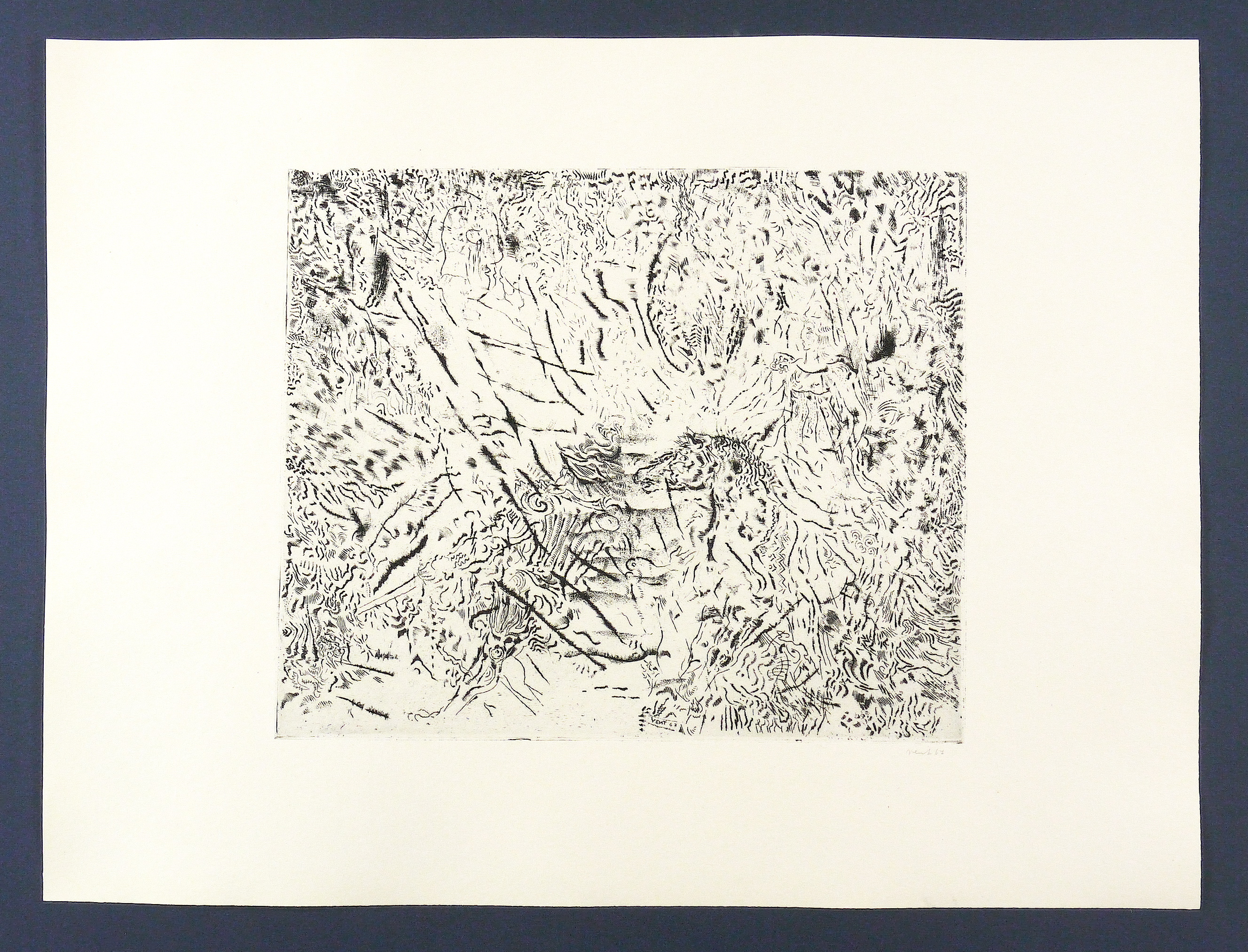 1967. Radierung / Vernis mou & Strichätzung, in Schwarz, auf hellchamois Velin. – Originale Künstlergrafik, von Hans Vent. – Auflage Exemplar Nr. 24/85. – 24,8 x 29,5 cm (Darstellung / Platte), 38 x 50 cm (Blatt).