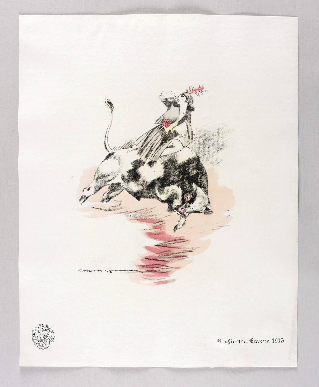 Aus: Krieg und Kunst. Original-Steinzeichnungen der Berliner Sezession (Berlin: Julius Bard 1915). – Nicht handsigniert. Im Stein links unten Signatur und Jahr: ″FINETTI 15″. Im Blattrand rechts unten typografisch bezeichnet: ″G. V. Finetti: Europa 1915″. Links unten Signet der Berliner Secession. – Mit restaurierten leichten Randblessuren, Randriss unten rechts geschlossen. Guter Zustand.