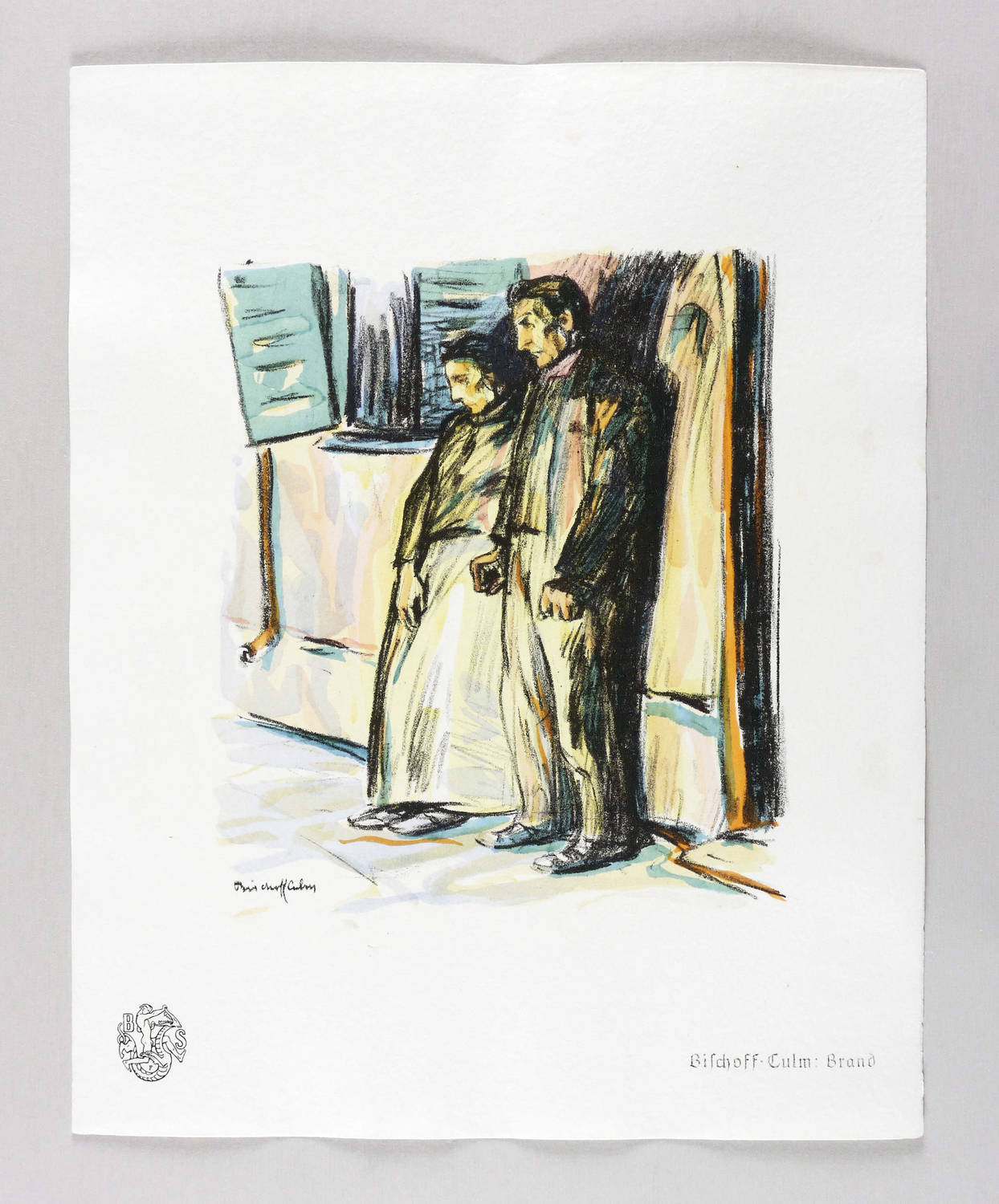 Aus: Krieg und Kunst. Original-Steinzeichnungen der Berliner Sezession (Berlin: Julius Bard 1916). – Nicht handsigniert. Im Stein links unten Signatur: ″Bischoff-Culm″. Im Blattrand rechts unten typografisch bezeichnet: ″Bischoff-Culm: Brand″. Links Vignette der Berliner Secession. – Tadelloser Gesamteindruck. Sehr guter Zustand.