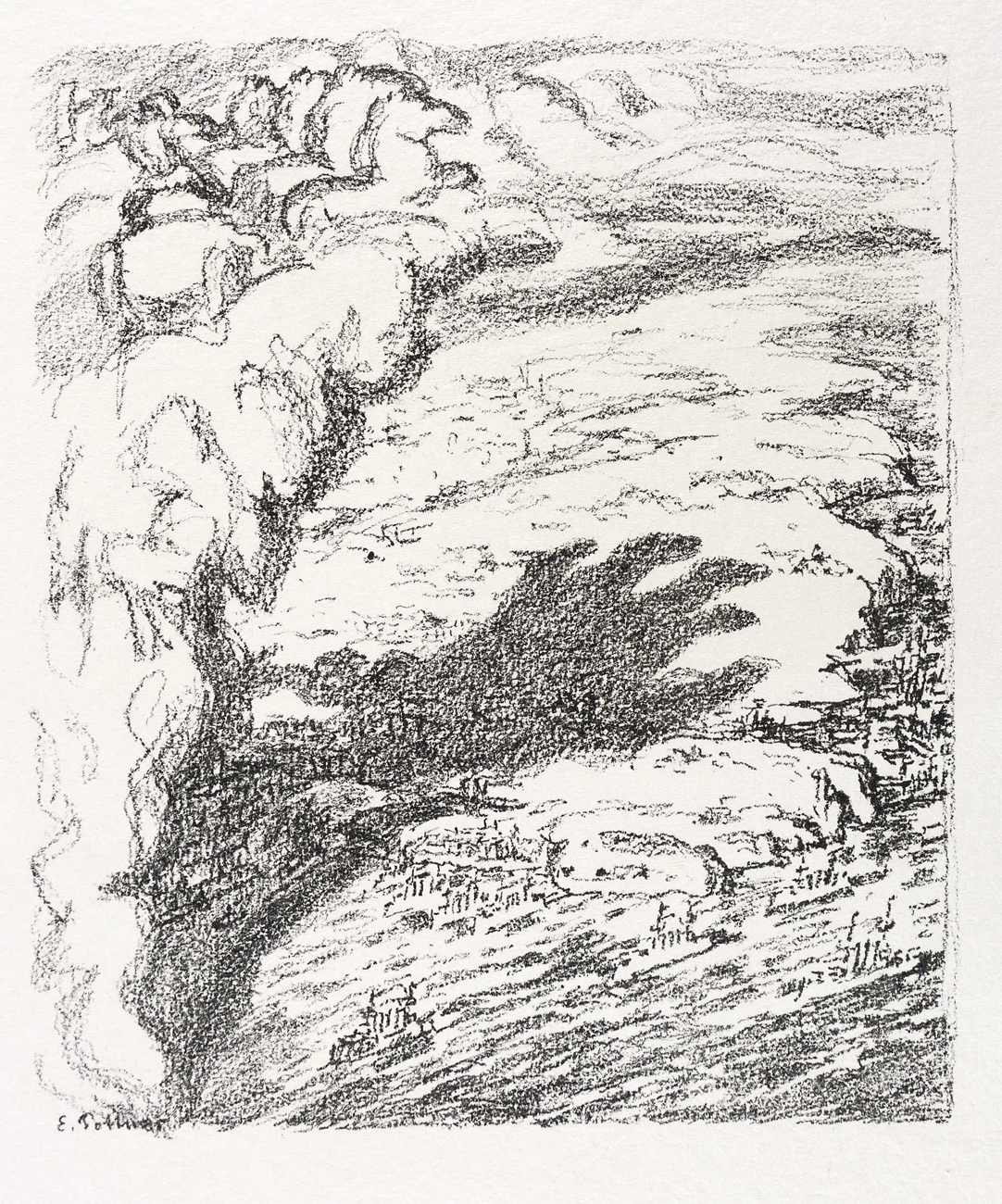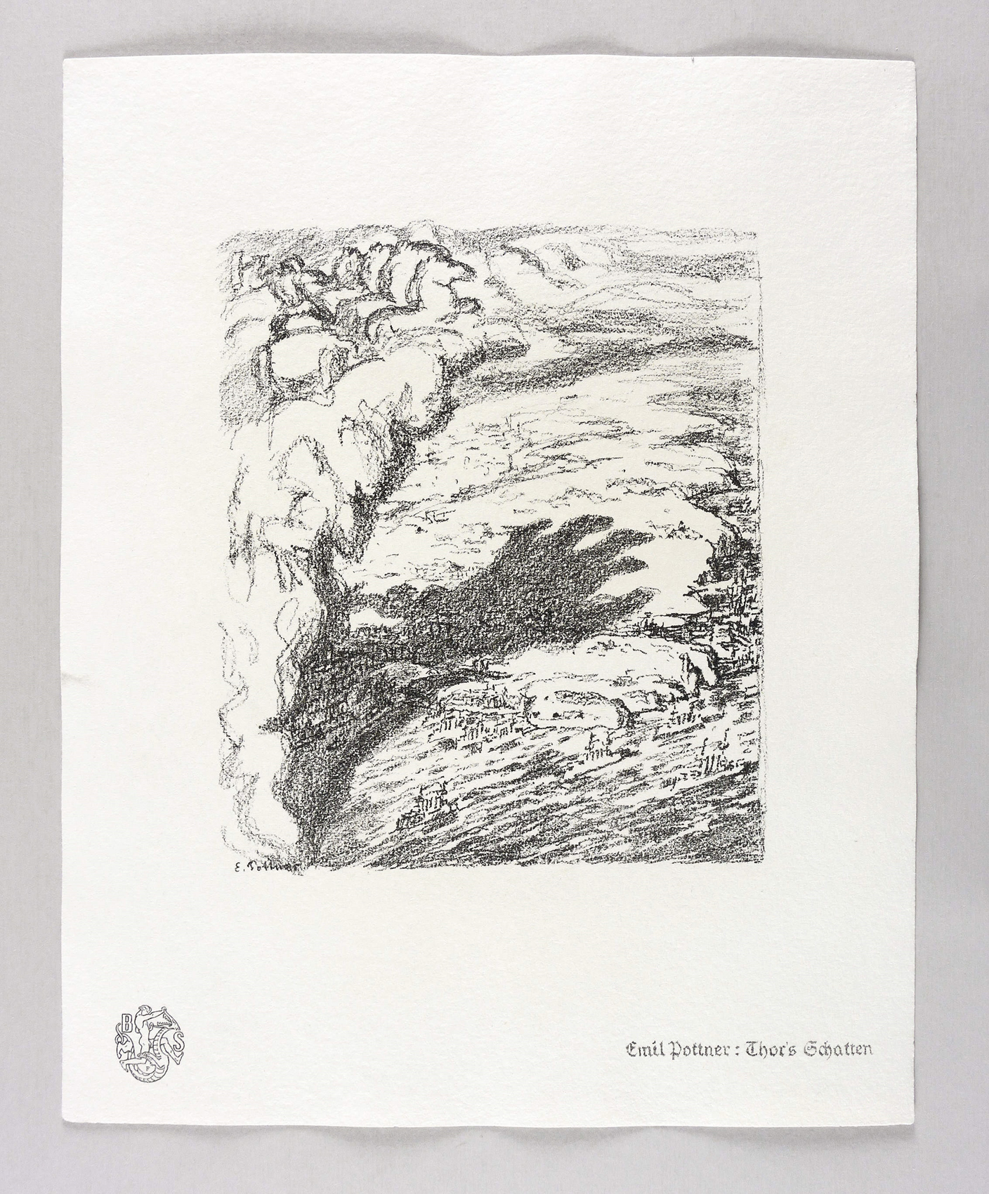 Aus: Krieg und Kunst. Original-Steinzeichnungen der Berliner Sezession (Berlin: Julius Bard 1915). – Nicht handsigniert. Im Stein links unten signiert: ″E. Pottner″. Im Blattrand rechts unten typografisch bezeichnet: ″Emil Pottner: Thor's Schatten″. Links Signet der Berliner Secession. – Unscheinbare Randmängel. Guter Zustand.