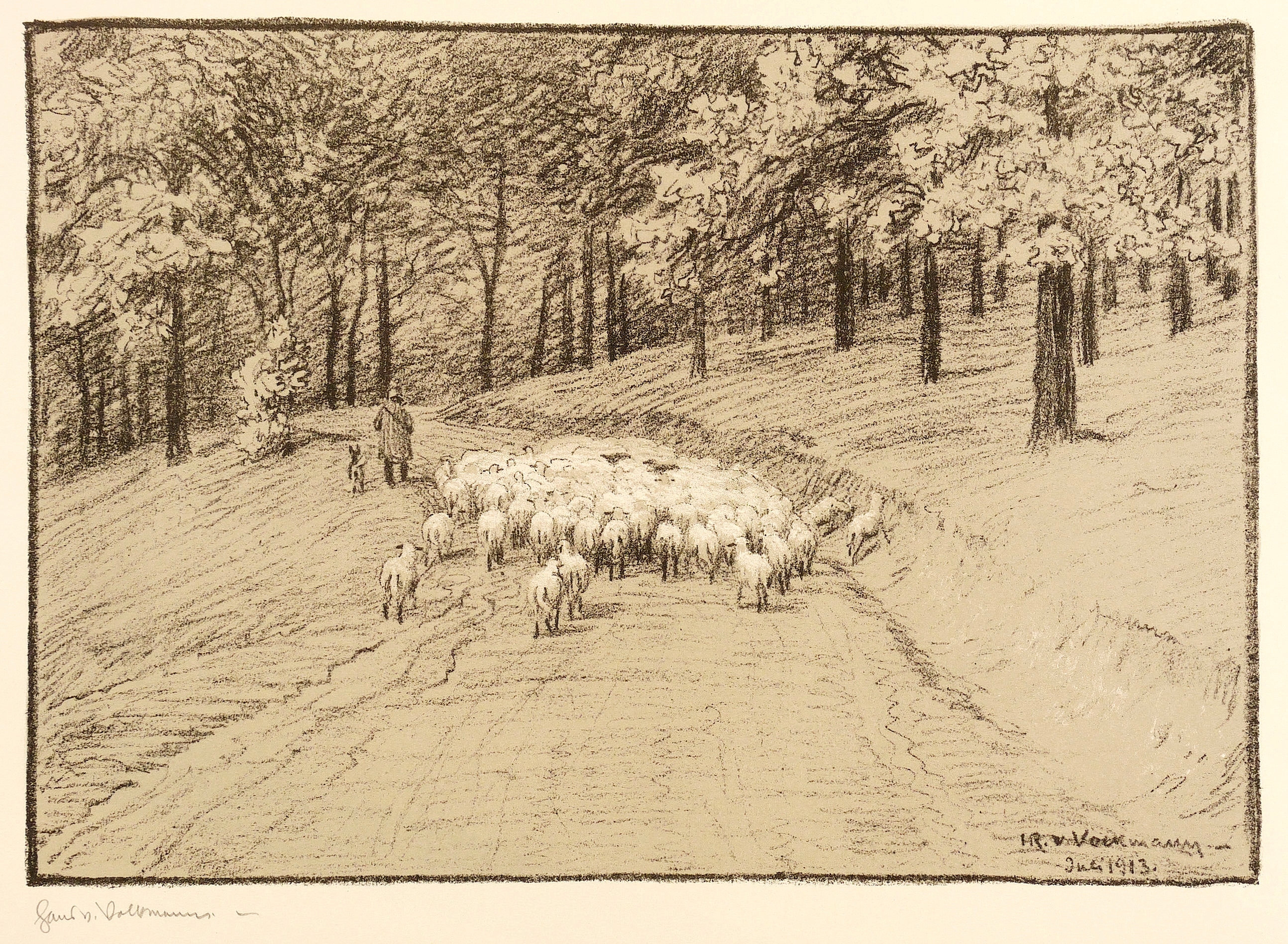 Volkmann, Hans Richard von. – „Schafherde durch den Wald ziehend”.