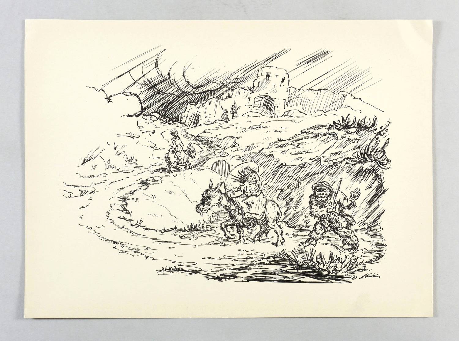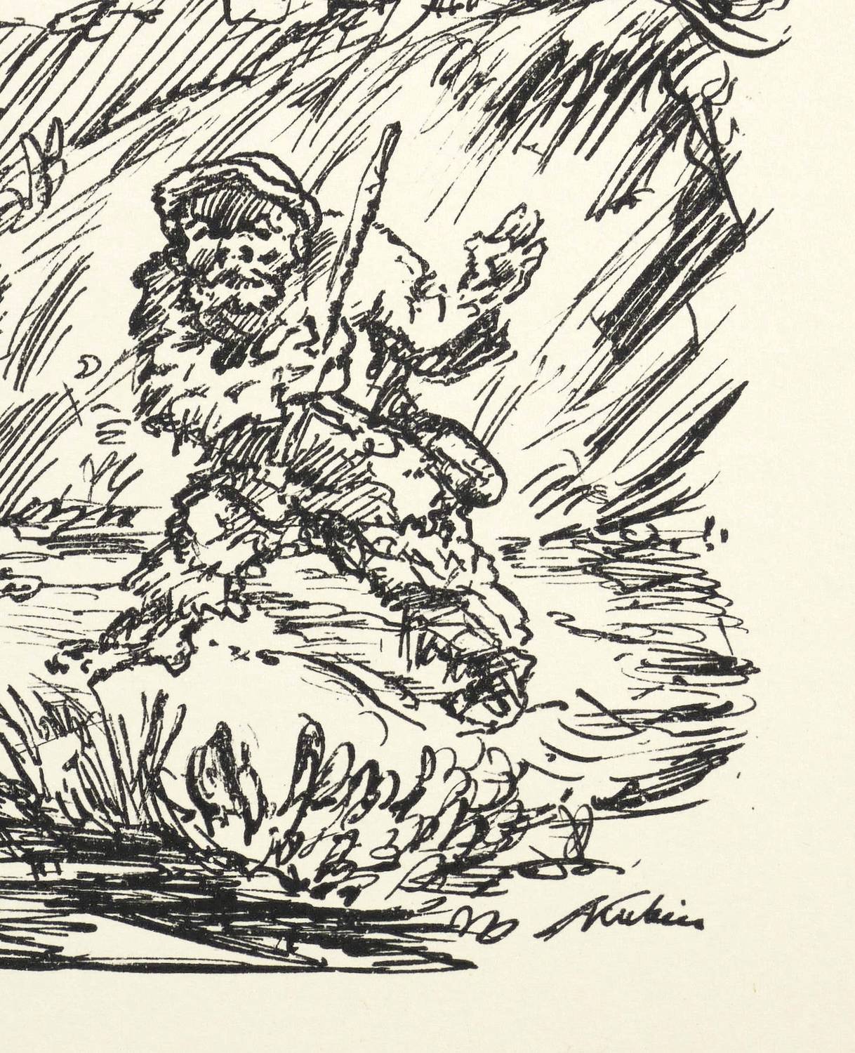 Raabe 126 a (von b). Söhn HDO 108-6. – Aus: Kurt Pfister, Deutsche Graphiker der Gegenwart (Leipzig: Klinkhardt & Biermann 1920). – Nicht handsigniert. Im Stein rechts unten signiert: ″AKubin″. Verso typografisch bezeichnet: ″KUBIN: Auf der Flucht. Originallithographie″. Dazu in Bleistift nummeriert. – Erschienen in einer Auflage von 100 Exemplaren als originalgrafische Beilage zu ″Deutsche Graphiker der Gegenwart″ von Kurt Pfister (Blatt Nr. 8, 1920). – Die Ecken rechts etwas bestoßen. Sonst sehr gut erhaltenes Exemplar.