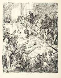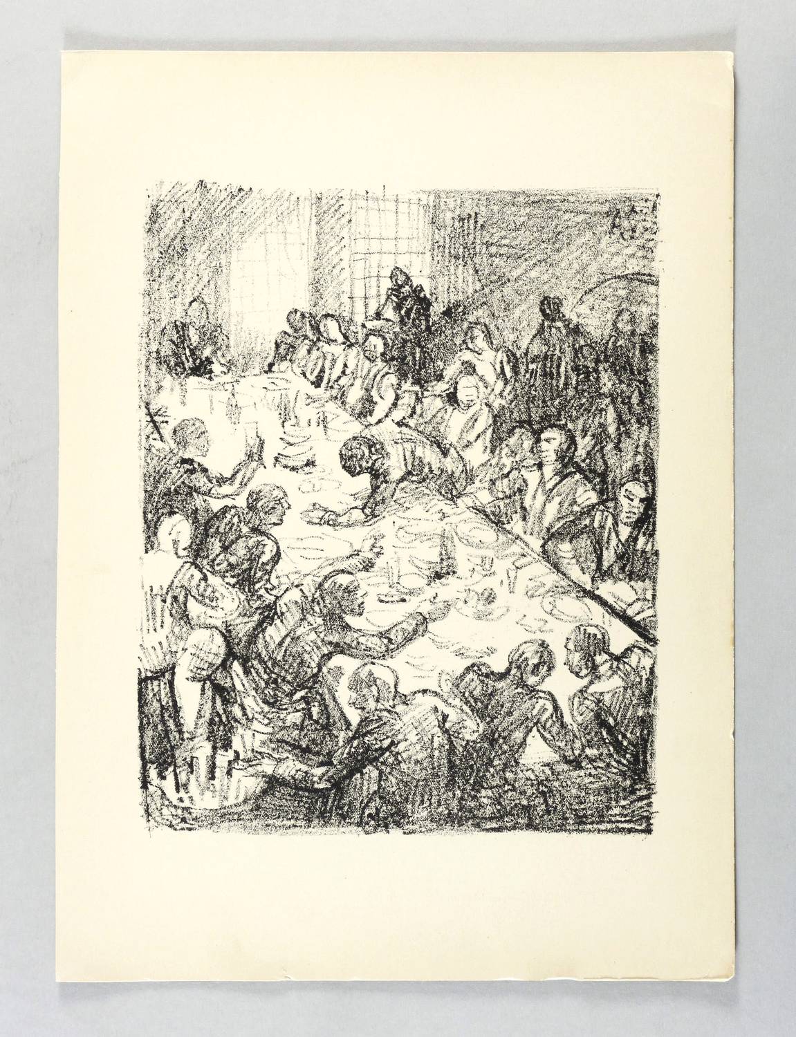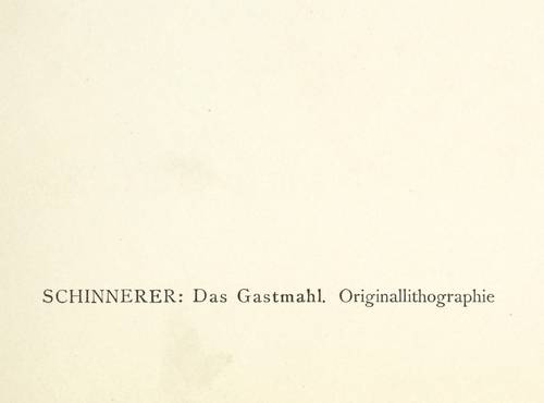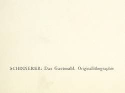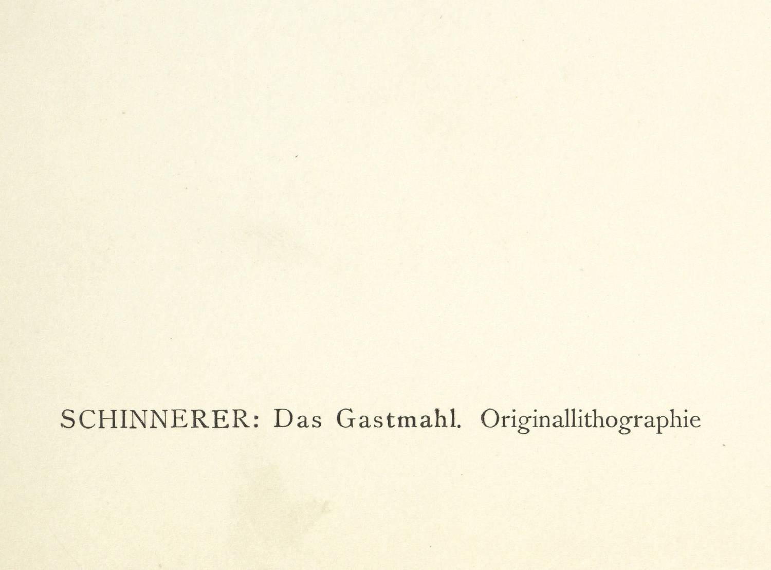 Söhn HDO 108-21. – Aus: Kurt Pfister, Deutsche Graphiker der Gegenwart (Leipzig: Klinkhardt & Biermann 1920). – Nicht handsigniert. Im Stein rechts oben signiert mit Monogramm: ″AS″. Verso typografisch bezeichnet: ″SCHINNERER: Das Gastmahl. Originallithographie″. Dazu in Bleistift nummeriert. – Erschienen in einer Auflage von 100 Exemplaren als originalgrafische Beilage zu ″Deutsche Graphiker der Gegenwart″ von Kurt Pfister (Blatt Nr. 28, 1920). – Im Rand leicht gegilbt. Unten winziger Randriss. Ecken und Blattkanten etwas bestoßen. Insgesamt mäßig guter Zustand.