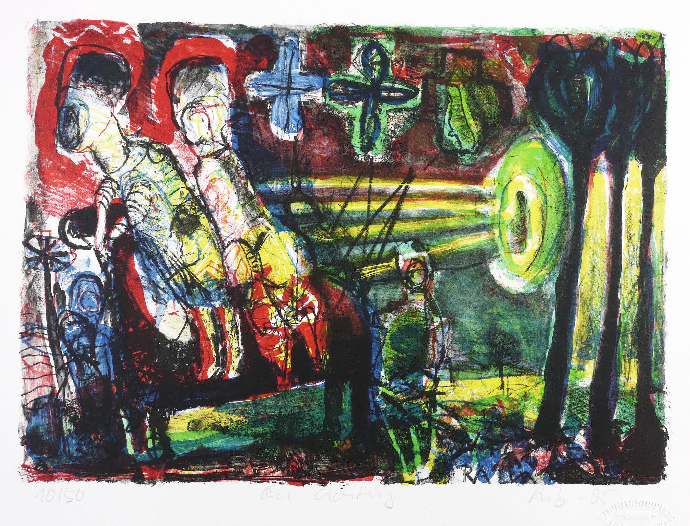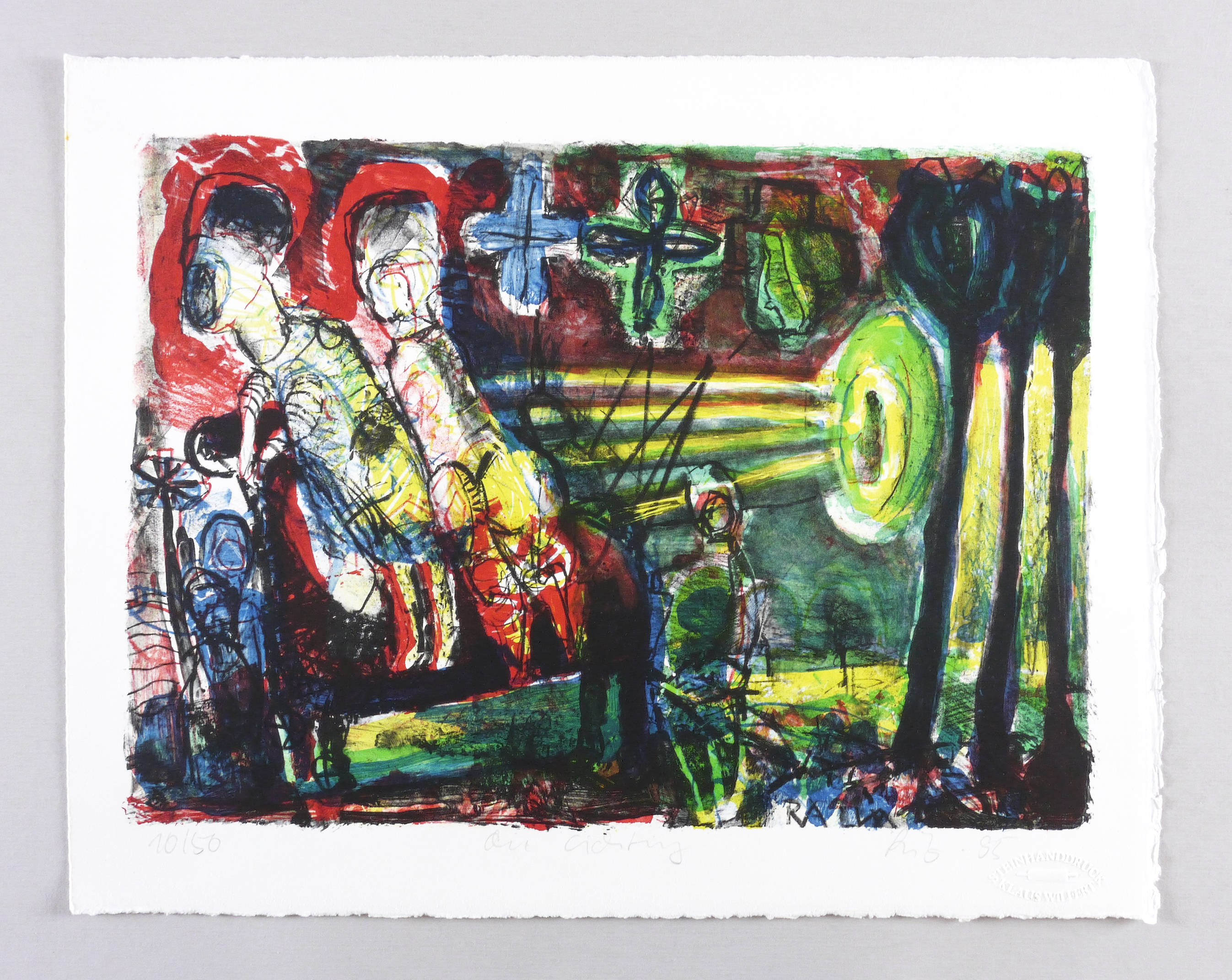 1995. Farblithografie / Pinsel- & Kreidelithografie, in 5 Farben, auf hellchamois Bütten. – Originale Künstlergrafik, von Werner Liebmann. – Auflage Exemplar Nr. 10/50. – 28,0 x 39,4 cm (Darstellung), 35 x 45 cm (Blatt).