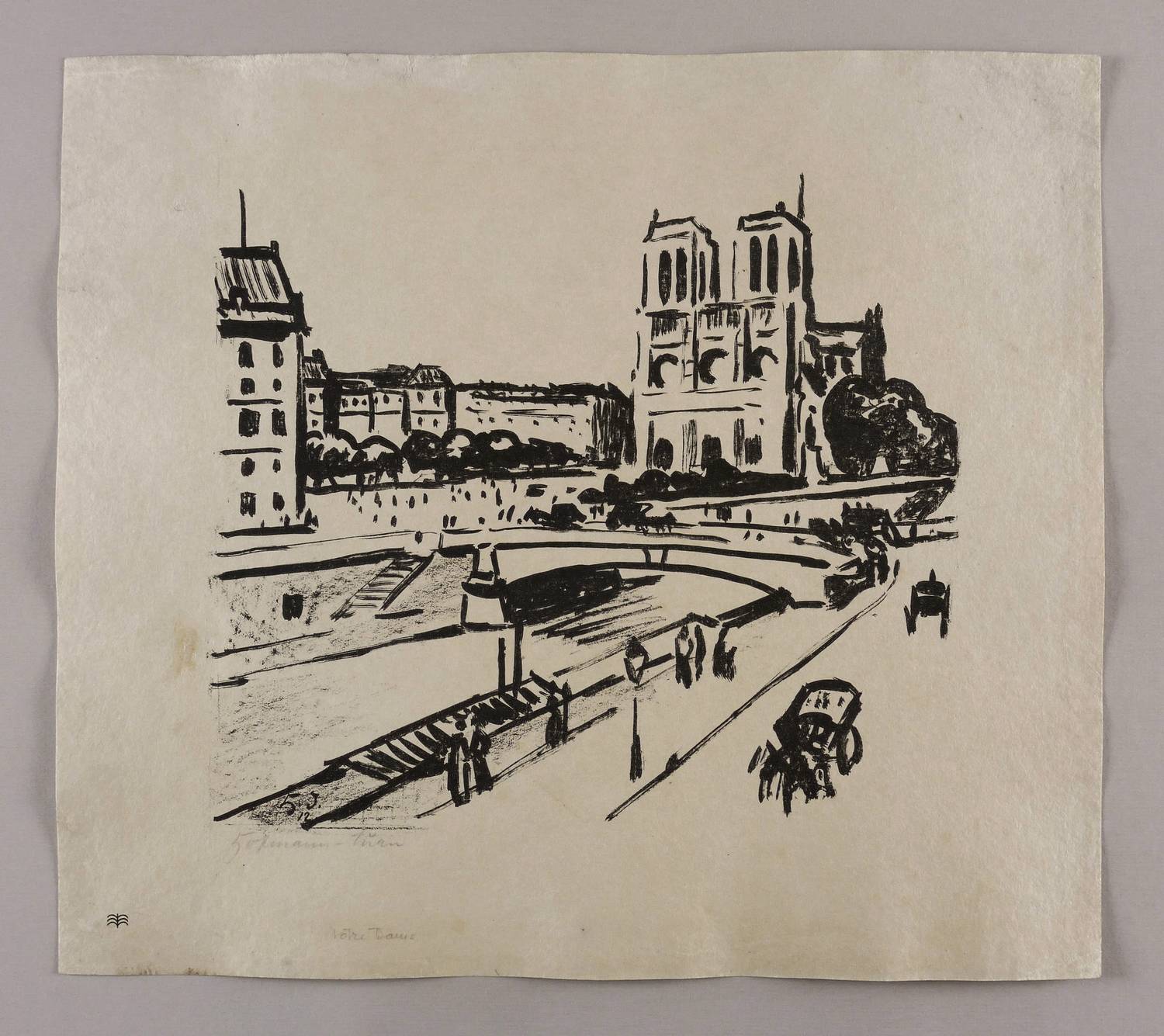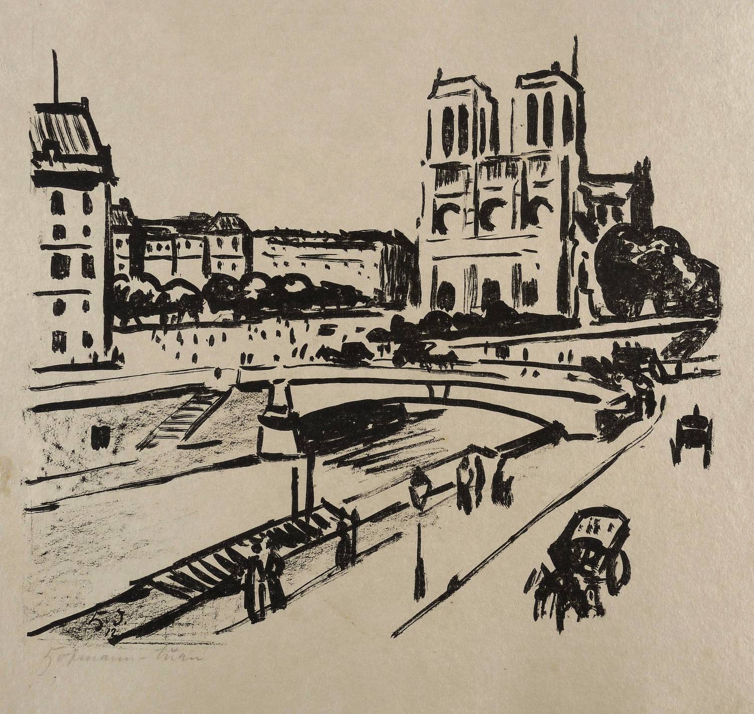 Höper-Kaufmann 14 A.1. Söhn HDO 355-6. – Aus: Sema. 15 Originalsteinzeichnungen (München: Delphin-Verlag 1912). – Links unten in Bleistift signiert: ″Hofmann-Juan″. Darunter bezeichnet: ″Notre Dame″. Im Stein links unten Signatur und Jahr: ″H.J. 12″. In der Blattecke links unten Signet der Künstlervereinigung Sema. – Blatt Nr. 6 aus der berühmten Grafik-Mappe der Münchner Künstlervereinigung Sema ″15 Originalsteinzeichnungen″ (München: Delphin-Verlag 1912), eine der ersten modernen Grafik-Editionen und Mappenwerke. Noch vor dem Blauen Reiter schlossen sich 1911 u.a. Paul Klee, Max Oppenheimer, Alfred Kubin und Egon Schiele zur Vereinigung der Sema (von griechisch ″Zeichen″) zusammen und publizierten 1912 diese Mappe. – Leichte Randmängel. Blattkanten etwas angestaubt. Mäßig guter Zustand.