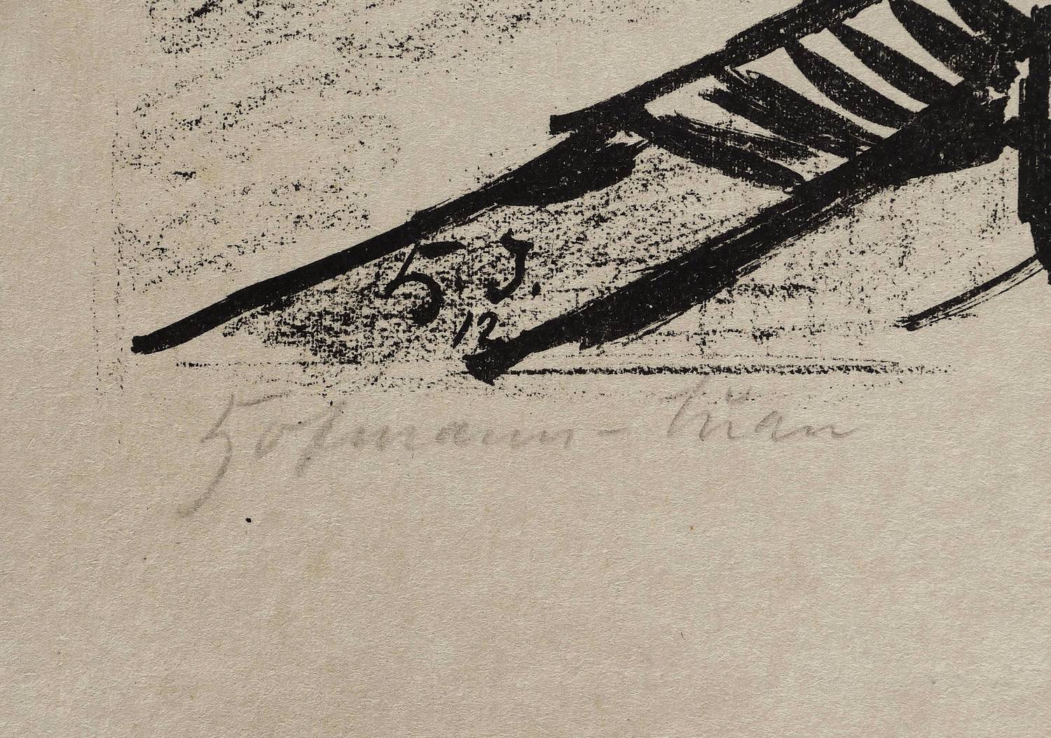 1912. Lithografie / Pinsellithografie, in Schwarz, auf wolkigem graugelbem Velinkarton. – Originale Künstlergrafik, von Fritz Max Hofmann-Juan. – 28,5 x 32,4 cm (Darstellung / Druckbild), 40 x 45 cm (Blatt).