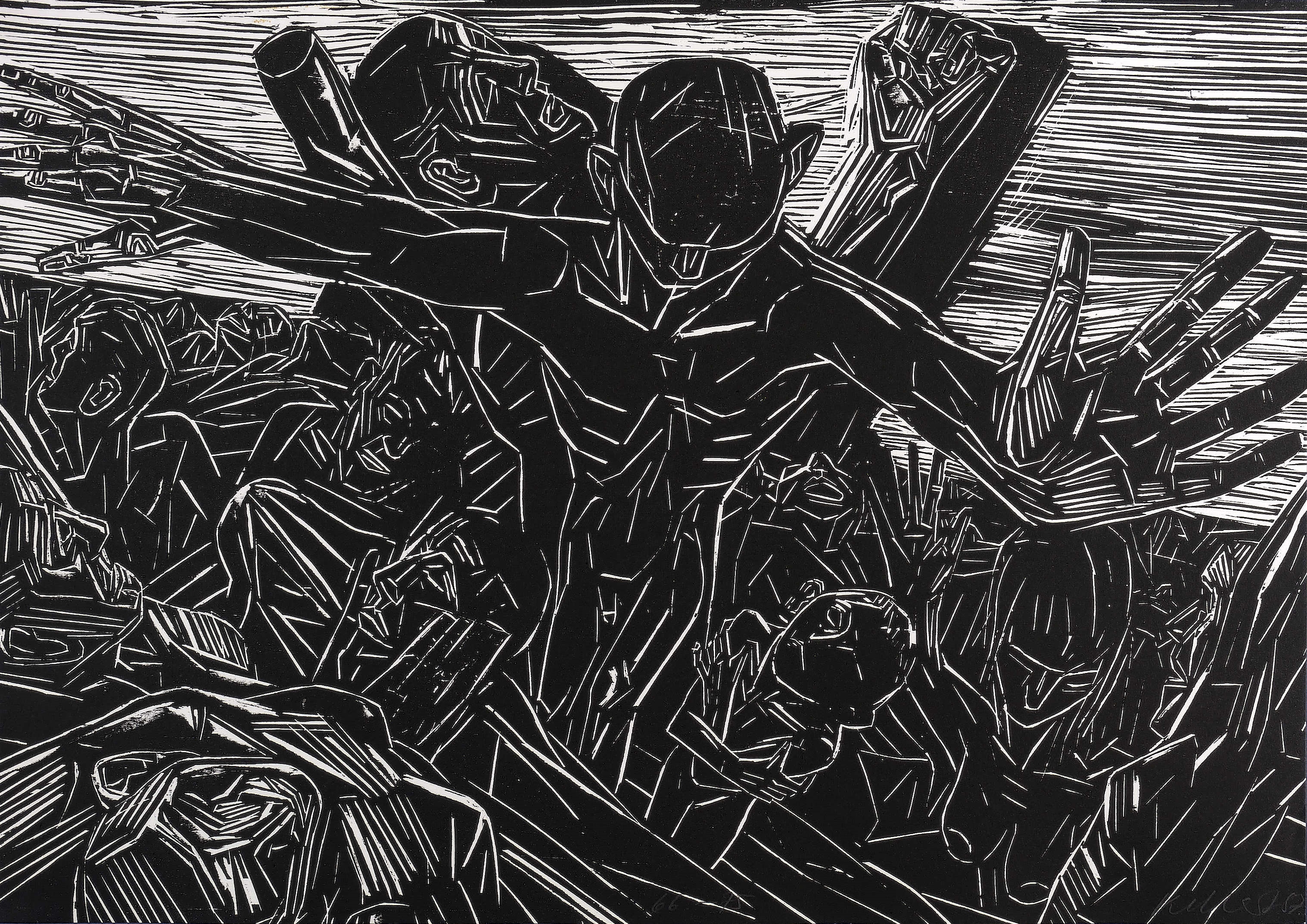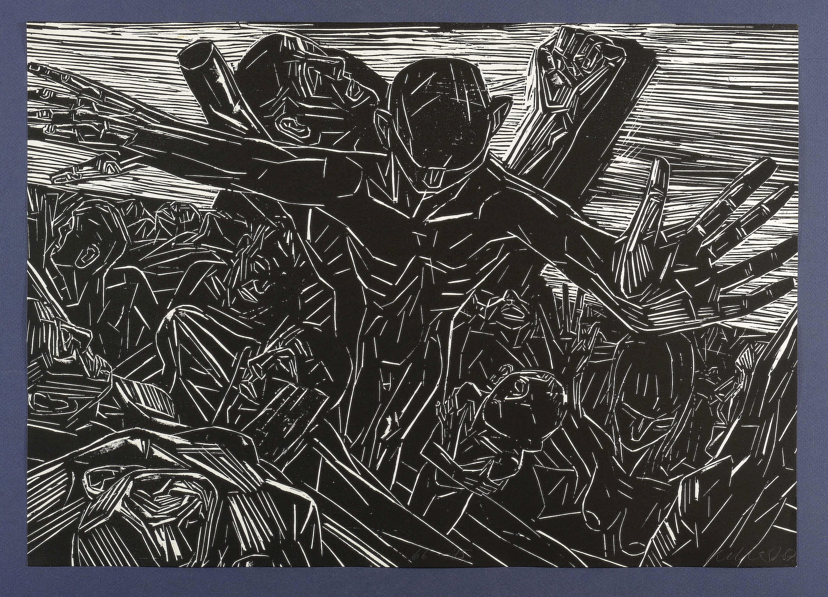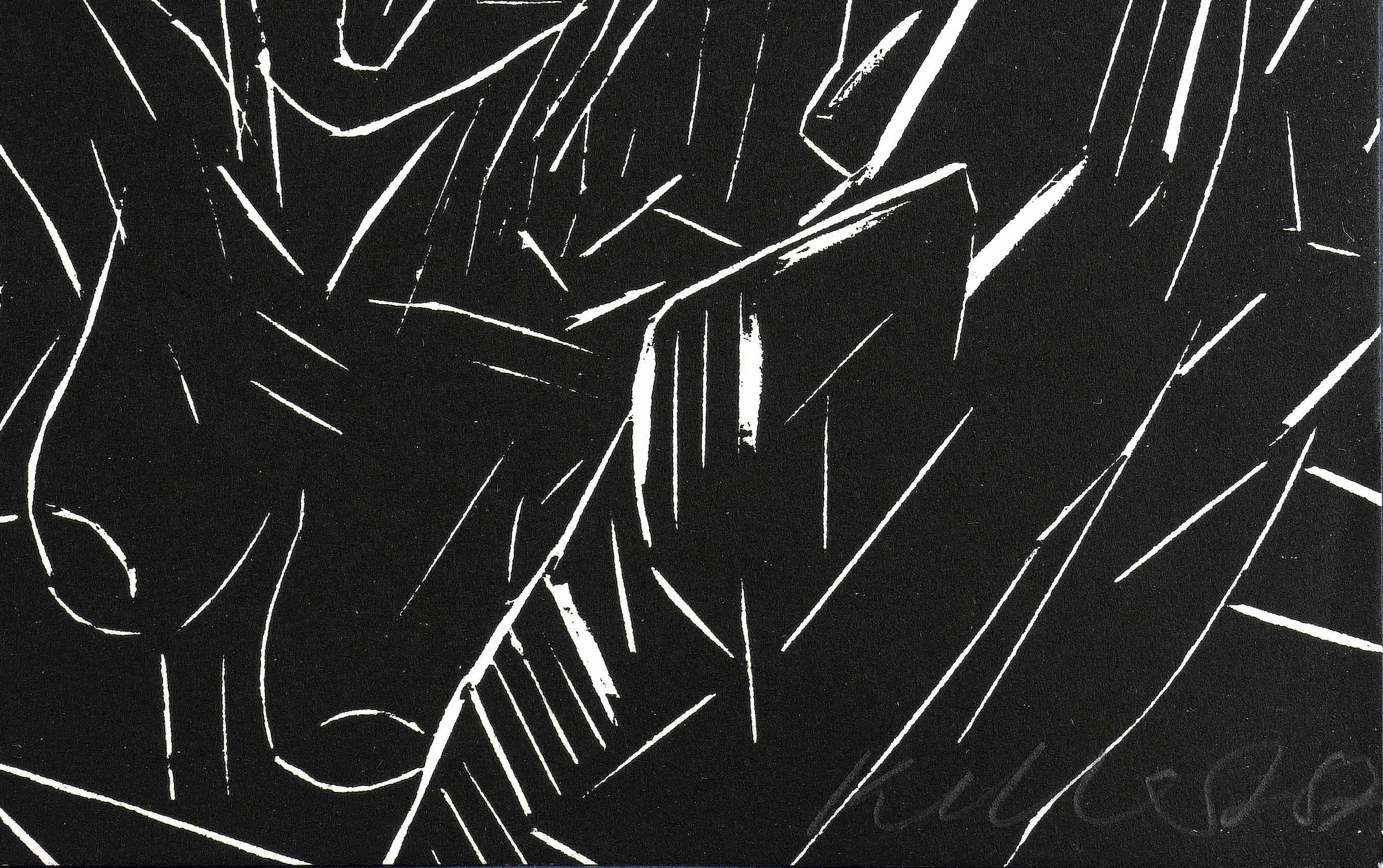1987. Holzschnitt, in Schwarz, auf hellgelbem Karton. – Von Rolf Kuhrt. – Auflage Exemplar Nr. 66/75. – 39,3 x 55,5 cm (Darstellung / Blatt).