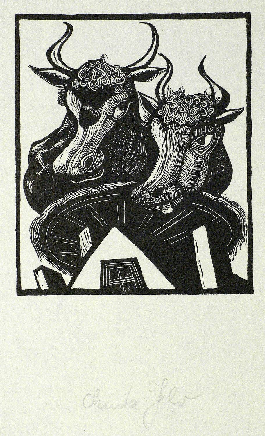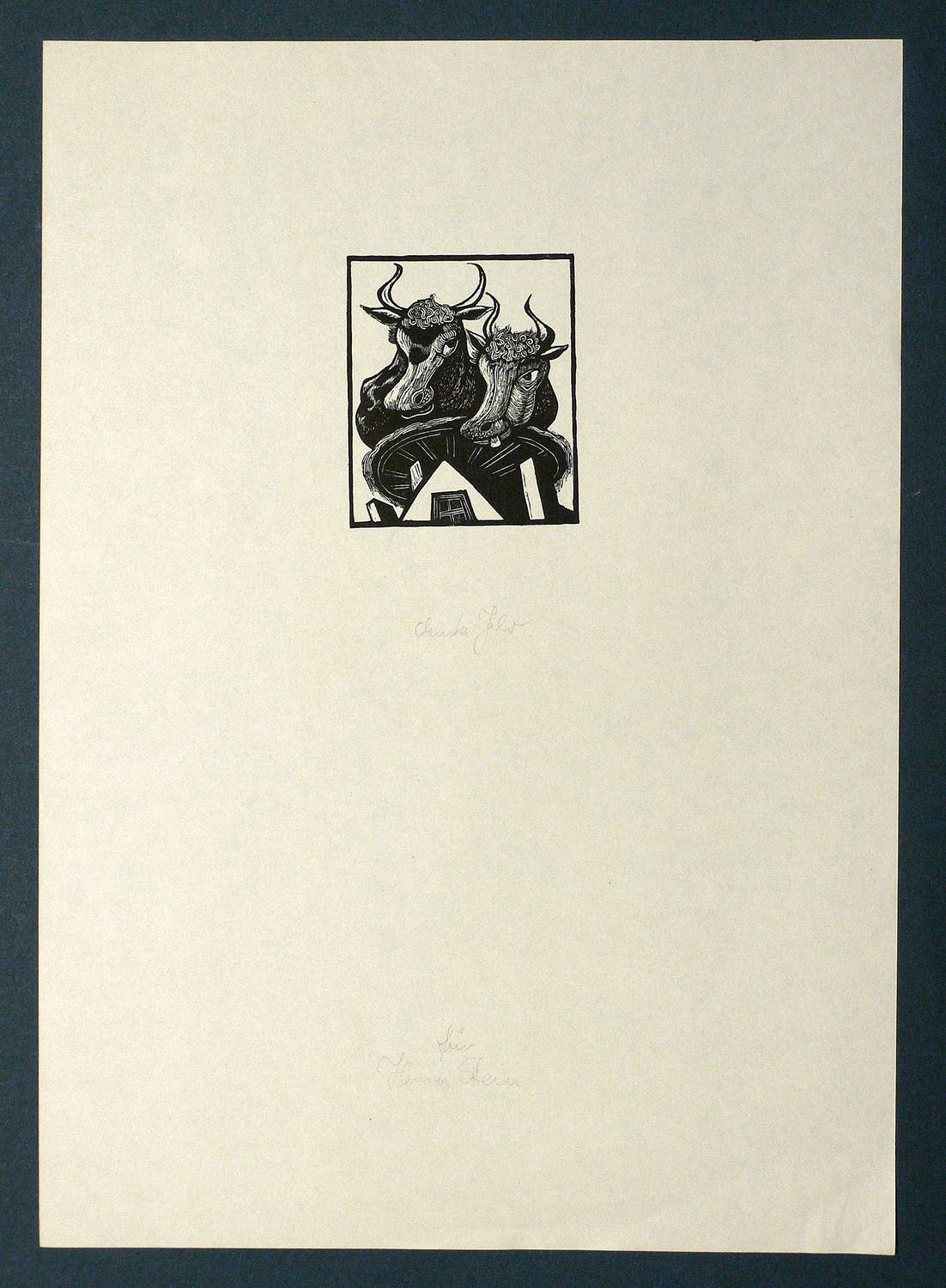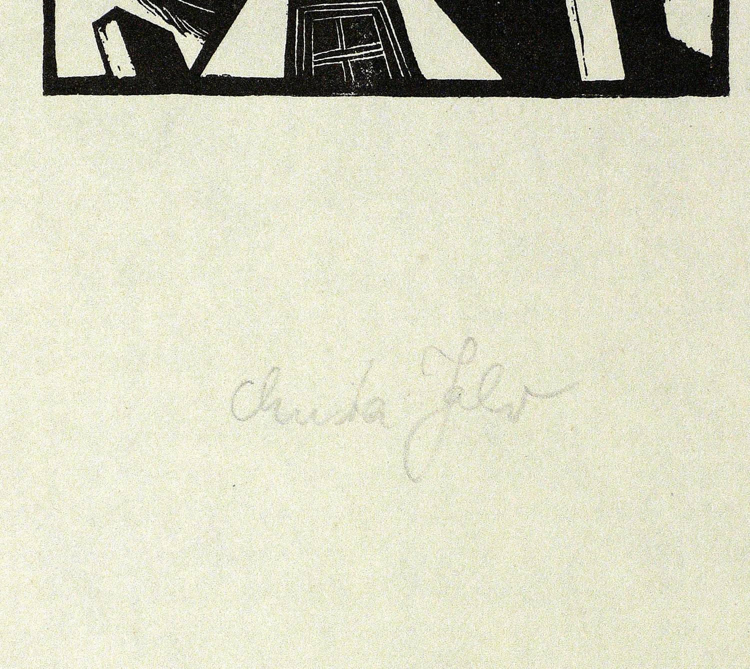 Um 1970. Holzschnitt, in Schwarz, auf hellem Velin. – Originale Künstlergrafik, von Christa Jahr. – 6,6 x 5,5 cm (Darstellung / Druckbild), 30 x 21 cm (Blatt).