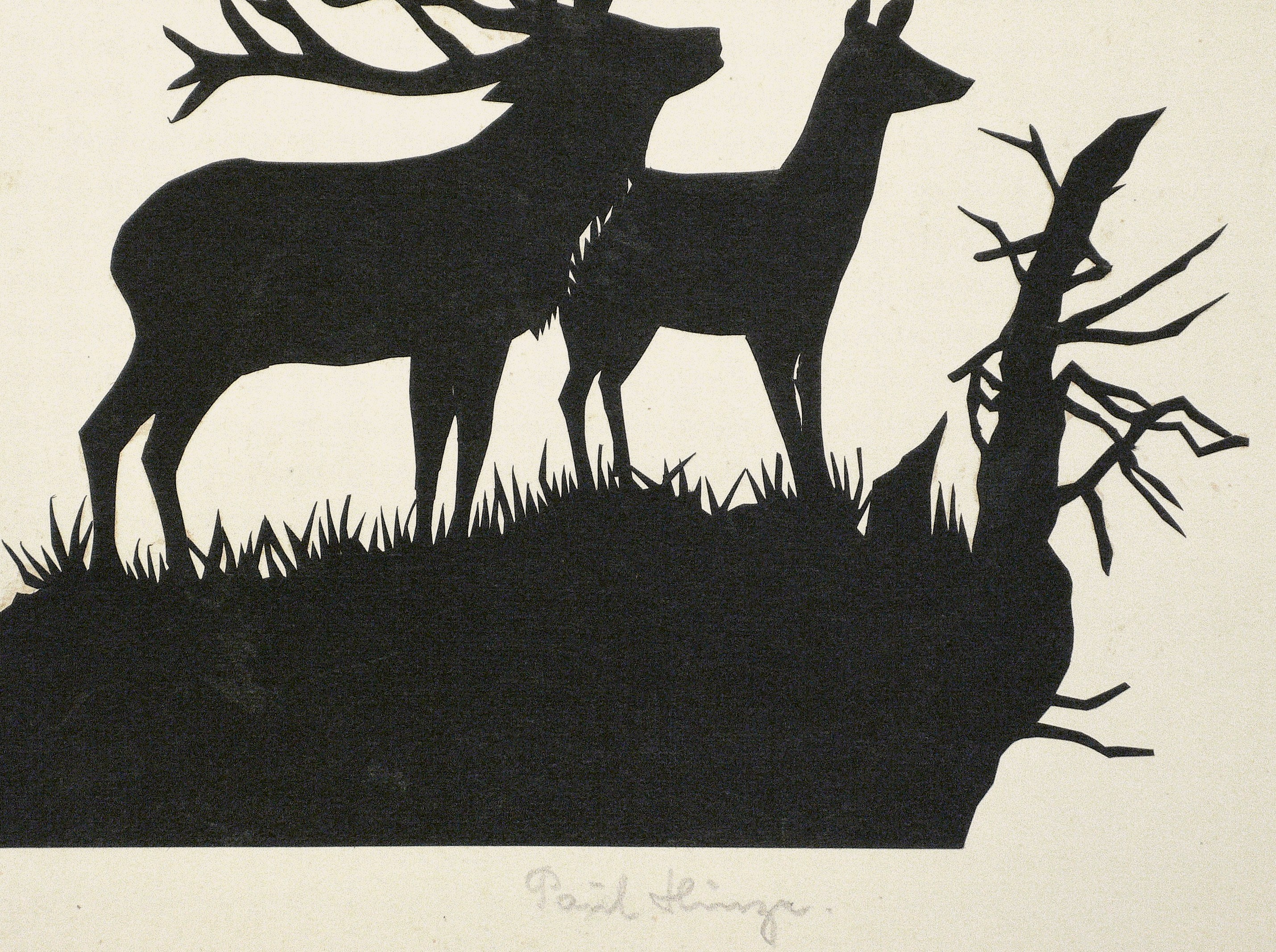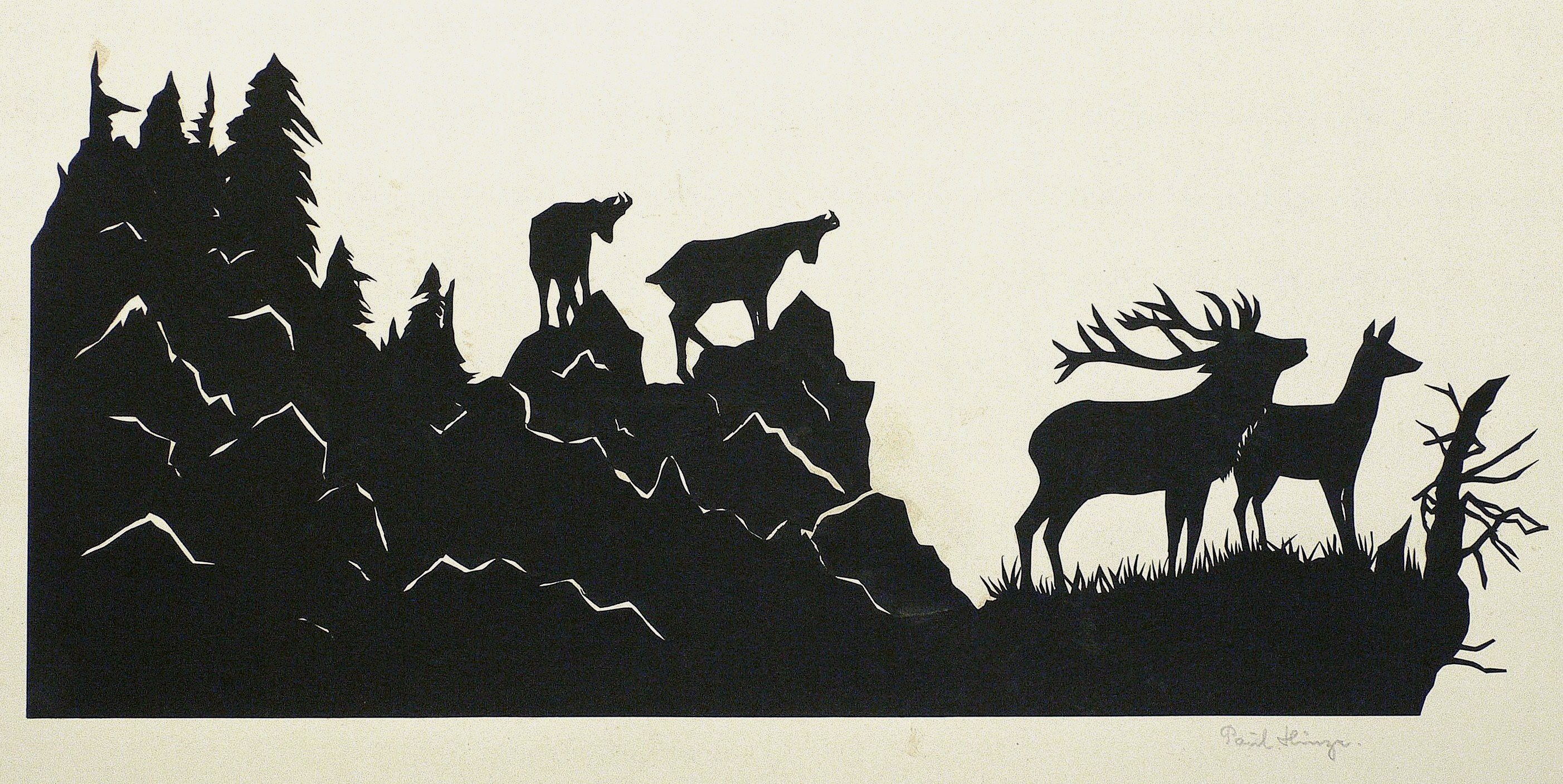 Um 1930. Scherenschnitt, in Schwarz, auf weißem Grund. – Originale Künstlergrafik, von Paul Hinze. – 17,5 x 40,0 cm (Darstellung), 30 x 50 cm (Blatt).