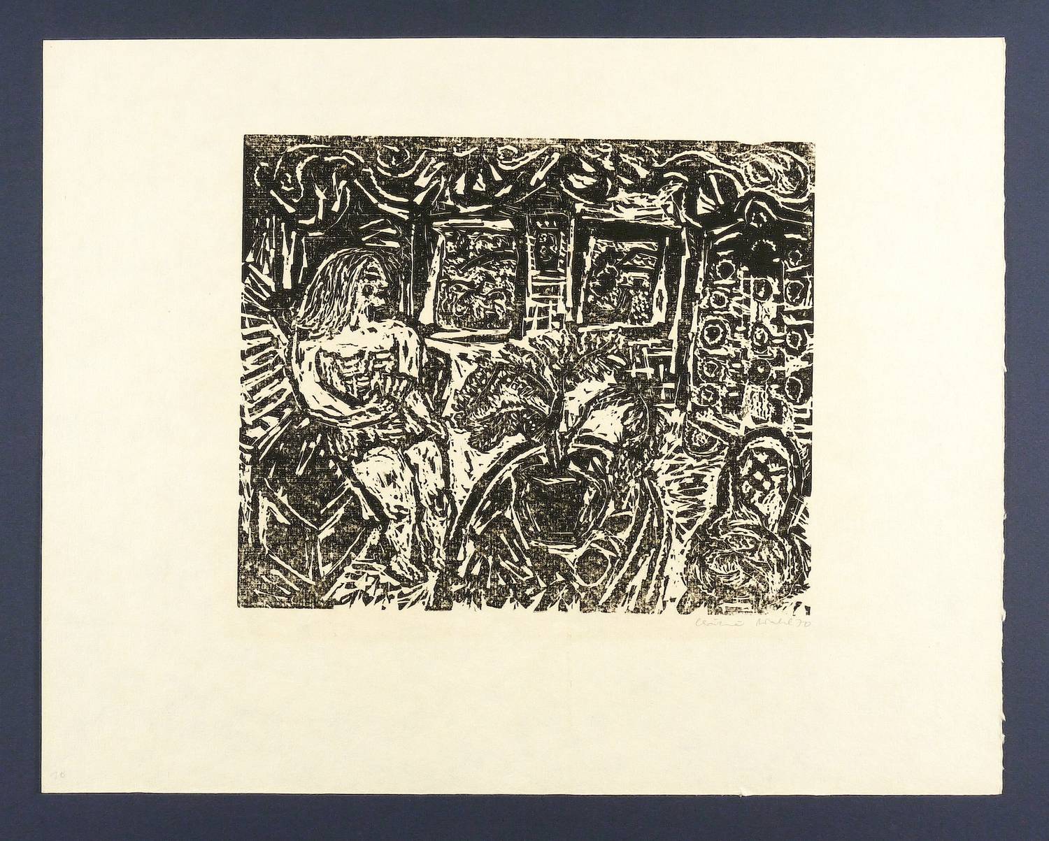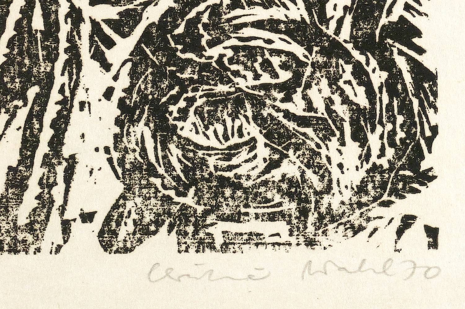 1970. Holzschnitt, in Schwarz, auf hellchamois Velin. – Originale Künstlergrafik, von Christine Wahl. – Auflage Exemplar Nr. 10/100. – 24,7 x 29,9 cm (Darstellung), 40 x 50 cm (Blatt).