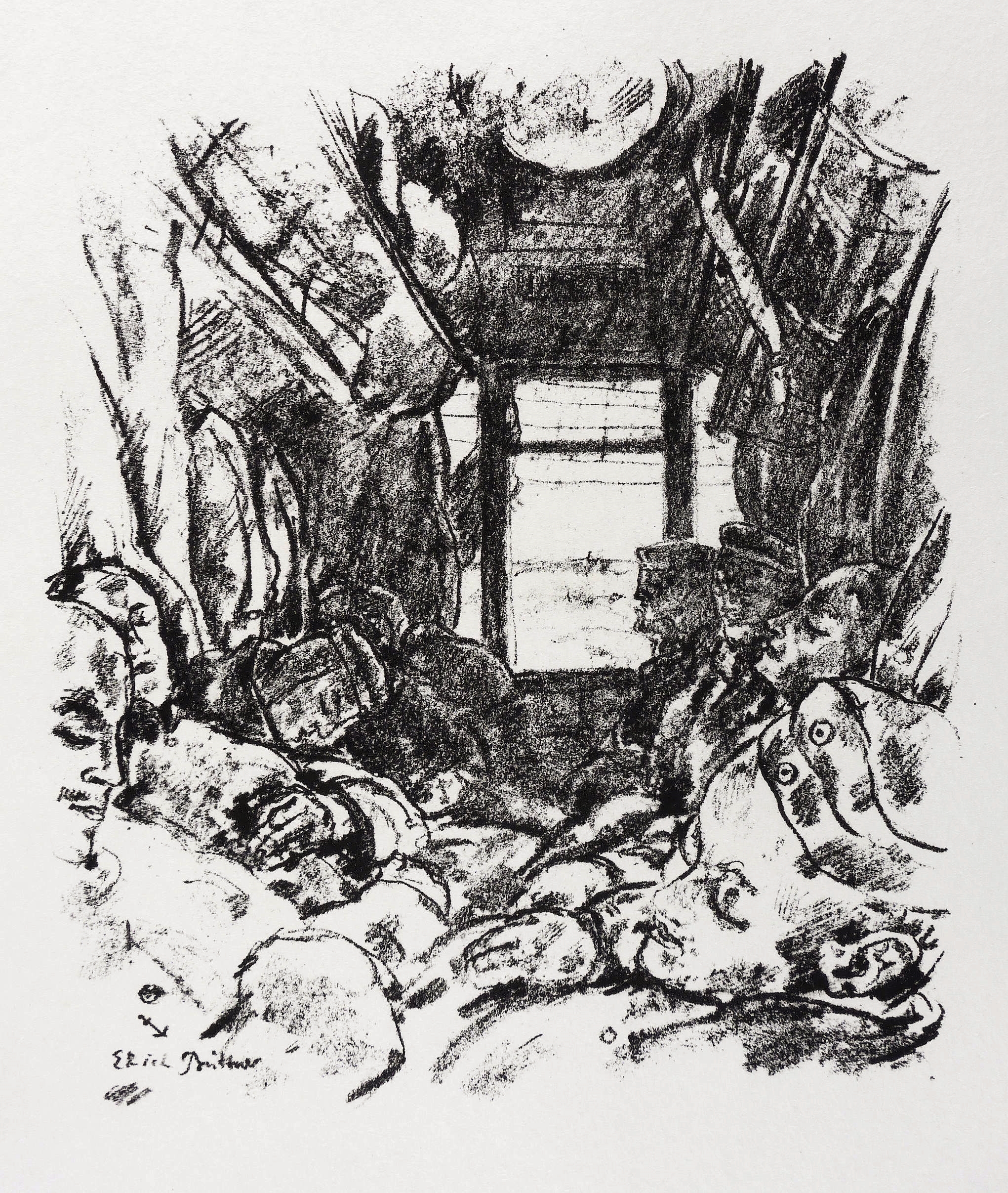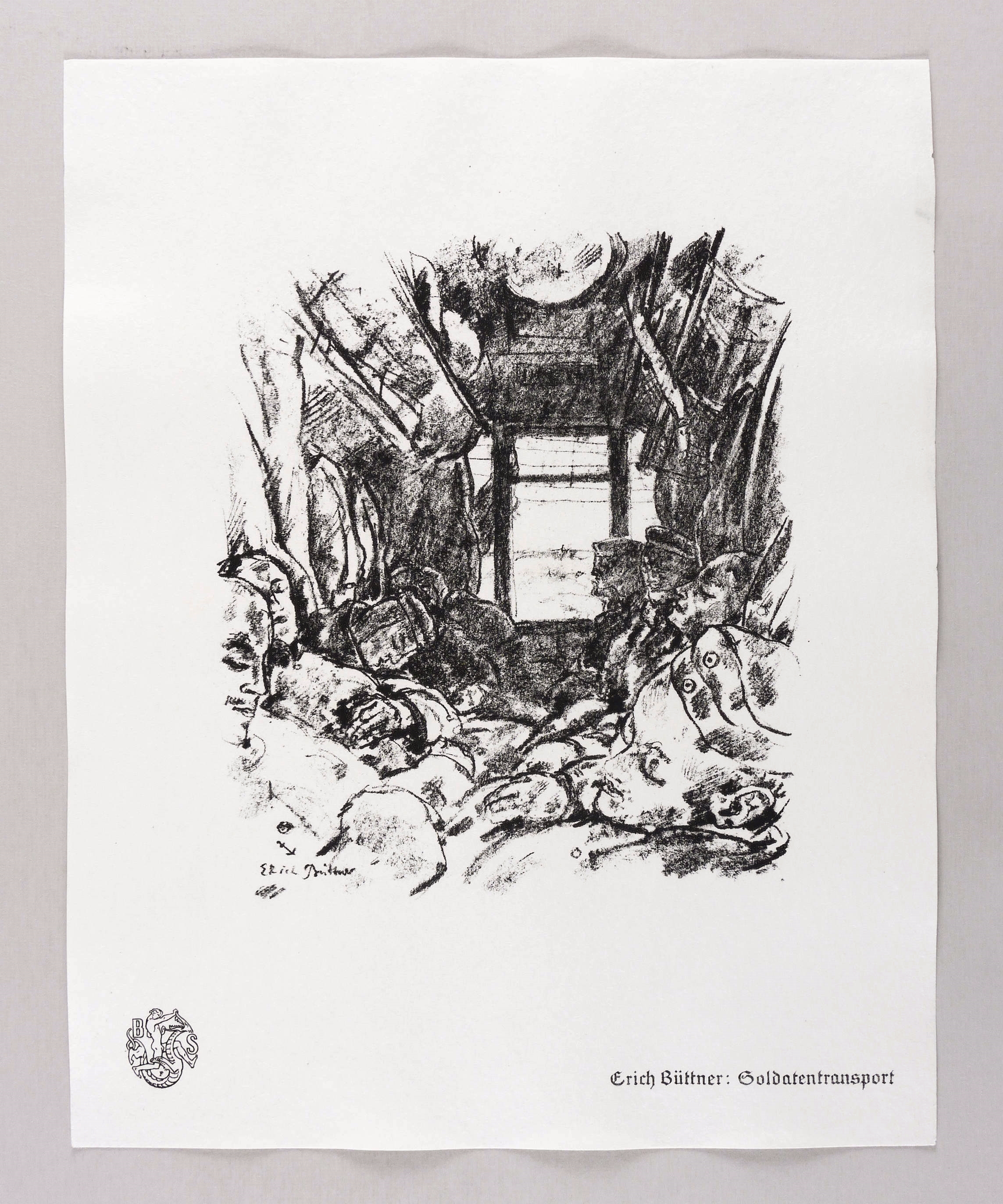 Aus: Krieg und Kunst. Original-Steinzeichnungen der Berliner Sezession (Berlin: Julius Bard 1917). – Nicht handsigniert. Im Stein links unten signiert: ″Erich Büttner″. Außerhalb des Steins rechts unten typografisch bezeichnet und betitelt: ″Erich Büttner: Soldatentransport″. Links unten Vignette der Berliner Sezession. – Originalrandiges Exemplar. Sehr guter Zustand.
