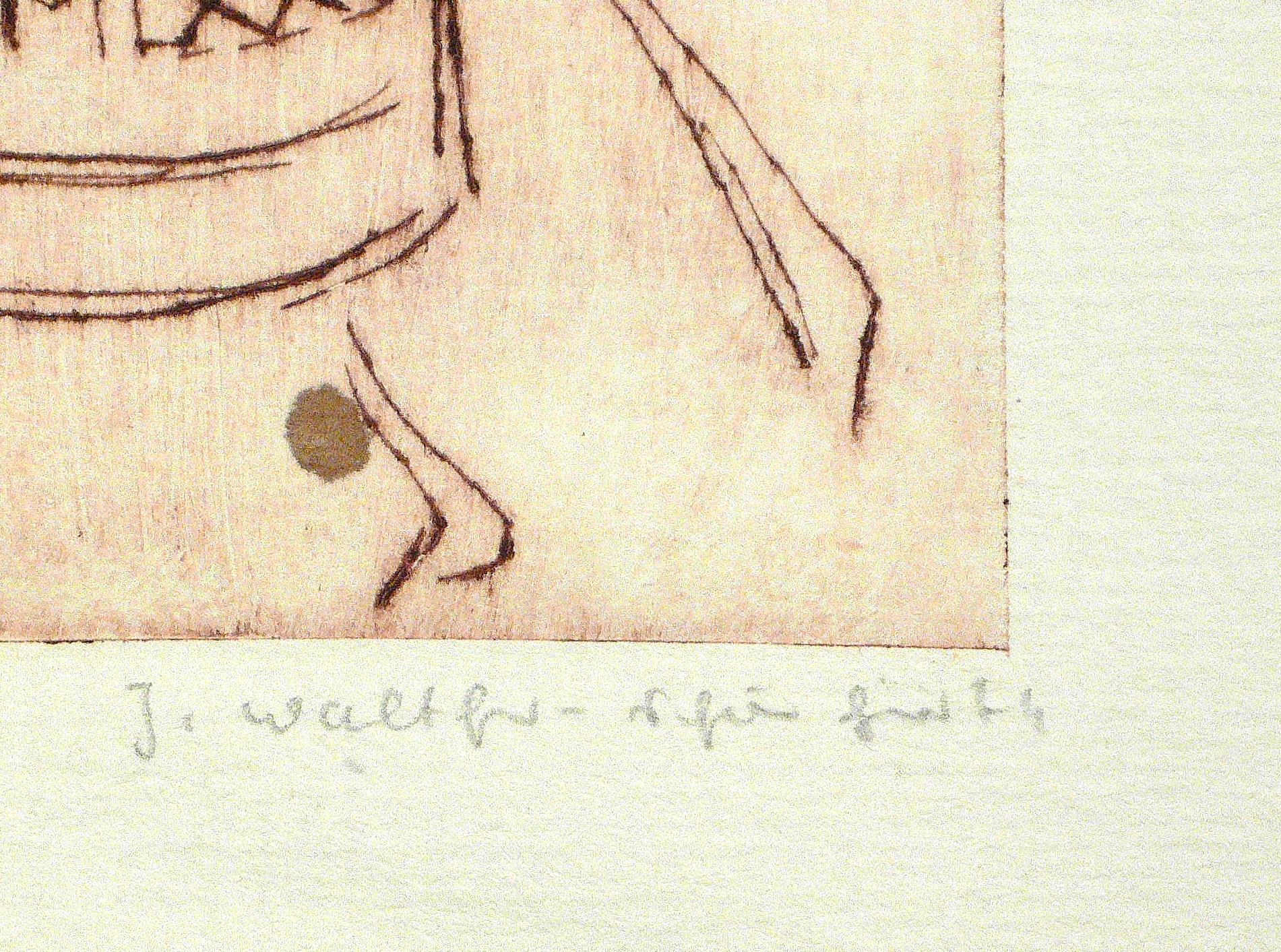 1974. Radierung / Kaltnadel, in Rotbraun, auf hellgelbem Velin. – Originale Künstlergrafik, von Jutta Walther-Schönherr. – 12,4 x 9,4 cm (Darstellung / Platte), 19 x 13 cm (Blatt).