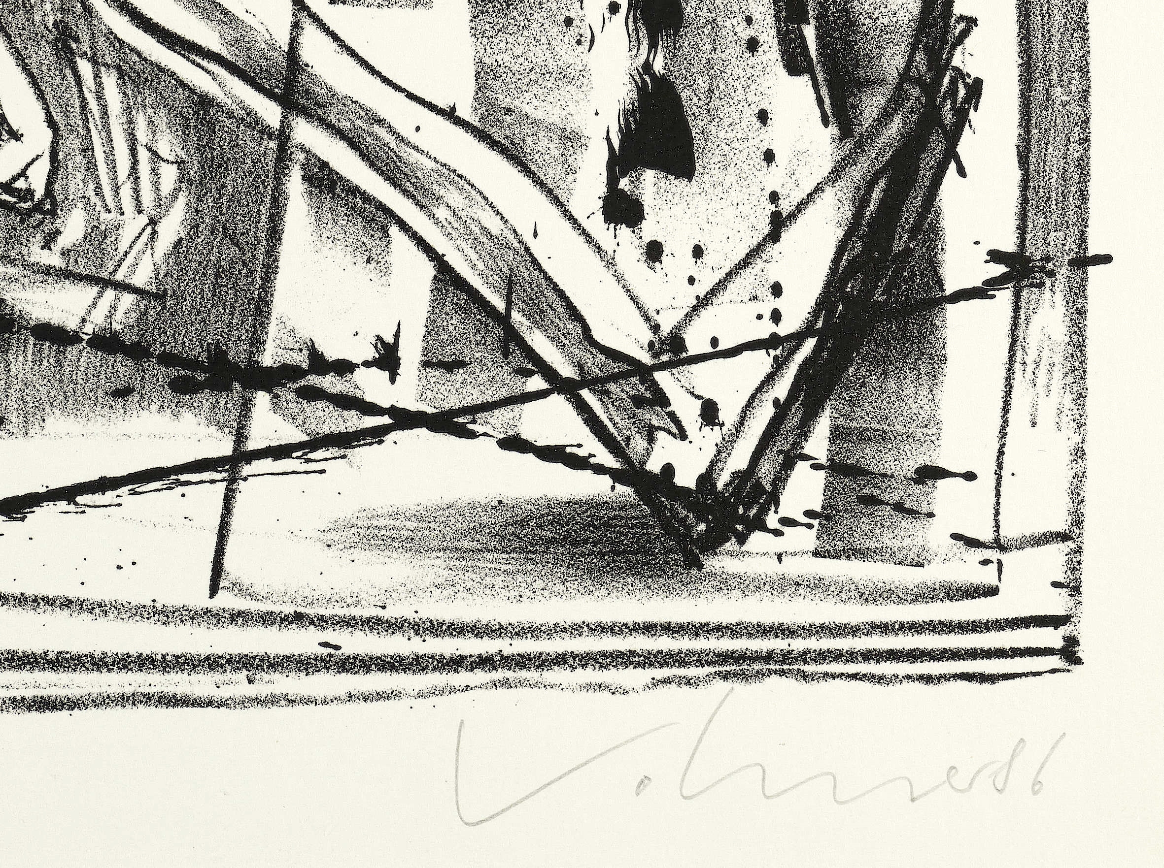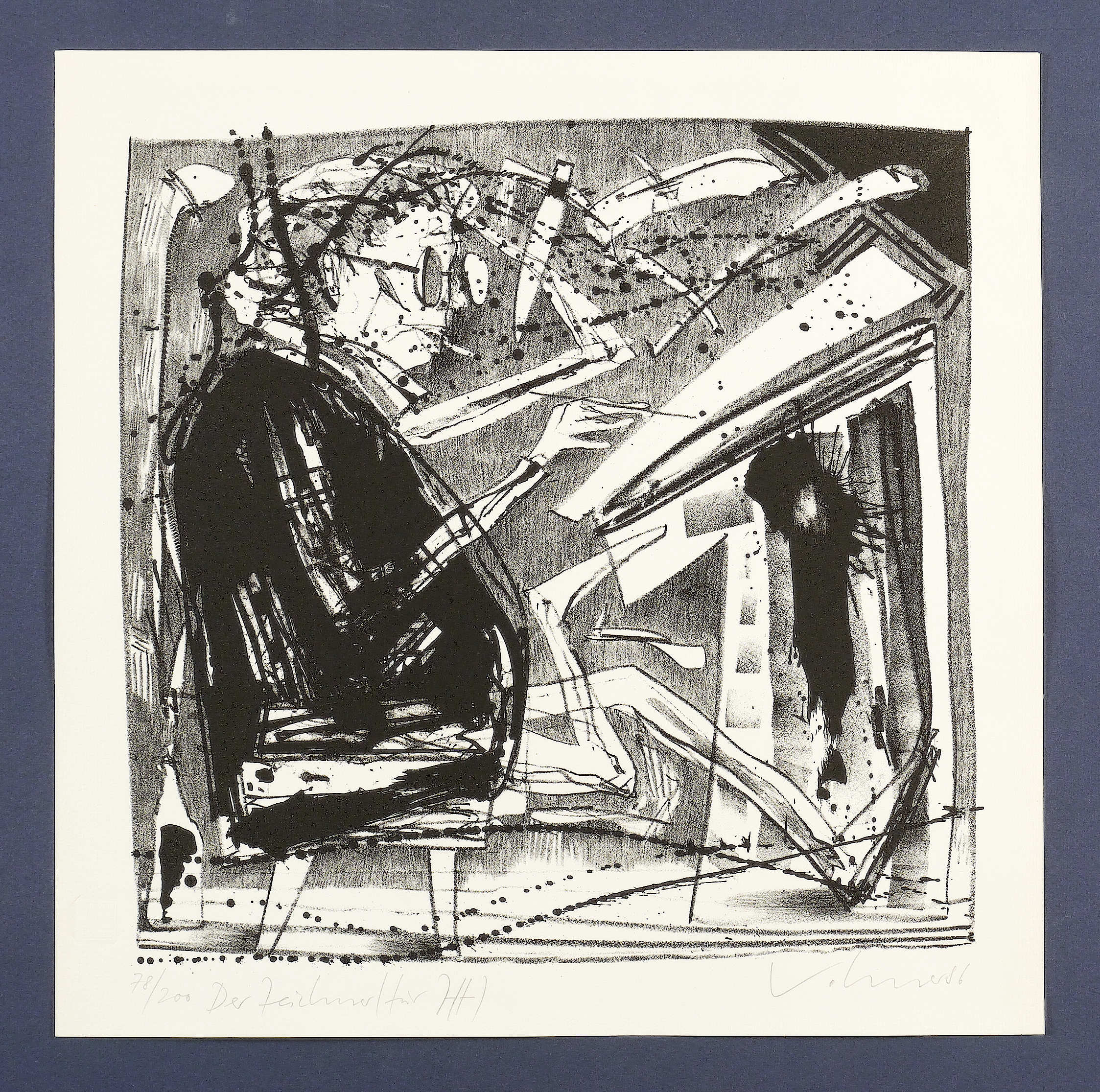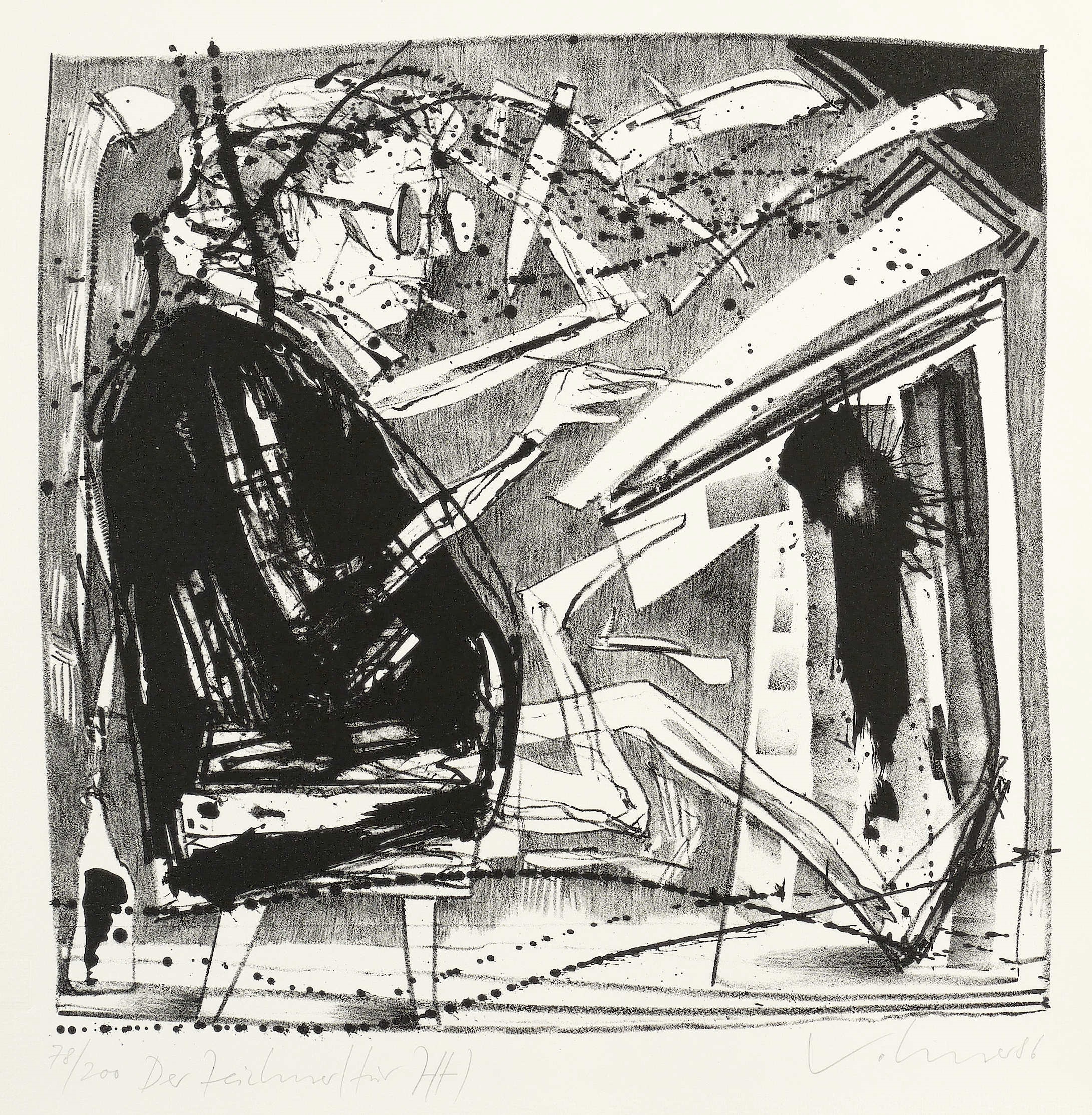 1986. Lithografie / Kreide- & Pinsellithografie, in Schwarz, auf hellgelbem Weißenborn-Bütten. – Originale Künstlergrafik, von Steffen Volmer. – Auflage Exemplar Nr. 78/200. – 30,5 x 31,0 cm (Darstellung), 36 x 36 cm (Blatt).