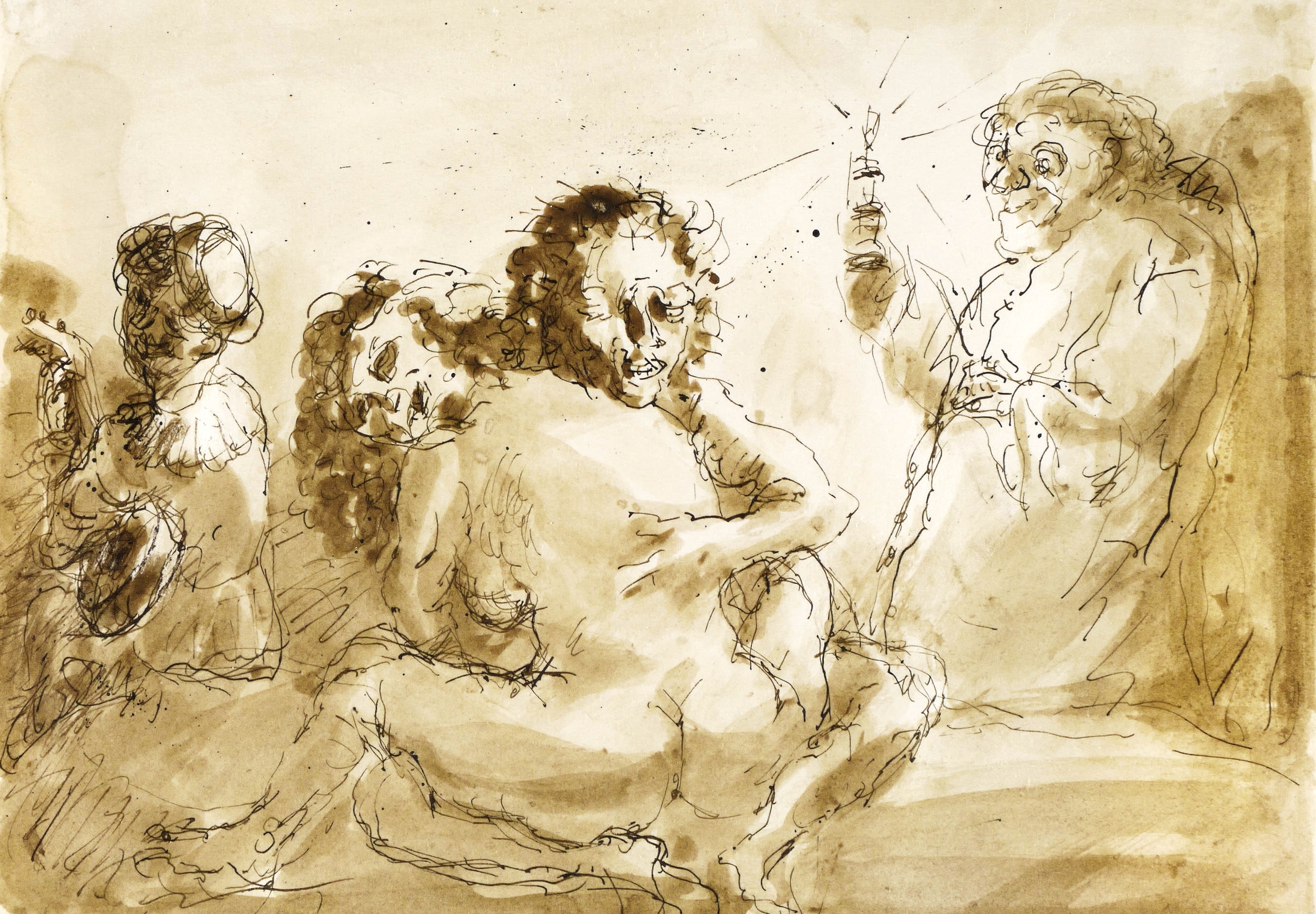 Rechts unten in Bleistift signiert: ″John″. Verso ausführlich bezeichnet. – Illustration zu der Macchiavelli-Edition ″Verführung auf toscanisch. Zeichnungen zu Machiavellis Komödie Mandragola″ von Joachim John, herausgegeben von Werner Stockfisch (Schwerin: Stock und Stein 1996). – Rückseitig Klebe- und Papierreste einer Montierung. Sonst sehr guter Zustand.