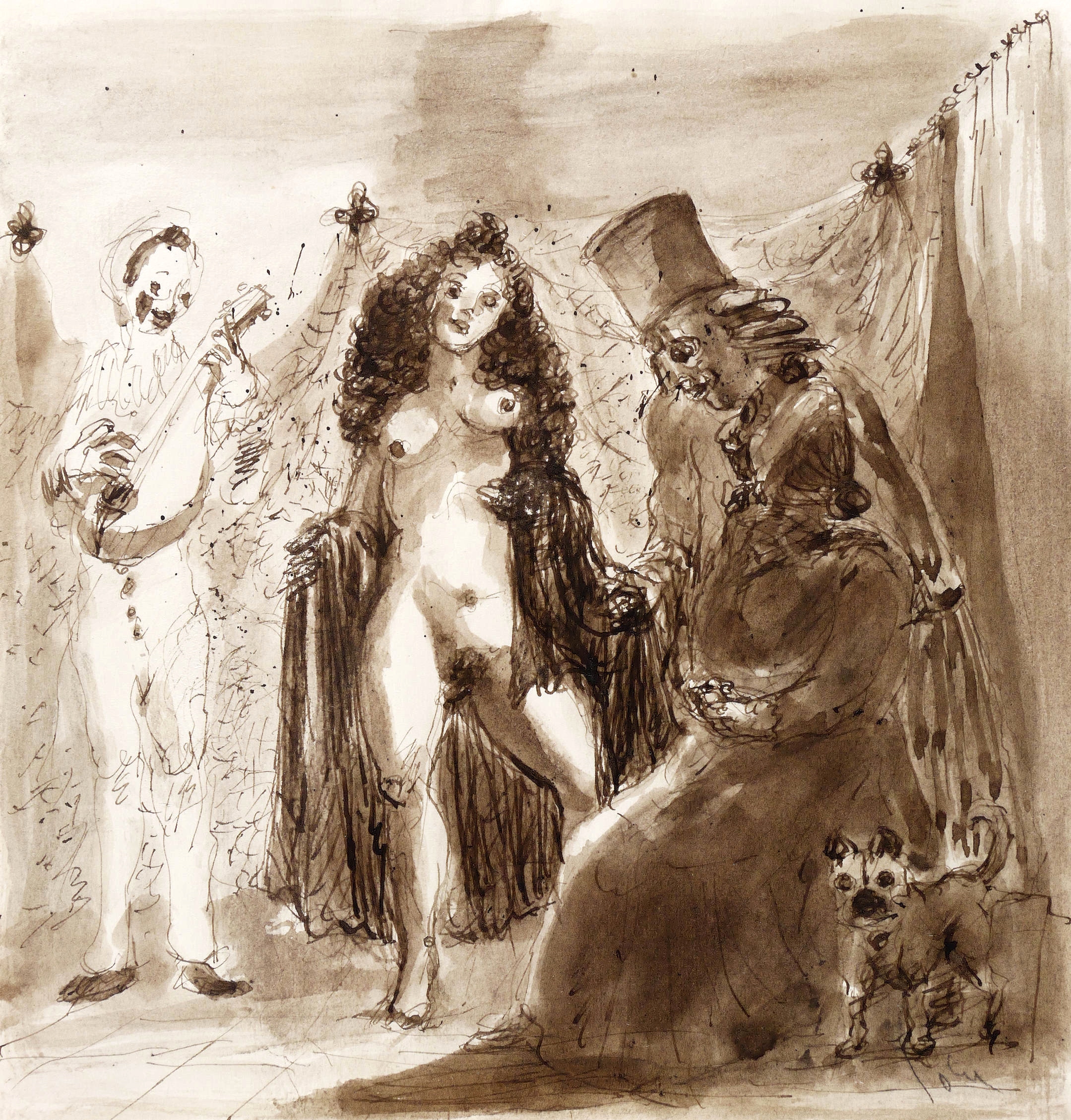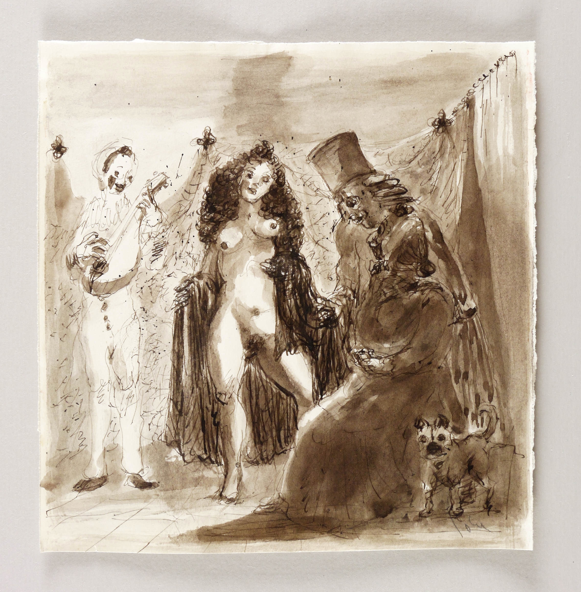 Rechts unten in Bleistift signiert: ″John″. Verso ausführlich bezeichnet. – Illustration zu der Macchiavelli-Edition ″Verführung auf toscanisch. Zeichnungen zu Machiavellis Komödie Mandragola″ von Joachim John, herausgegeben von Werner Stockfisch (Schwerin: Stock und Stein 1996). – Sehr guter Zustand.