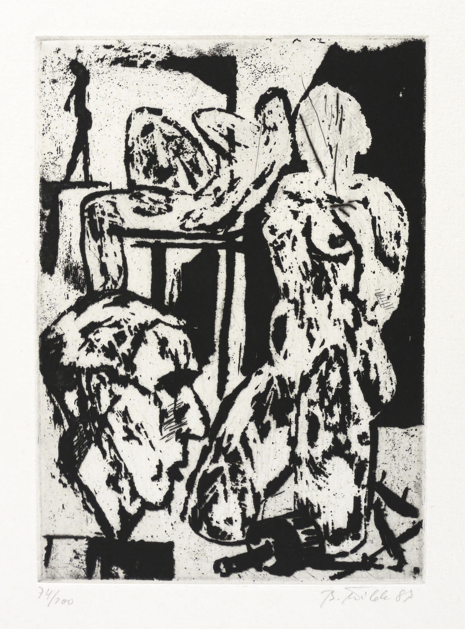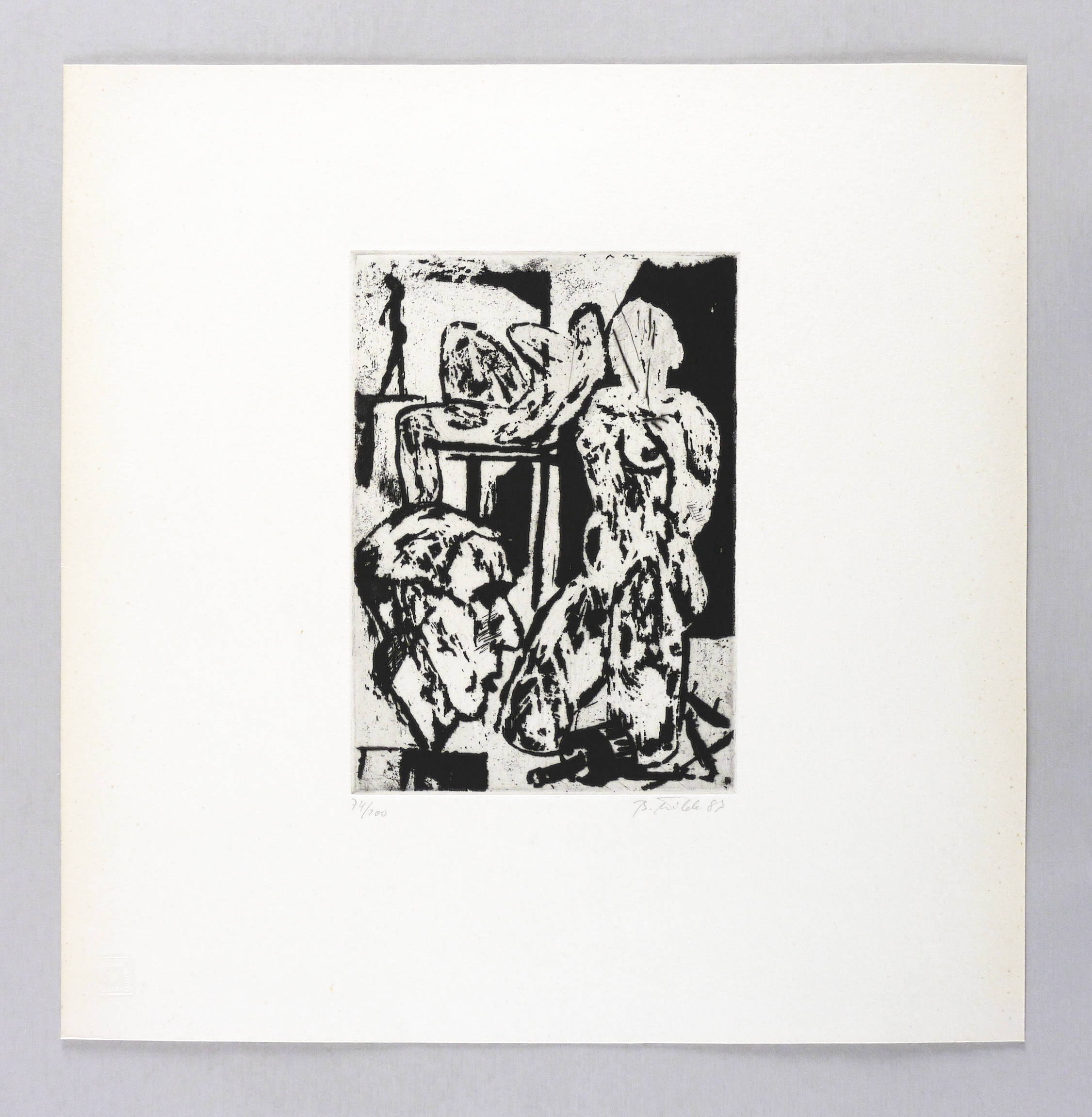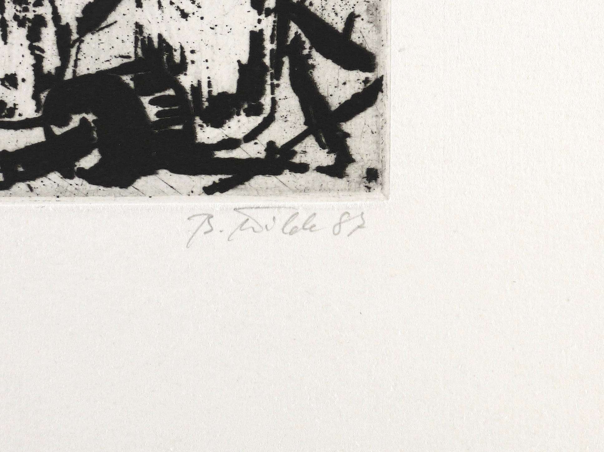1987. Radierung / Reservage & Kaltnadel, mit Plattenton, in Schwarz, auf hellchamois Velinkarton. – Originale Künstlergrafik, von Berndt Wilde. – Auflage Exemplar Nr. 74/200. – 19,7 x 14,1 cm (Darstellung / Platte), 36 x 36 cm (Blatt).
