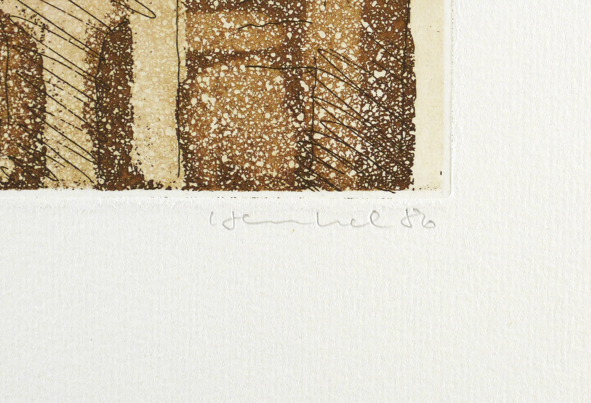 1986. Radierung / Aquatinta, in Braun, auf hellchamois Weißenborn. – Originale Künstlergrafik, von Friedrich B. Henkel. – Auflage Exemplar Nr. 74/200. – 15,2 x 19,8 cm (Darstellung / Platte), 36 x 36 cm (Blatt).