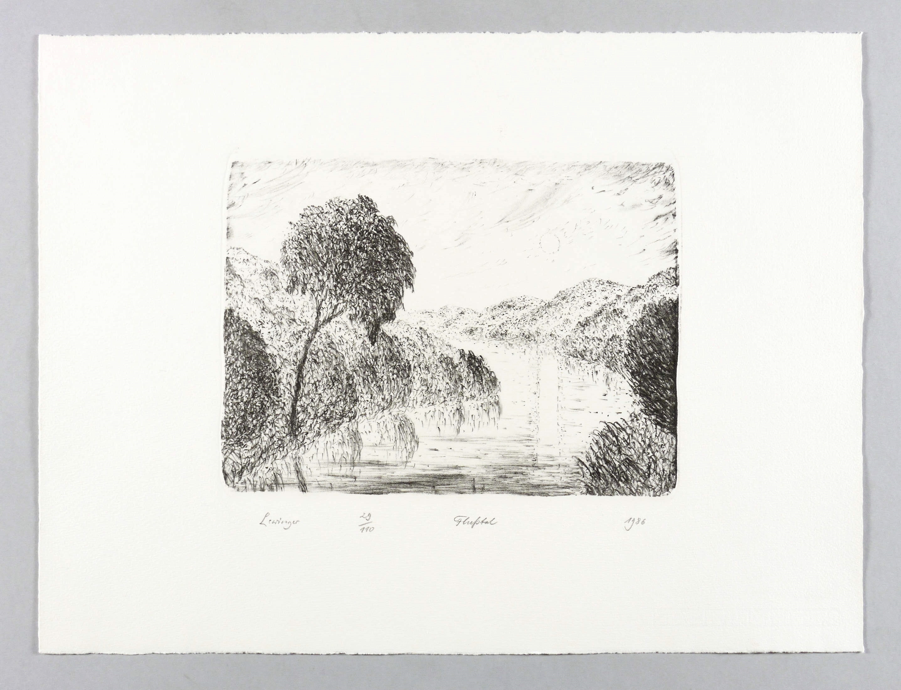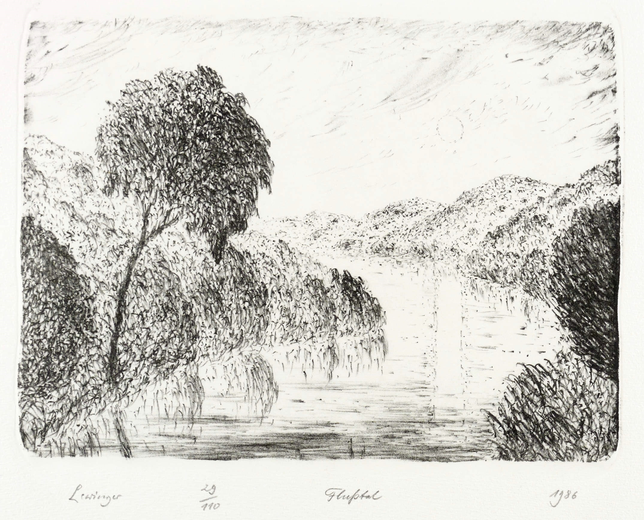 1986. Lithografie / Kreidelithografie, in Schwarz, auf hellchamois Hahnemühle-Bütten. – Originale Künstlergrafik, von Ernst Lewinger. – Auflage Exemplar Nr. 29/110. – 19,6 x 26,6 cm (Darstellung / Druckbild), 36 x 48 cm (Blatt).
