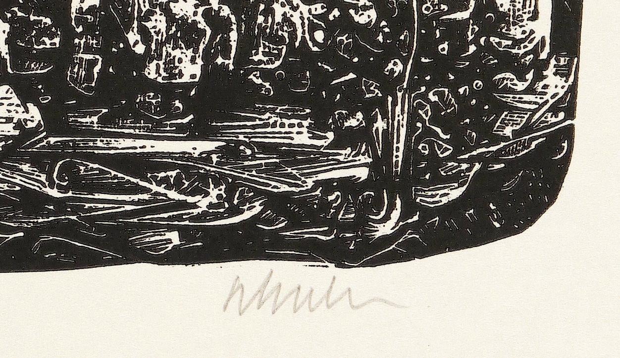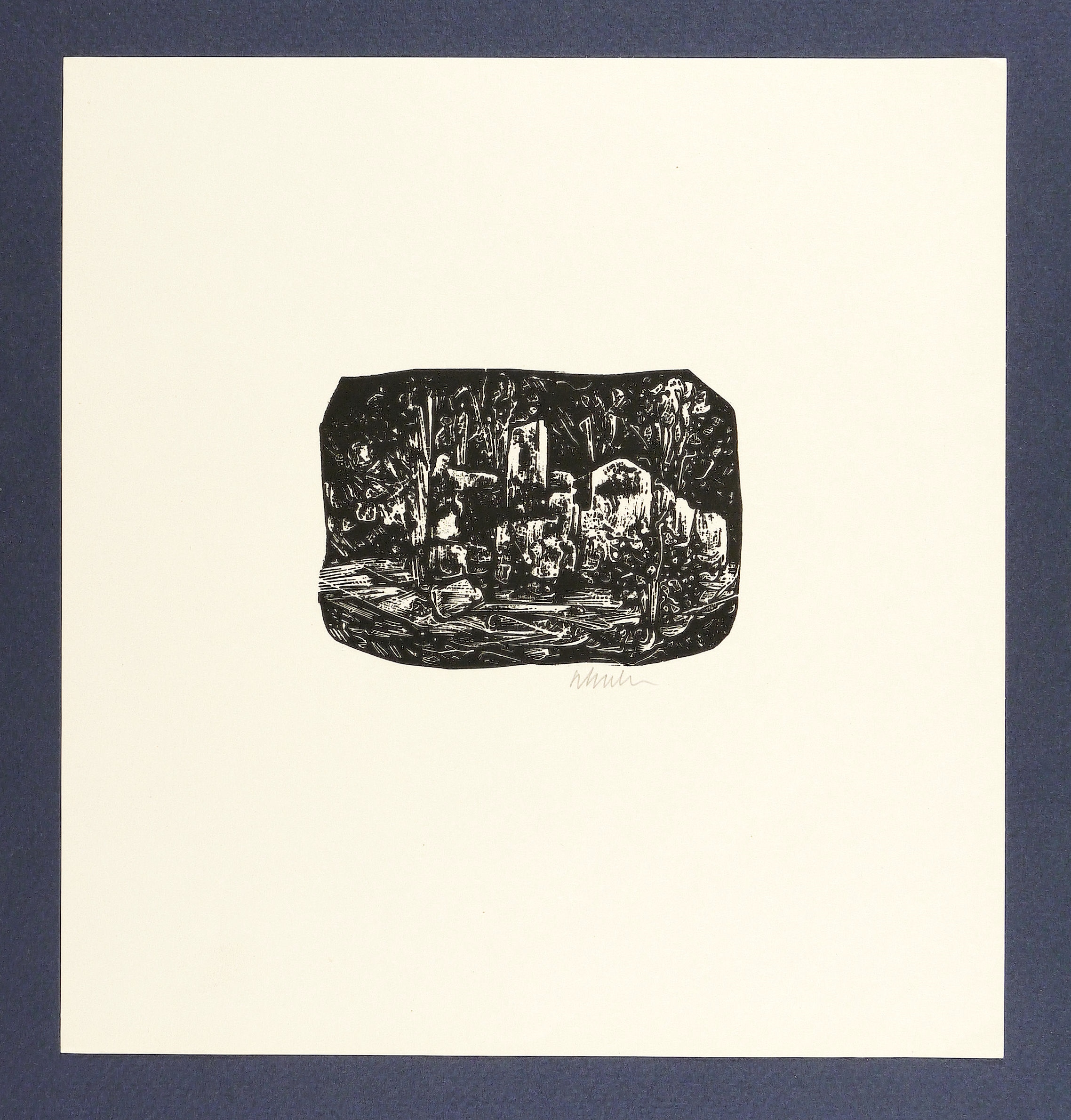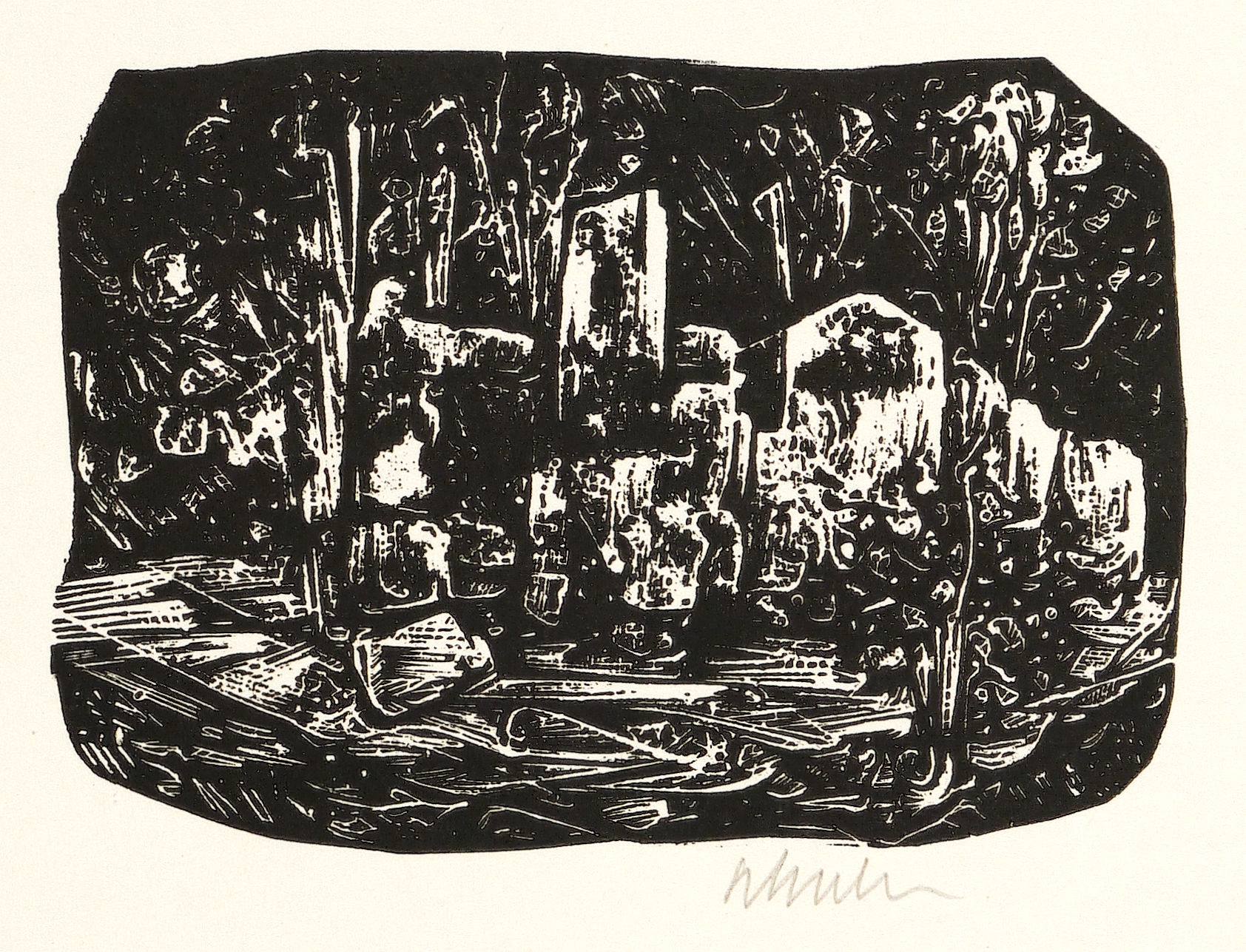 1966. Linolschnitt, in Schwarz, auf glattem hellchamois Karton. – Originale Künstlergrafik, von Hans Schulze. – 6,2 x 8,8 cm (Darstellung), 21 x 20 cm (Blatt).