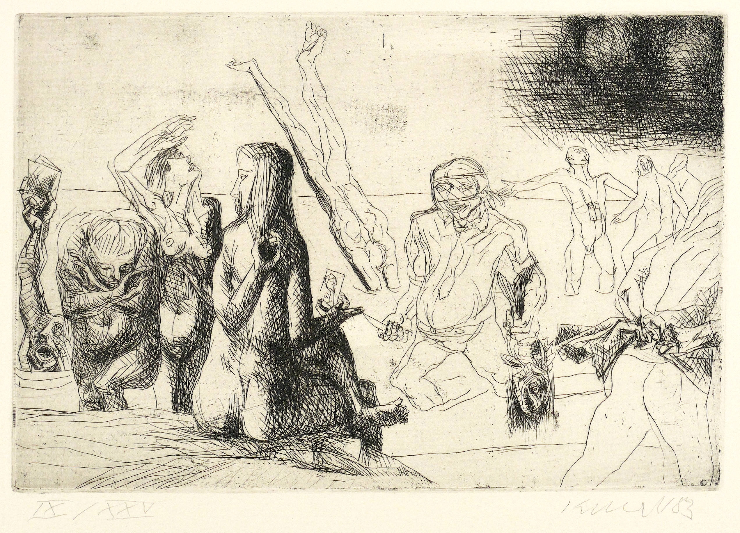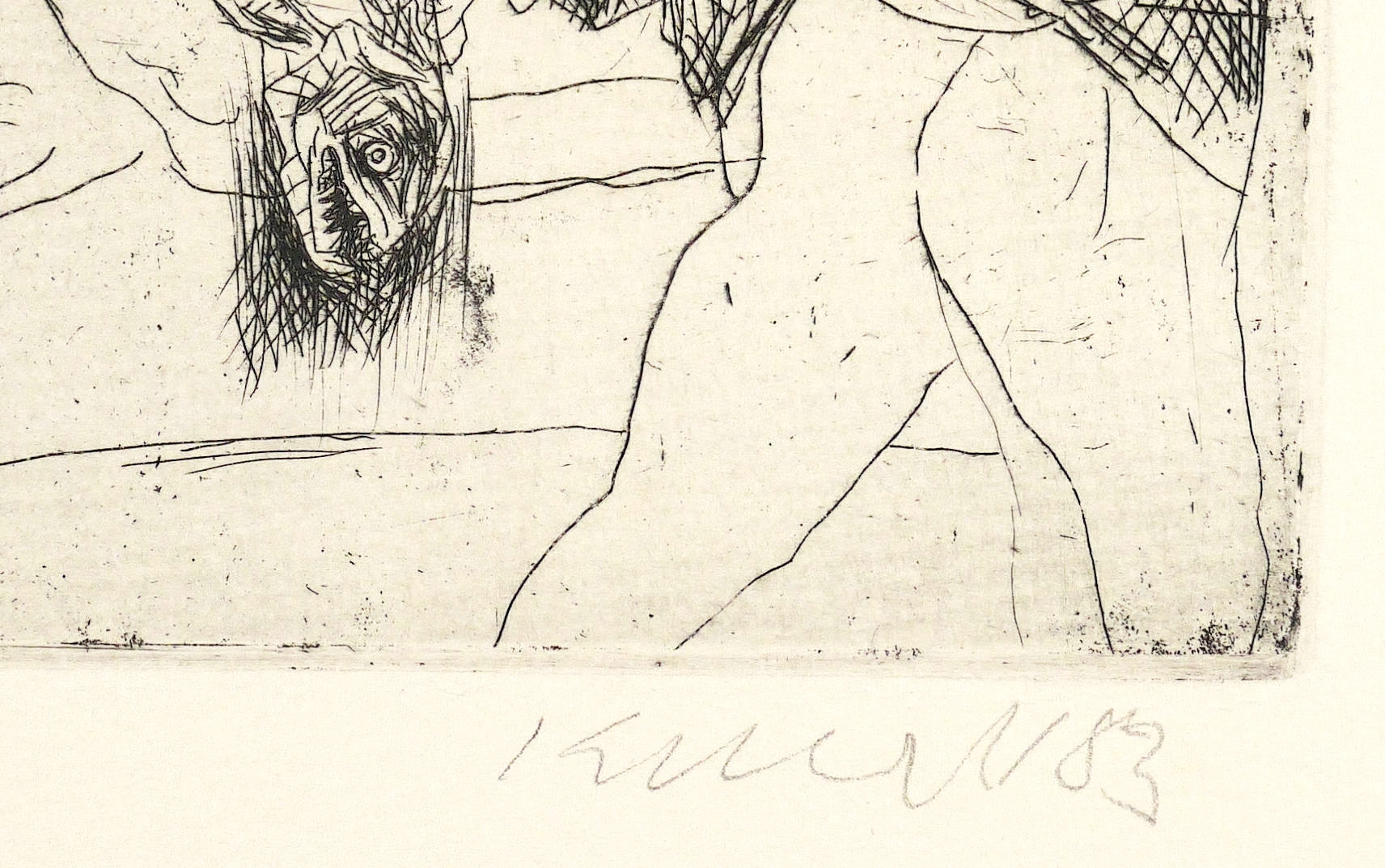 1983. Radierung / Strichätzung & Kaltnadel, in Schwarz, mit Plattenton, auf hellgelbem Karton. – Originale Künstlergrafik, von Rolf Kuhrt. – Auflage Exemplar Nr. 9/25. – 16,8 x 24,8 cm (Darstellung / Platte), 32 x 35 cm (Blatt).