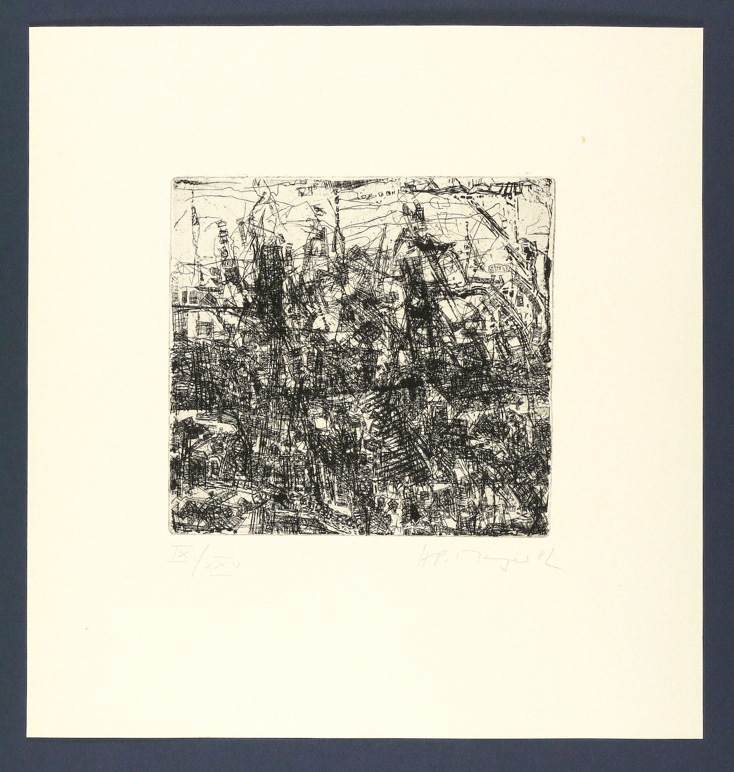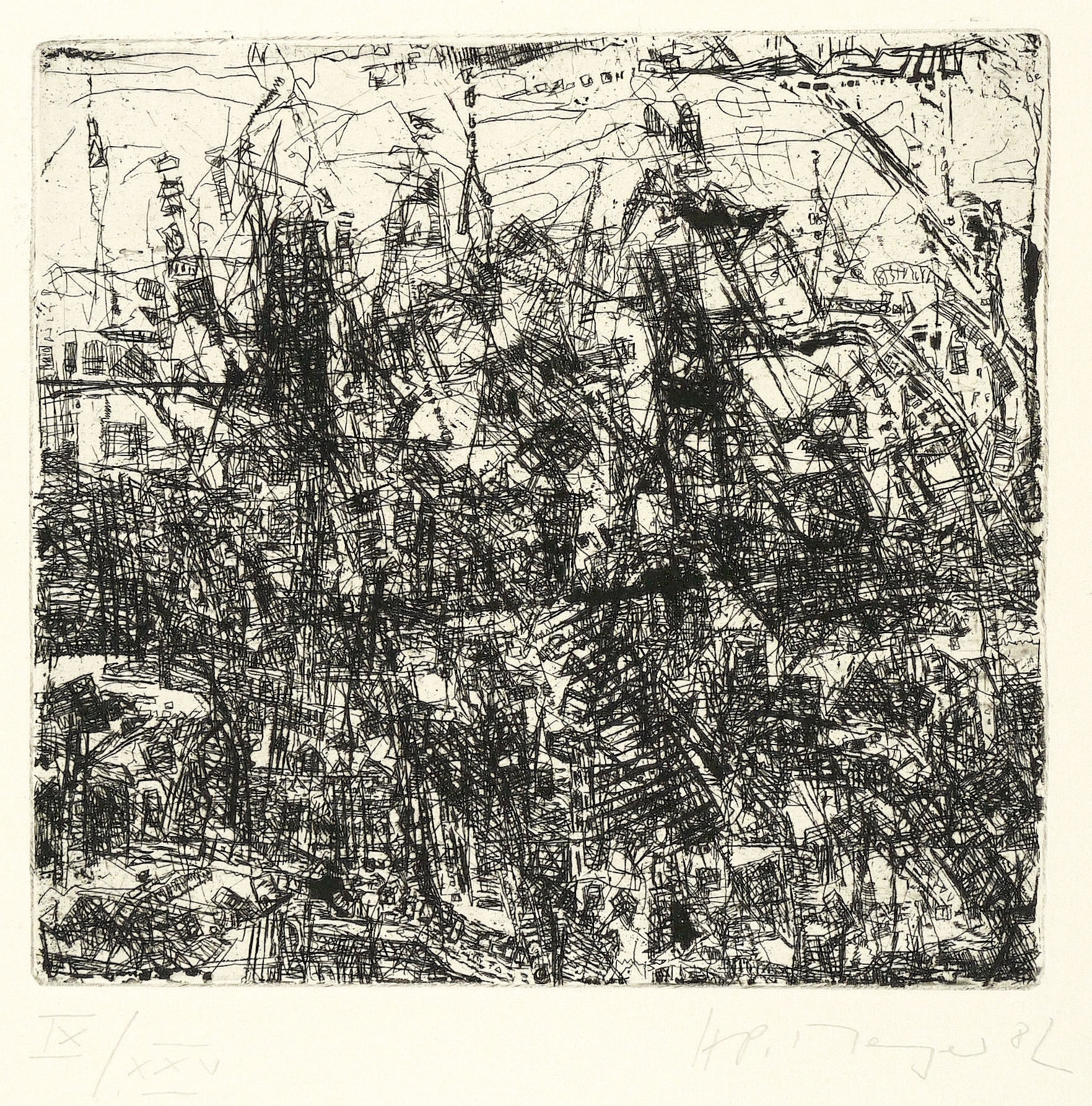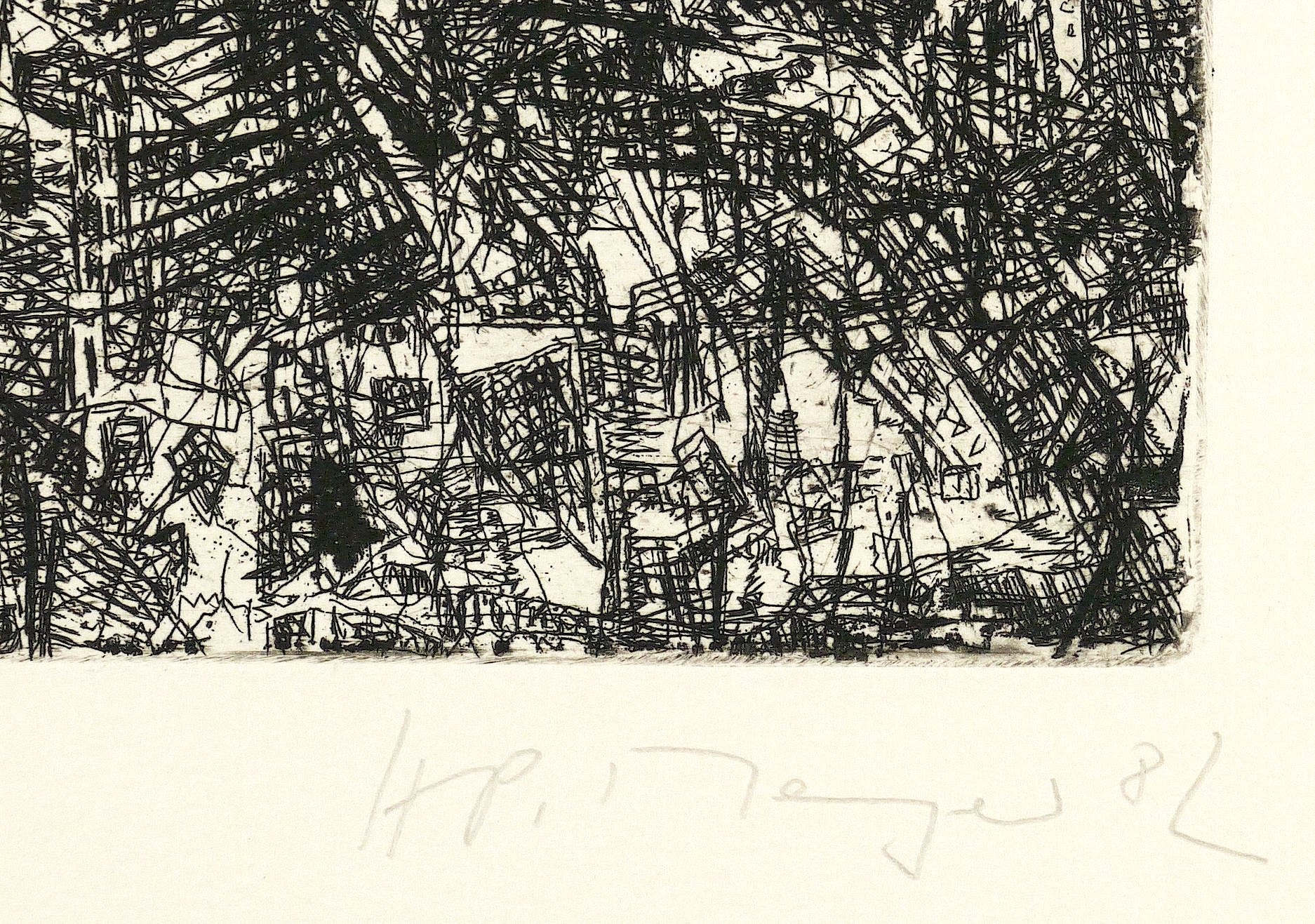 1982. Radierung / Strichätzung & Reservage, in Schwarz, auf hellgelbem Papier. – Originale Künstlergrafik, von Horst-Peter Meyer. – Auflage Exemplar Nr. 9/25. – 18,5 x 19,9 cm (Darstellung / Platte), 36,5 x 35 cm (Blatt).