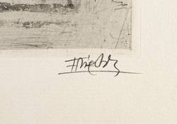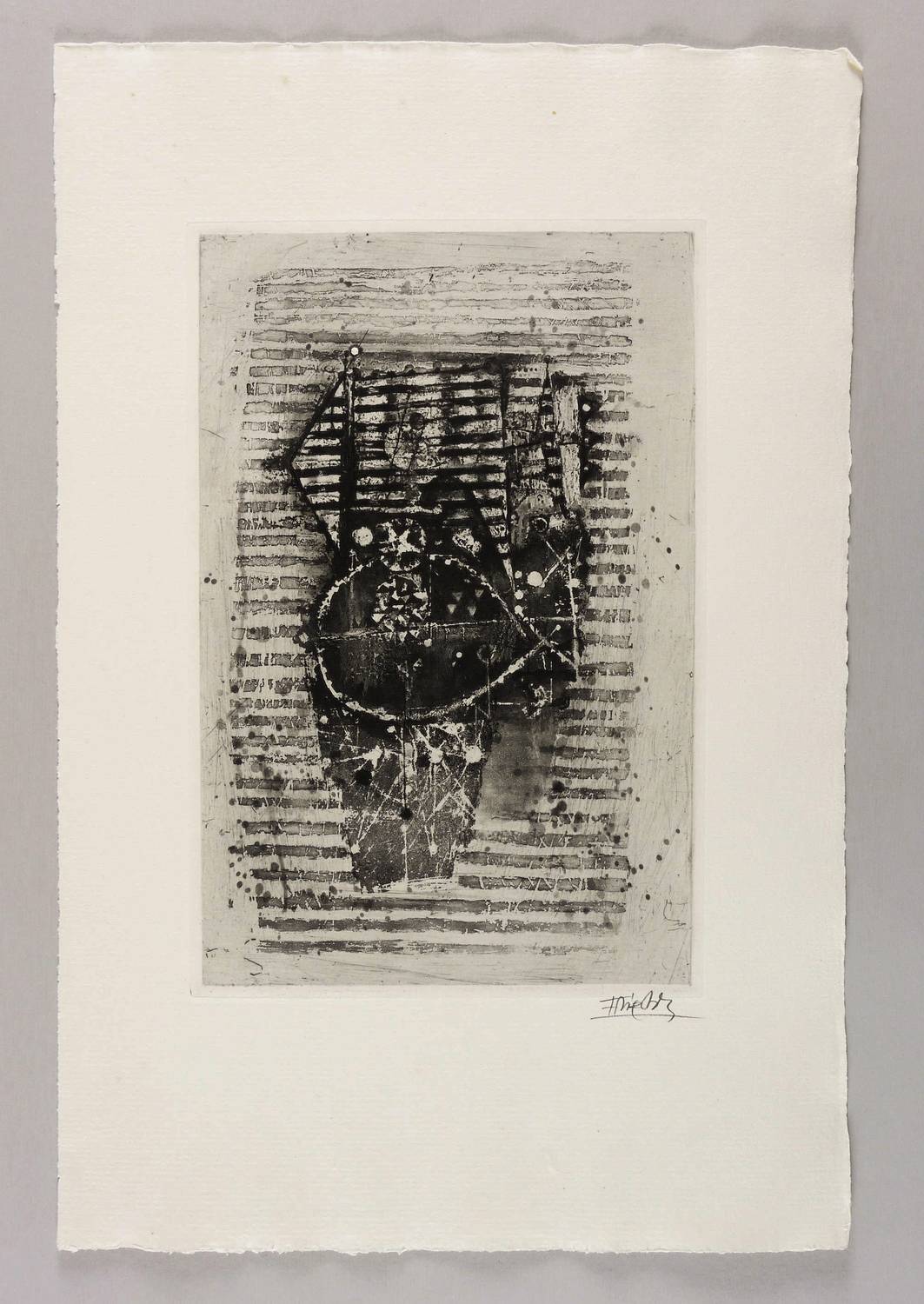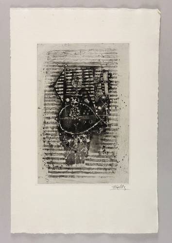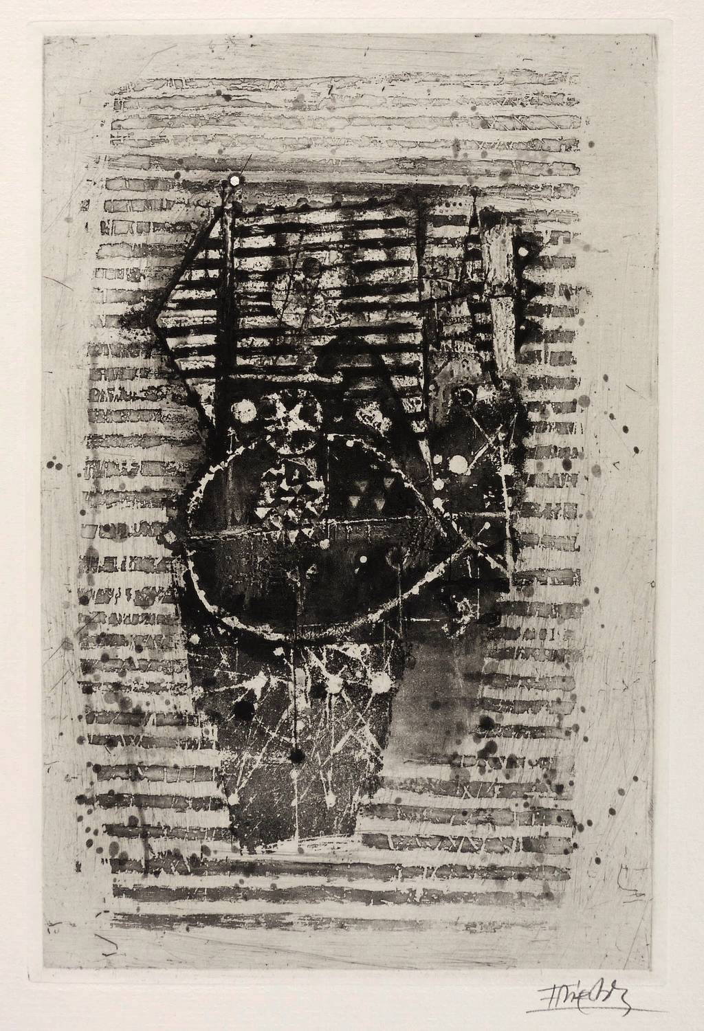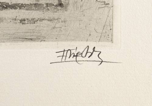 1963. Radierung / Aquatinta, in Schwarz, auf rauem hellchamois Auvergne. – Originale Künstlergrafik, von Johnny Friedländer. – Auflage 60 Exemplare. – 31,4 x 20,6 cm (Darstellung / Druckbild), 51 x 33 cm (Blatt), 32,4 x 21,6 cm (Platte).