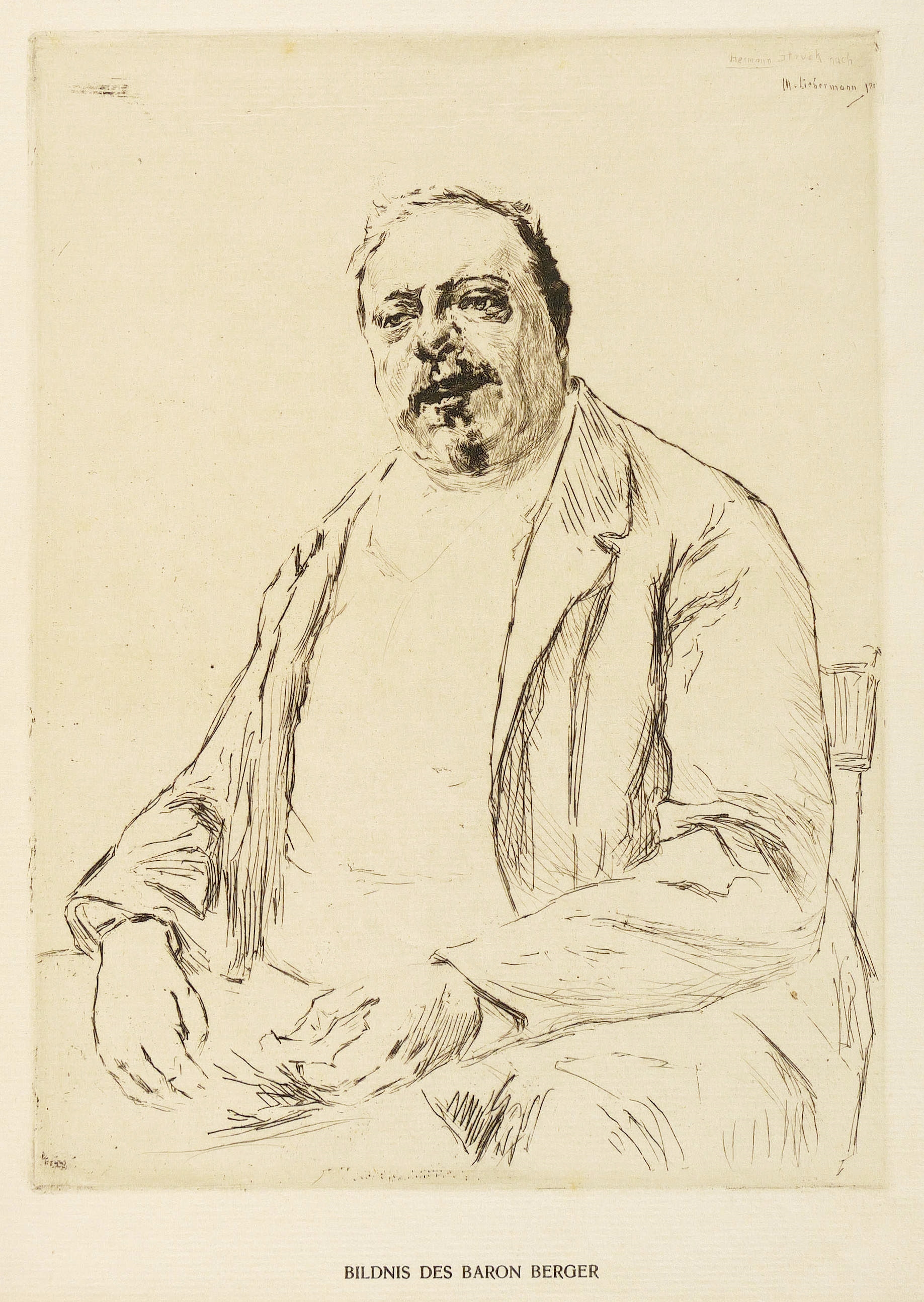 Aus: Zeitschrift für bildende Kunst (Leipzig: E.A. Seemann 1906), Bd. 17. – In der Platte rechts oben signiert: ″Hermann Struck nach / M. Liebermann 190[.]″. Unterhalb typografisch bezeichnet: ″BILDNIS DES BARON BERGER / RADIERUNG VON HERMANN STRUCK NACH DEM GEMÄLDE VON MAX LIEBERMANN″. – Originalgrafische Wiedergabe des 1905 von Max Liebermann gemalten Porträts des Wiener Theaterdirektors Baron Alfred von Berger (1853-1912). – Papier kaum merklich knickspurig. Insgesamt gut erhalten.