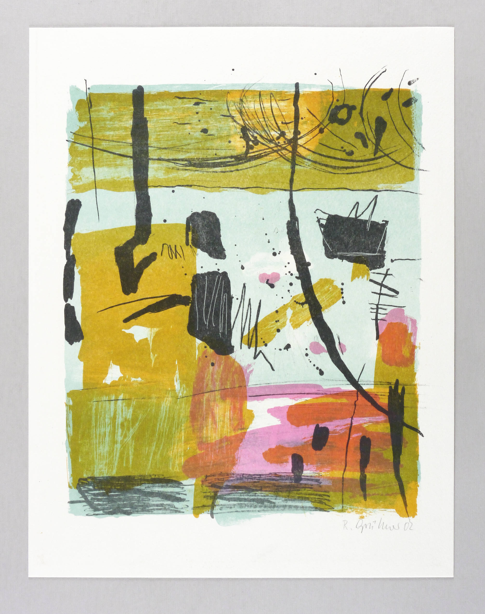 2002. Farblithografie / Pinsel- & Kreidelithografie, in 5 Farben, auf hartem hellchamois Velinkarton. – Originale Künstlergrafik, von Roswitha Grüttner. – Auflage 300 Exemplare. – 35,7 x 29,4 cm (Darstellung / Druckbild), 45 x 35 cm (Blatt).