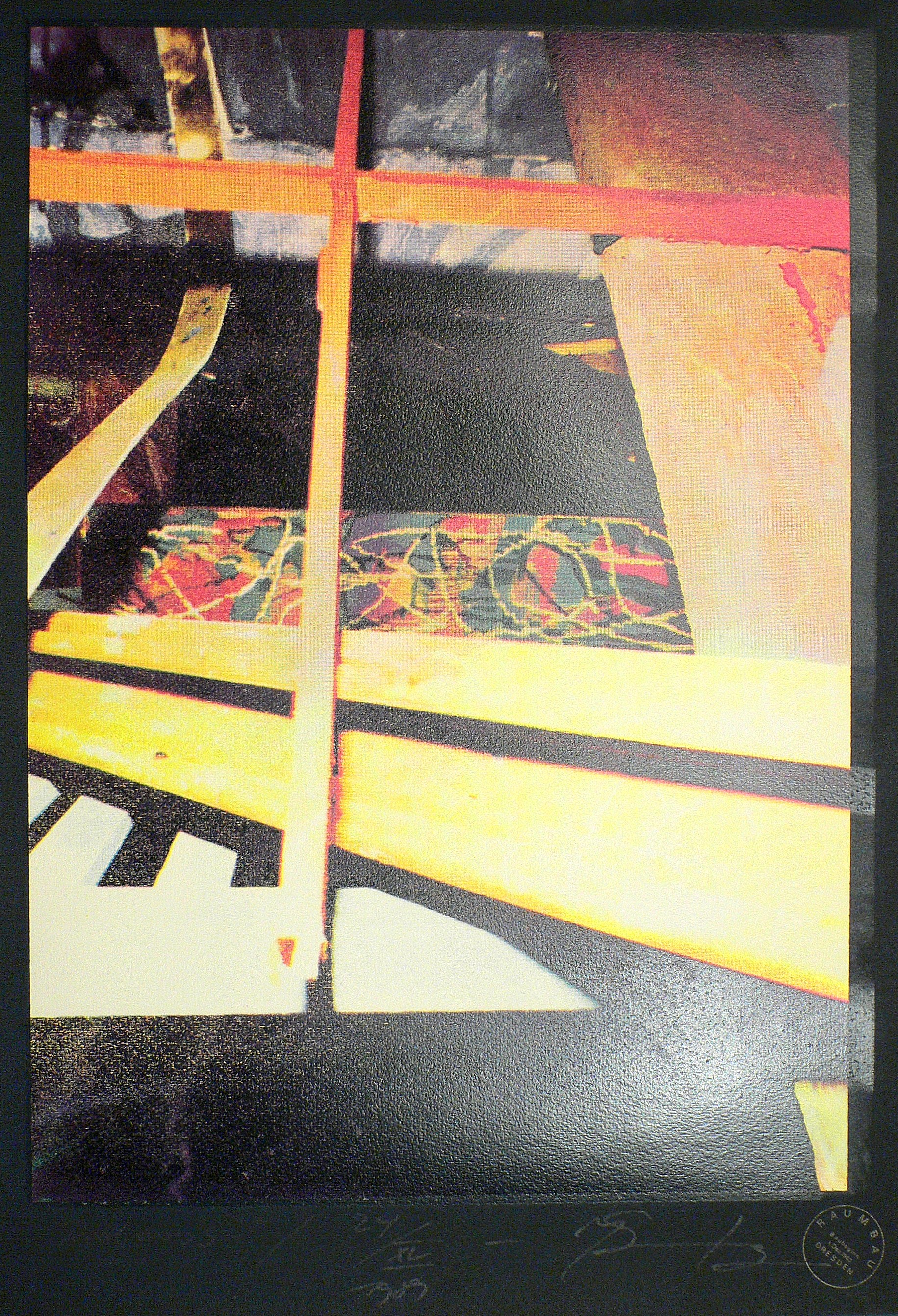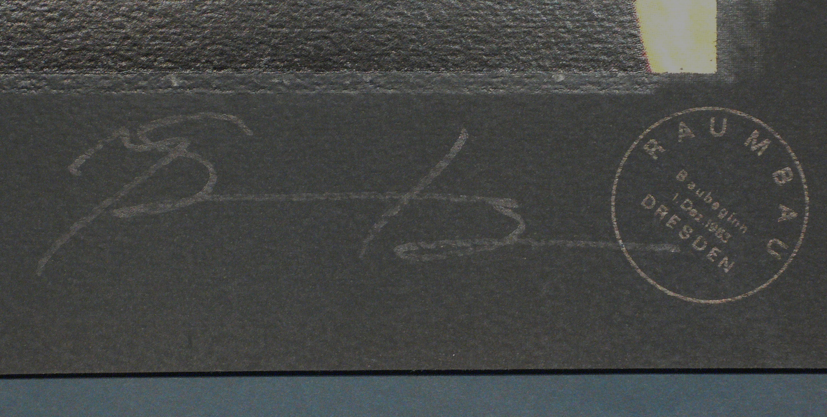 Außerhalb der Darstellung rechts unten in schwarzem Faserstift signiert, links unten betitelt und mittig datiert mit Auflagenbezeichnung. Am Blattrand rechts unten Stempel ″Raumbau. Baubeginn 1. Dez. 1983 Dresden″. – Verso leichte Papierschäden und Reste einer ehemaligen Montierung. Sehr guter Zustand.