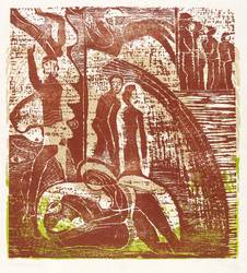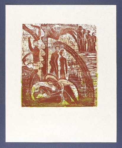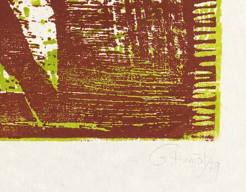 1979. Farbholzschnitt, in 3 Farben, auf rauem Japanpapier. – Originale Künstlergrafik, von Günther Huniat. – Auflage Exemplar Nr. 1/20. – 32,2 x 29,6 cm (Darstellung / Druckstock), 53 x 43 cm (Blatt).