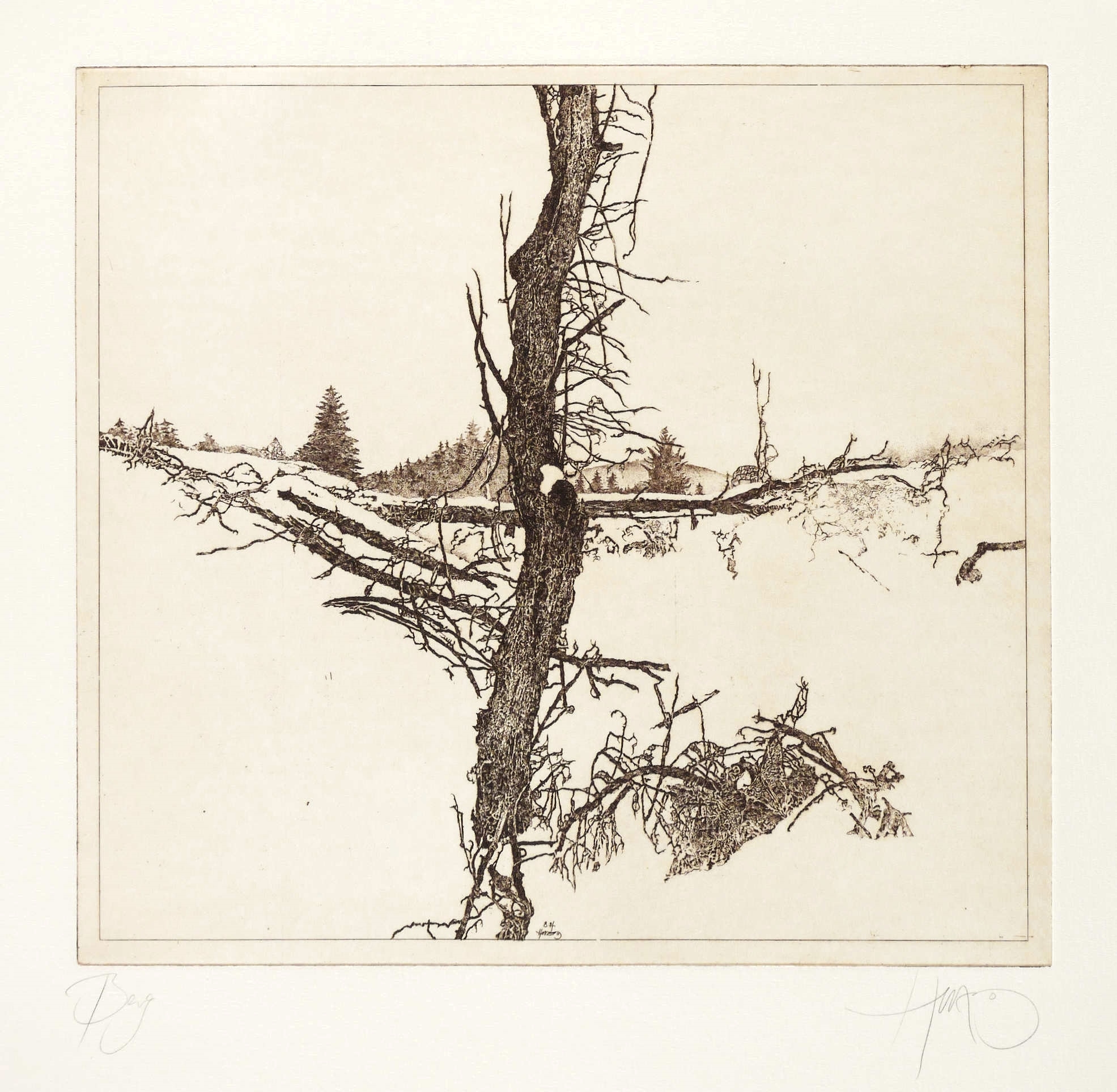 1984. Radierung / Strichätzung, in Rotbraun, mit Plattenton, auf Büttenpapier. – Originale Künstlergrafik, von Walter Herzog. – Auflage Exemplar Nr. 69/100. – 27,1 x 29,3 cm (Darstellung / Platte), 49 x 39,5 cm (Blatt).
