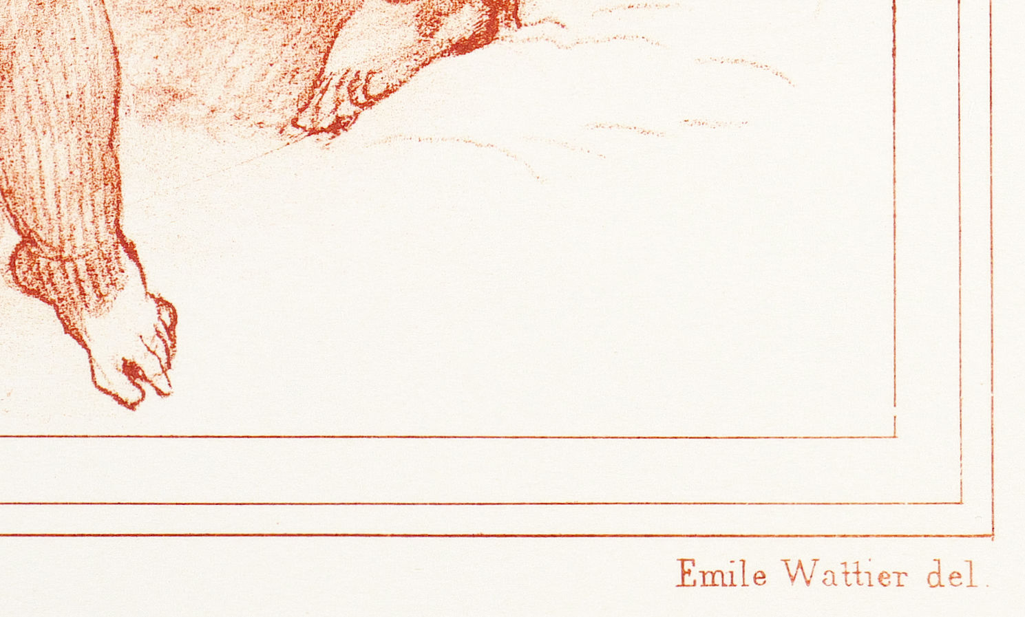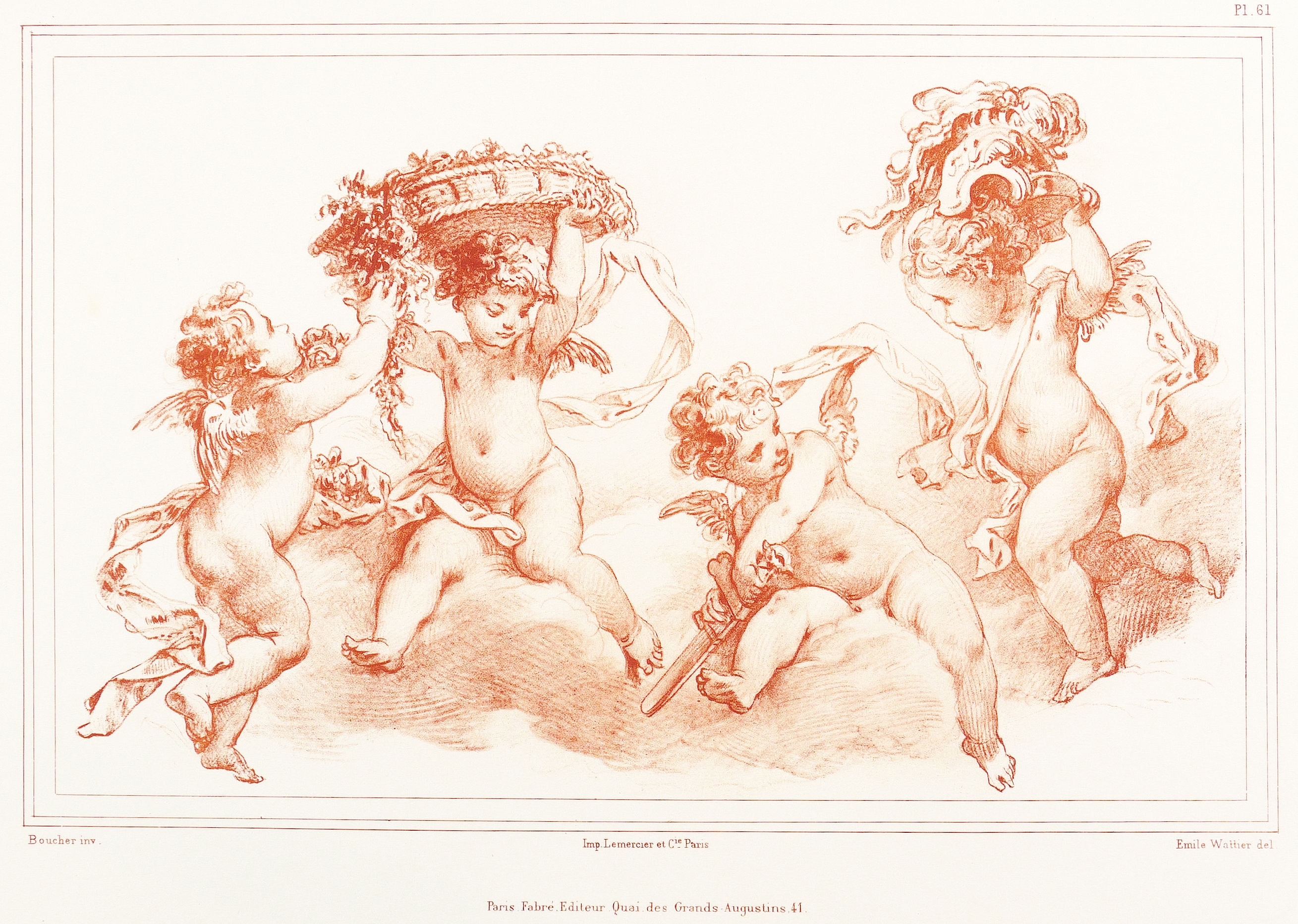 Aus: Emile Wattier, L'oeuvre de Boucher reproduit par Émile Wattier d'après la gravure des dessins originaux (Paris: Fabre 1884). – Im Stein rechts unten signiert: "Emile Wattier del." Links bezeichnet: "Boucher inv." Mittig Druckeradresse von Lemercier et Cie. in Paris. Darunter Verlagsadresse. – Sehr gut erhalten.