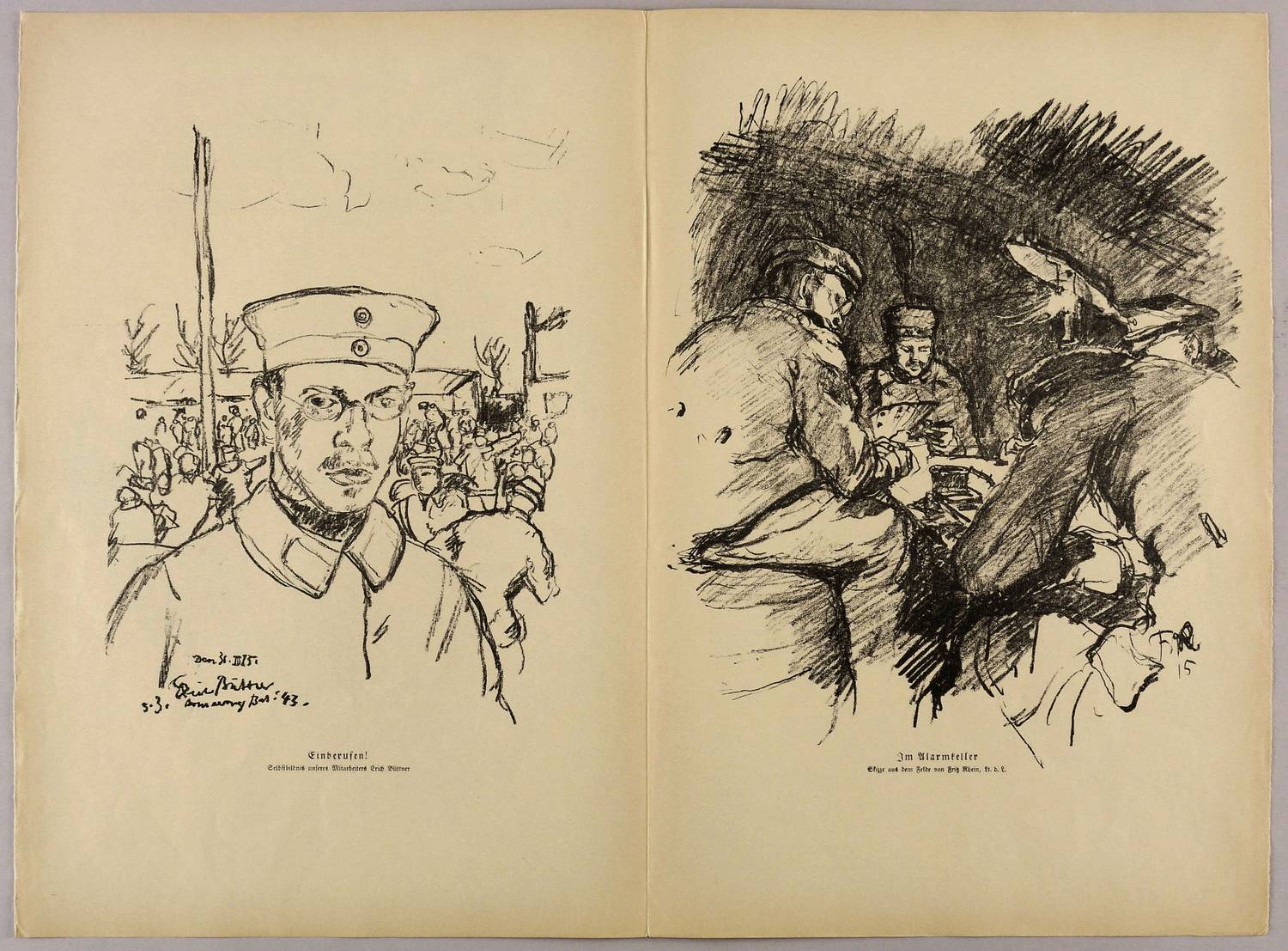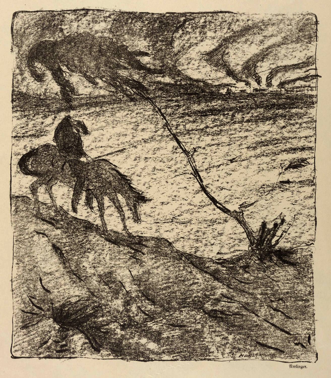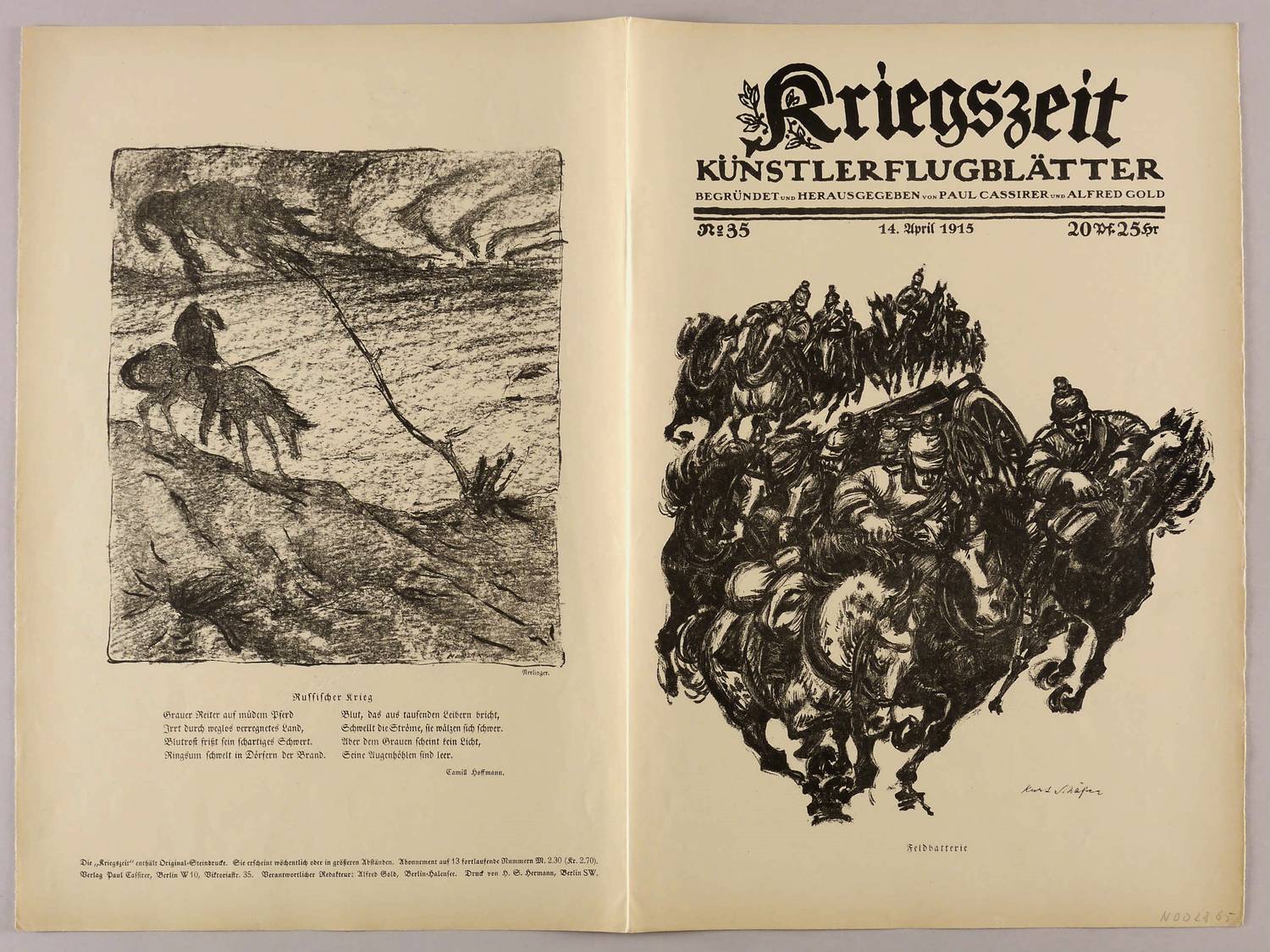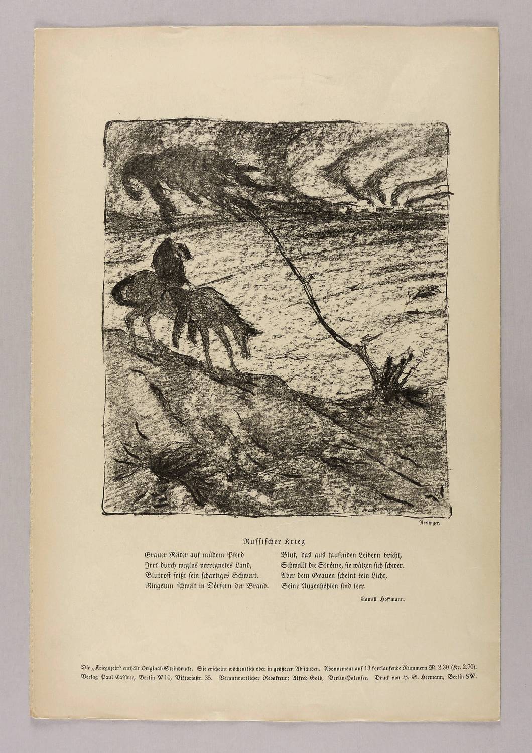Aus: Kriegszeit. Künstlerflugblätter (Berlin: Paul Cassirer & Alfred Gold 1914-1916). – Nicht handsigniert. Rechts unten typografische Signatur: ″Nerlinger″. Darunter Abdruck des Gedichts: ″Russischer Krieg // GRauer Reiter auf müdem Pferd / Irrt durch weglos verregnetes Land, / (...)″. – Zu dem gleichnamigen Gedicht von Camill Hoffmann. - Vollständige Ausgabe der Kriegszeit Jahrgang 1915, Nr. 35, mit den drei Lithografien ″Feldbatterie″ von Kurt Schäfer, ″Einberufen! (Selbstbildnis)″ von Erich Büttner sowie ″Im Alarmkeller″ von Fritz Rhein. – In den Blattkanten altersbedingt gegilbt. Insgesamt guter Zustand.