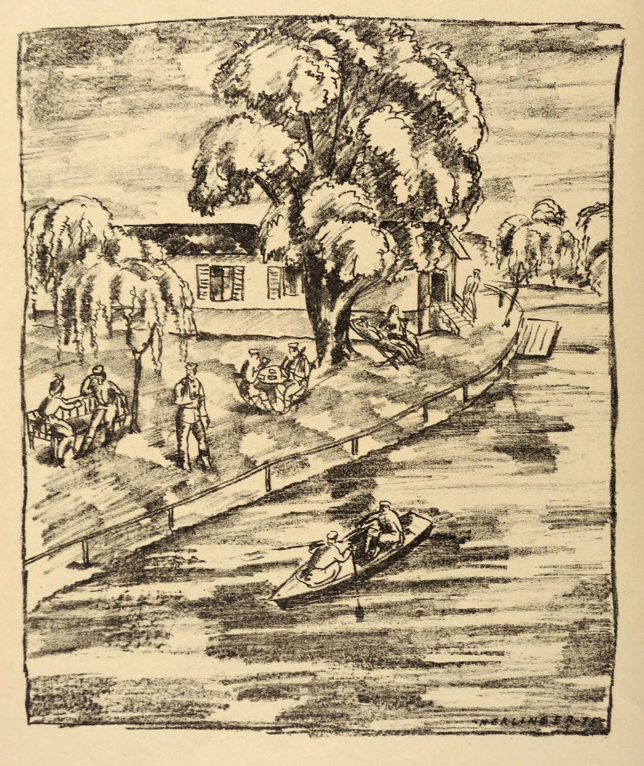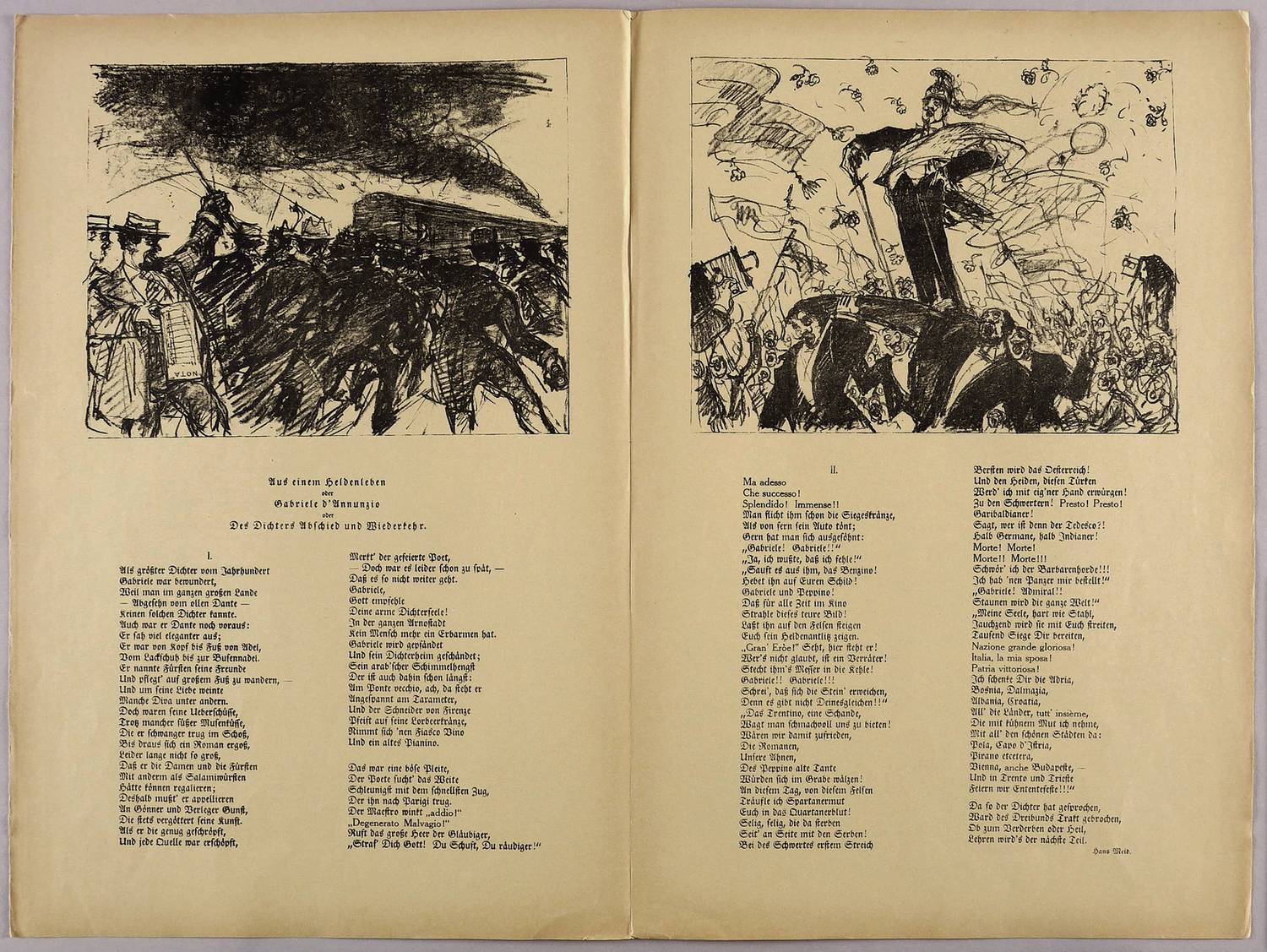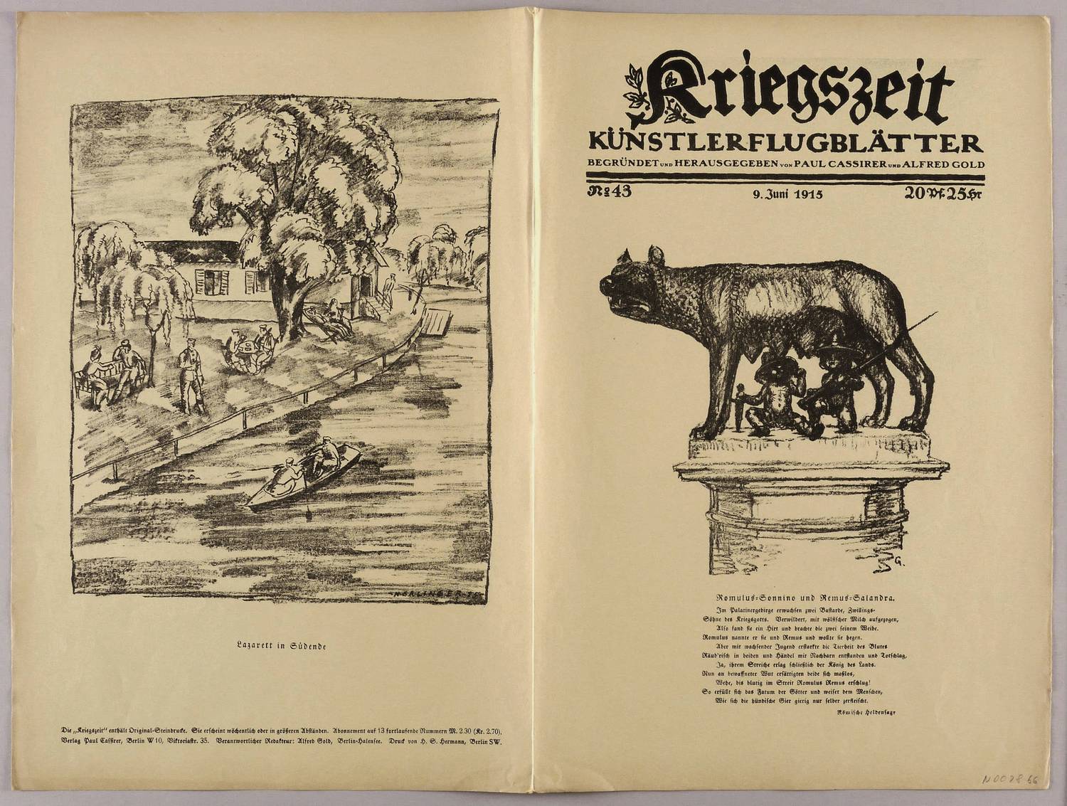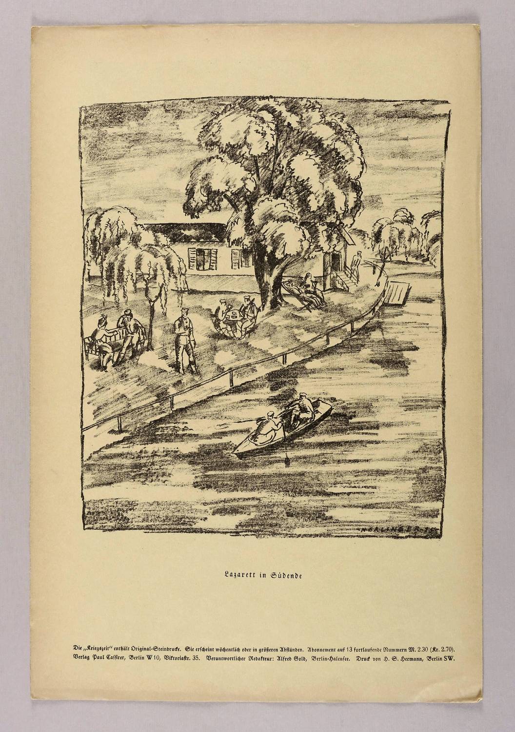 Aus: Kriegszeit. Künstlerflugblätter (Berlin: Paul Cassirer & Alfred Gold 1914-1916). – Nicht handsigniert. Im Stein rechts unten Signatur und Jahr: ″NERLINGER 15″ Darunter typografischer Titel: ″Lazarett in Südende″. – Vollständige Ausgabe der Kriegszeit Jahrgang 1915, Nr. 43, mit der Lithografie ″Romulus-Sonnino und Remulus- Salandra″ von August Gaul sowie zwei Lithografien zu ″Gabriele d'Annunzio″ von Hans Meid. – In den Blattkanten altersbedingt gegilbt. Insgesamt guter Zustand.