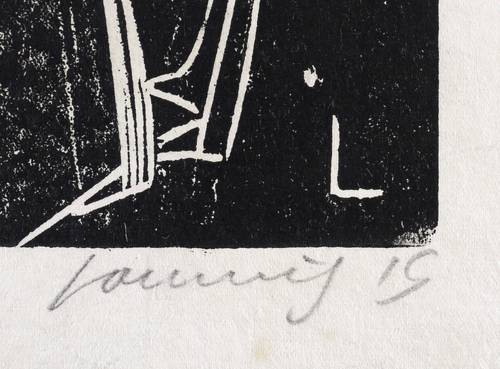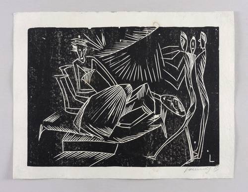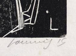 Söhn HDO 72706-8. Jahn-Berger 58. – Aus: Die Schaffenden (Berlin: Gustav Kiepenheuer Verlag 1919/1920), Bd. 2. – Rechts unten in Bleistift signiert und datiert: ″Lomnitz 19″. Im Holzstock direkt darüber Monogramm: ″L″. In der Blattecke links unten Trockenstempel des Euphorion Verlags. – Originalgrafische Beilage der Kunstzeitschrift ″Die Schaffenden″. - Illustration einer Novelle von Fjodor Michailowitsch Dostojewski. Nach dem plötzlichen Tod des krankhaft geizigen Semjon Iwanowitsch Prochartschin findet man in seiner Matratze ein großes Vermögen. – Originalrandiges Blatt. Im Blattrand oben rechts, am Druckstock kleines ausgebessertes Loch. Mäßig guter Zustand.