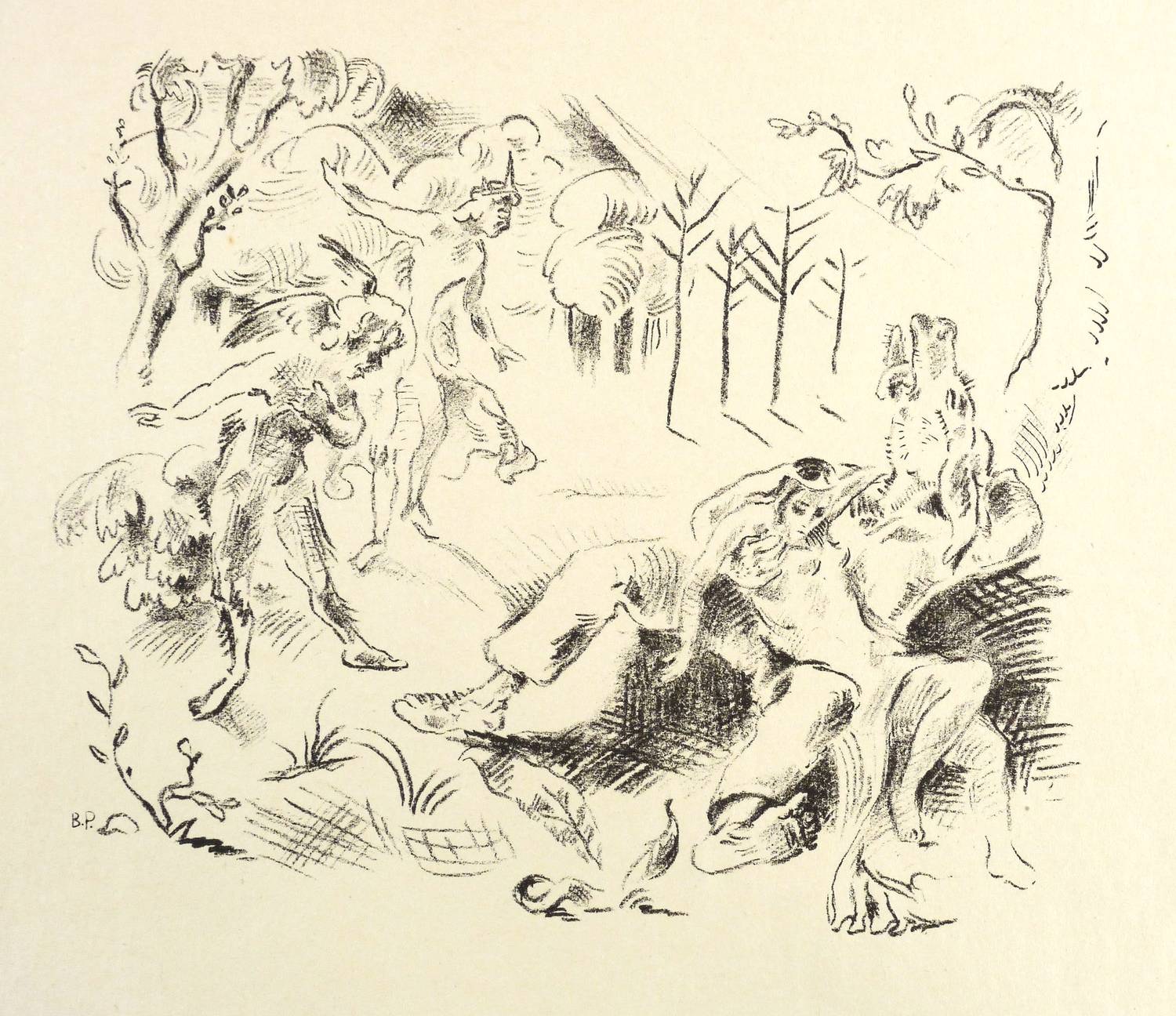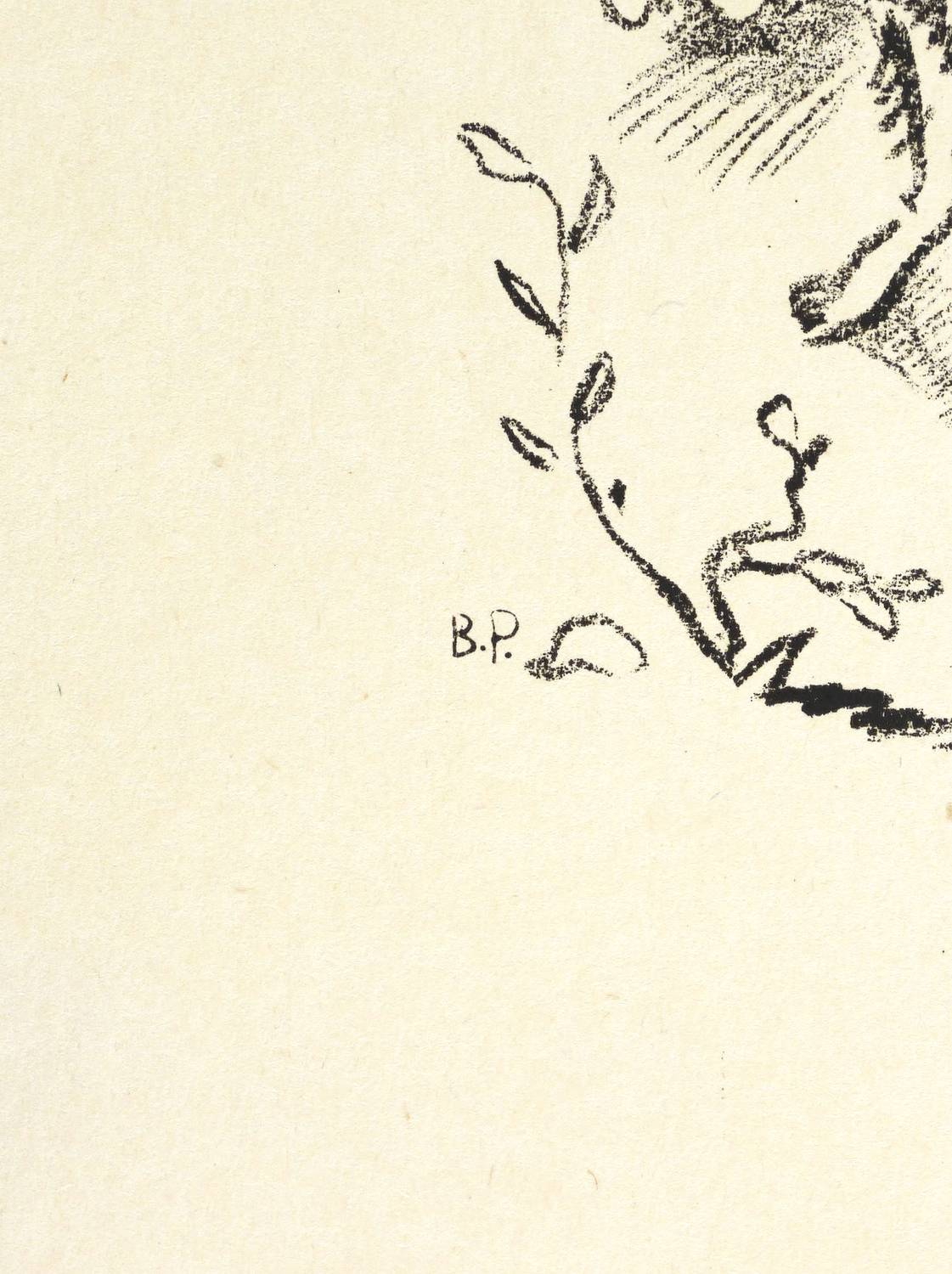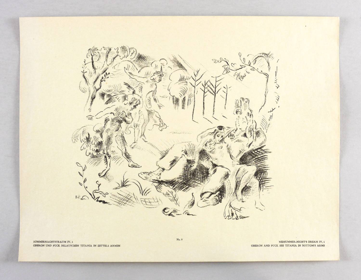 Nicht handsigniert. Im Stein links unten Signatur: ″B.P.″ Im unteren Blattrand typografisch bezeichnet: ″SOMMERNACHTSTRAUM IV.2 / OBERON UND PUCK BELAUSCHEN TITANIA IN ZETTELS ARMEN // No. 8 // MIDSUMMER-NIGHT'S DREAM IV.1 / OBERON AN DPUCK SEE TITANIA IN BOTTOM'S ARMS″. – Papier mit kaum merklichen Lagerspuren. Guter Zustand.