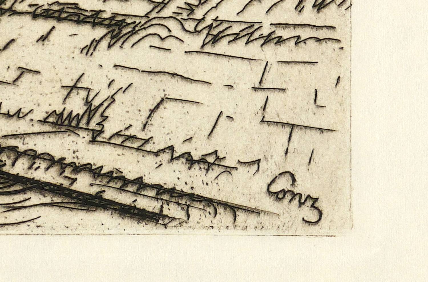 1928. Radierung / Strichätzung, in Schwarz, auf hellem wolkigem Büttenpapier. – Originale Künstlergrafik, von Walter Conz. – 18,1 x 26,7 cm (Darstellung), 18,8 x 27,6 cm (Platte), 38 x 50 cm (Blatt).