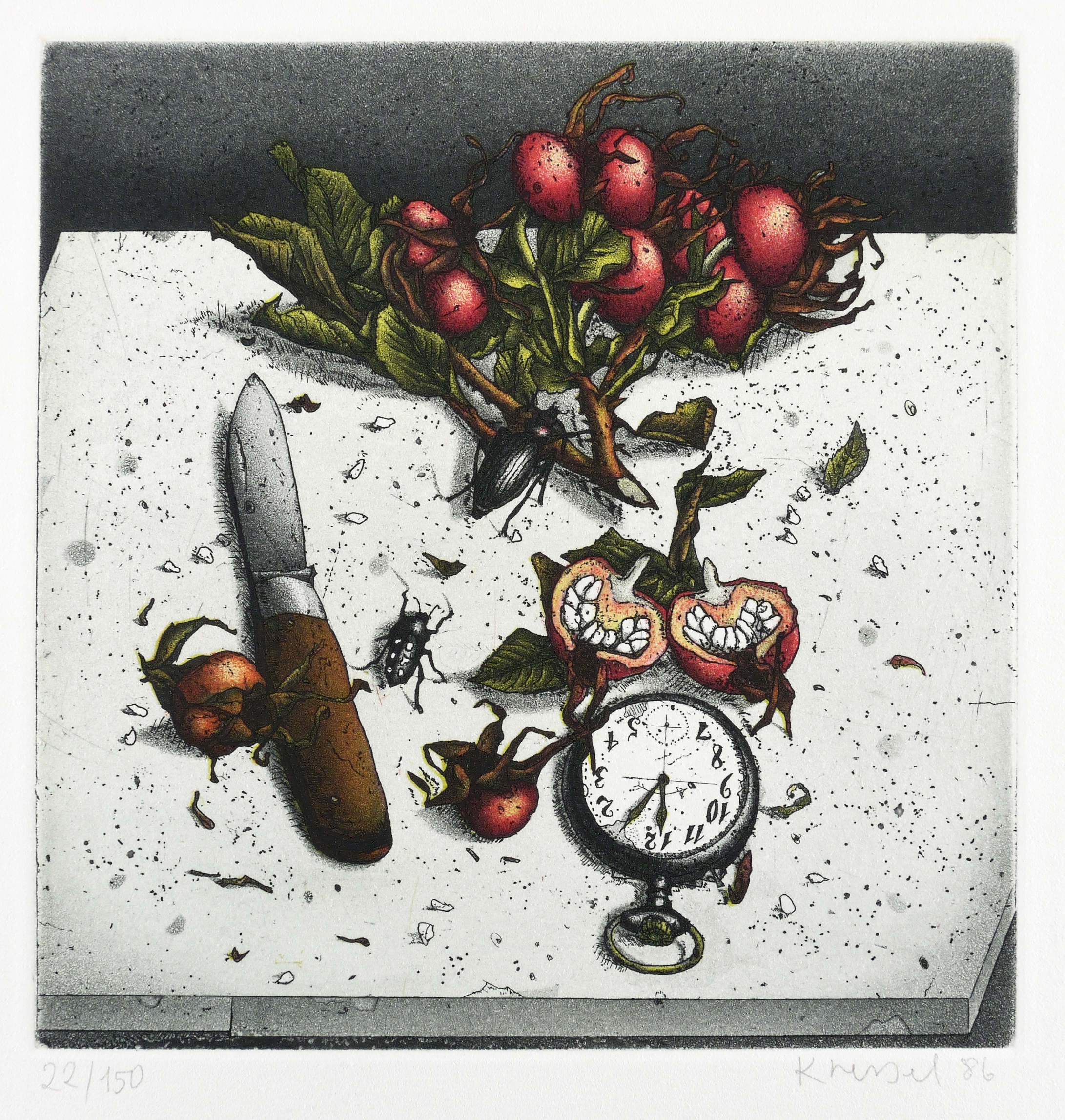 1986. Farbradierung / Aquatinta & Strichätzung, in 6 Farben, auf weißem Velinkarton. – Originale Künstlergrafik, von Diether Kressel. – Auflage Exemplar Nr. 22/150. – 18,2 x 17,5 cm (Darstellung / Platte), 22 x 21 cm (Blatt).