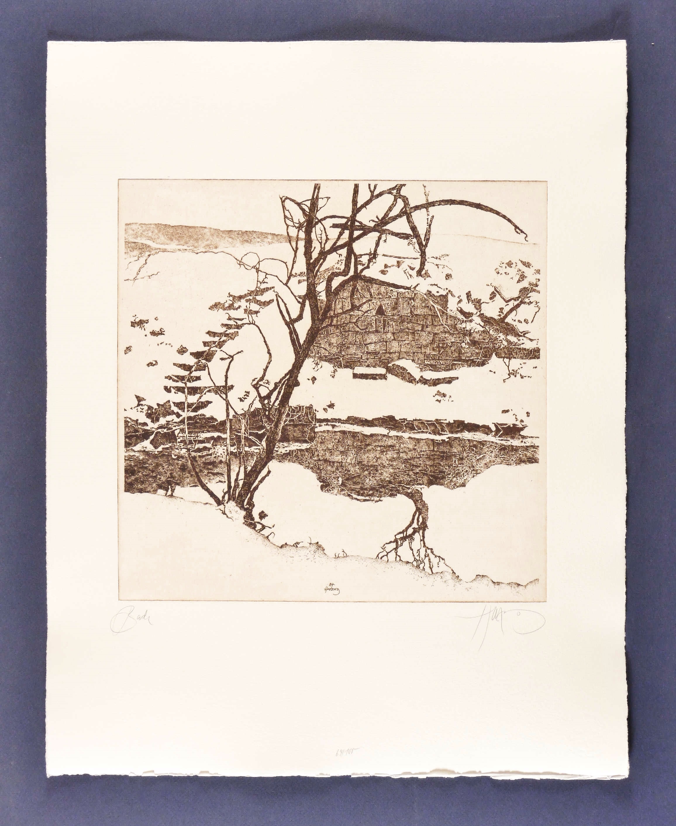 1984. Radierung / Strichätzung, in Rotbraun, mit Plattenton, auf Büttenpapier. – Originale Künstlergrafik, von Walter Herzog. – Auflage Exemplar Nr. 69/100. – 28,6 x 29,1 cm (Darstellung / Platte), 49 x 39,5 cm (Blatt).