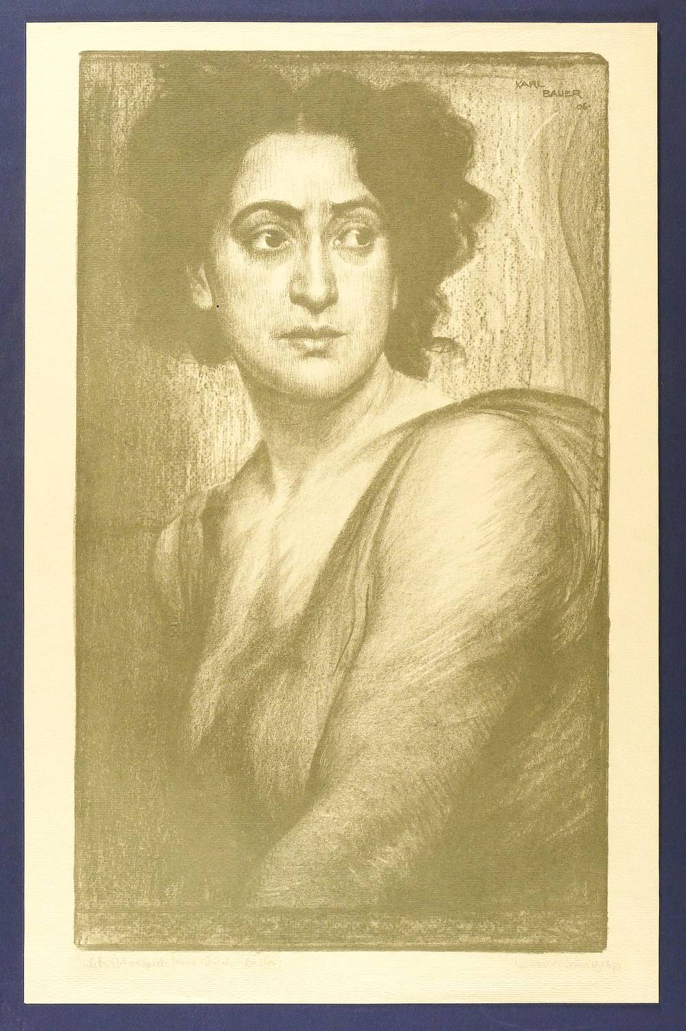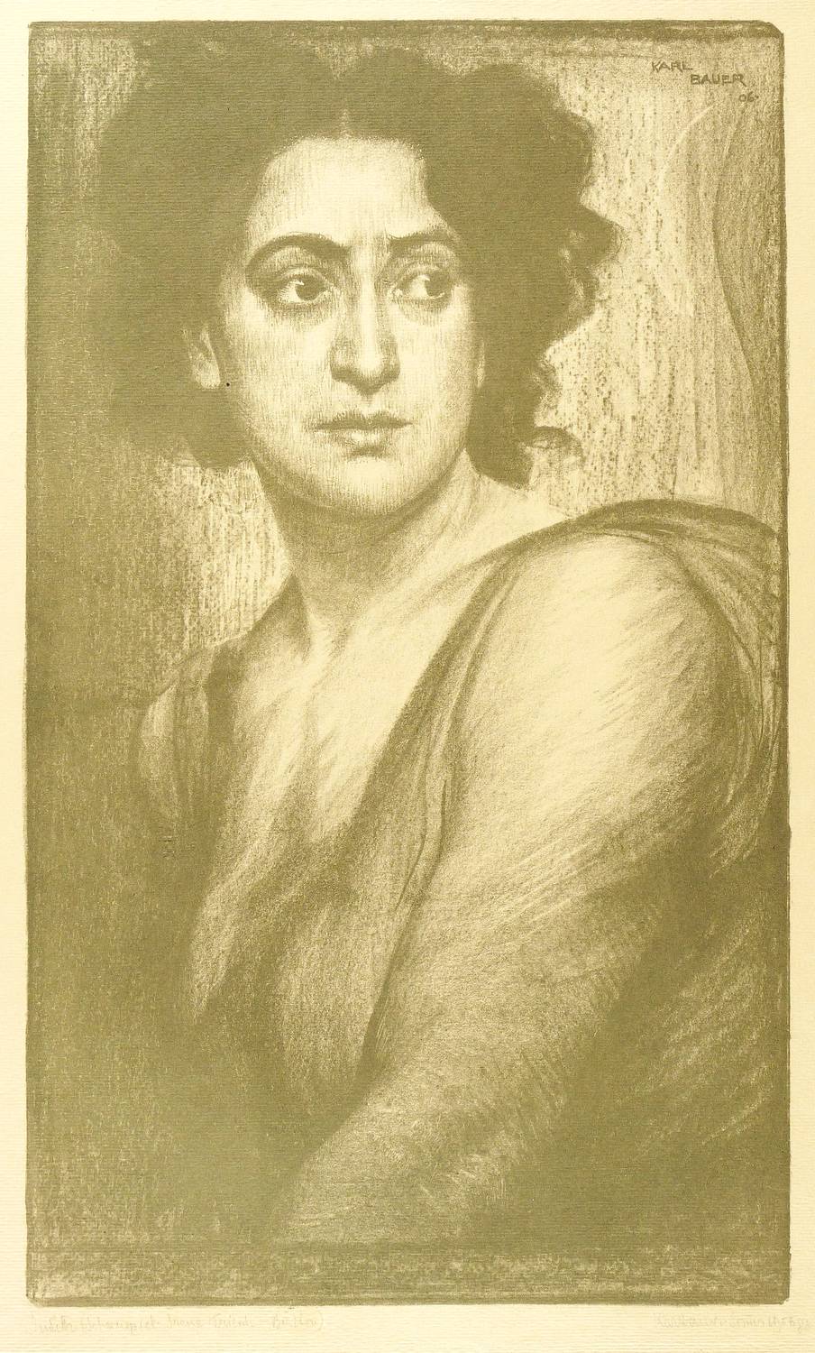 Links unten in Bleistift signiert: ″Karl Bauer. Som[m]er 1906 gez.″ Rechts eigenhändiger Titel. Im Stein rechts oben ebenfalls Signatur und Jahr: ″KARL BAUER 06.″ – Zeigt die Schauspielerin in der Rolle der Judith aus dem Drama ″Totentanz″ (1900) von August Strindberg. – Unscheinbare Knickspuren im Rand. Sonst sehr gut erhalten.