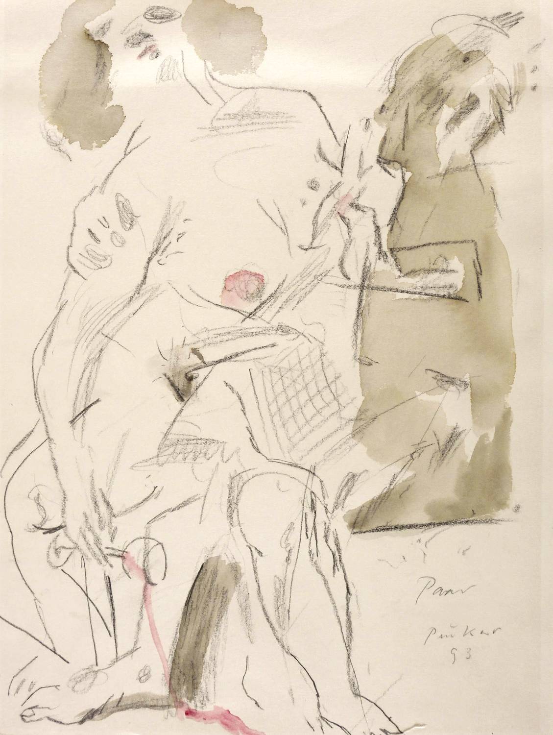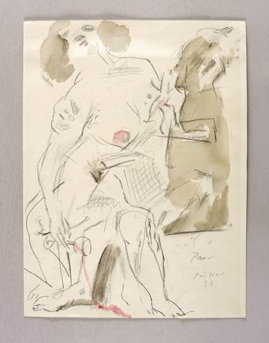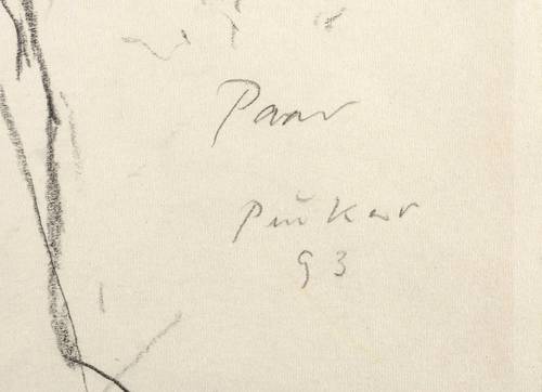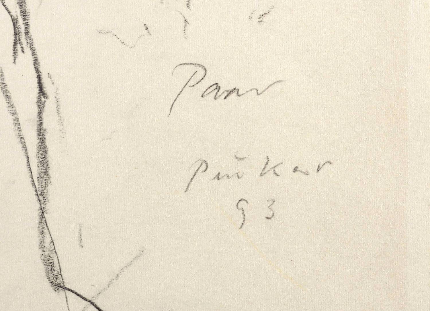Rechts unten in Bleistift betitelt, signiert und datiert: ″Paar Peuker 93″. – Rückseitig weitere Graphitzeichnung mit sich liebendem Paar. – In den Blattkanten schwach ausgeprägter Lichtrand. Unten kurzer Randriss. Insgesamt mäßig guter Zustand.