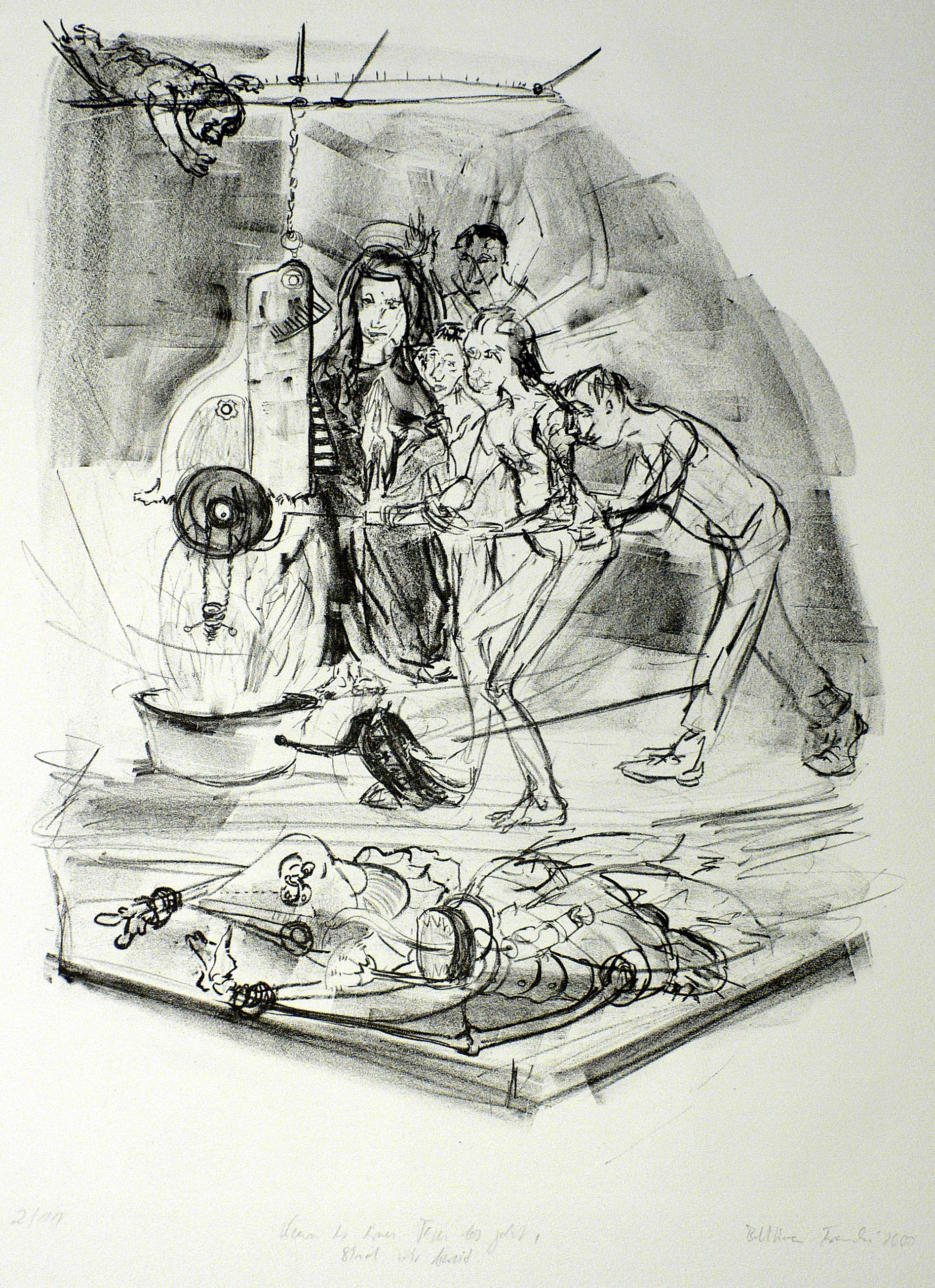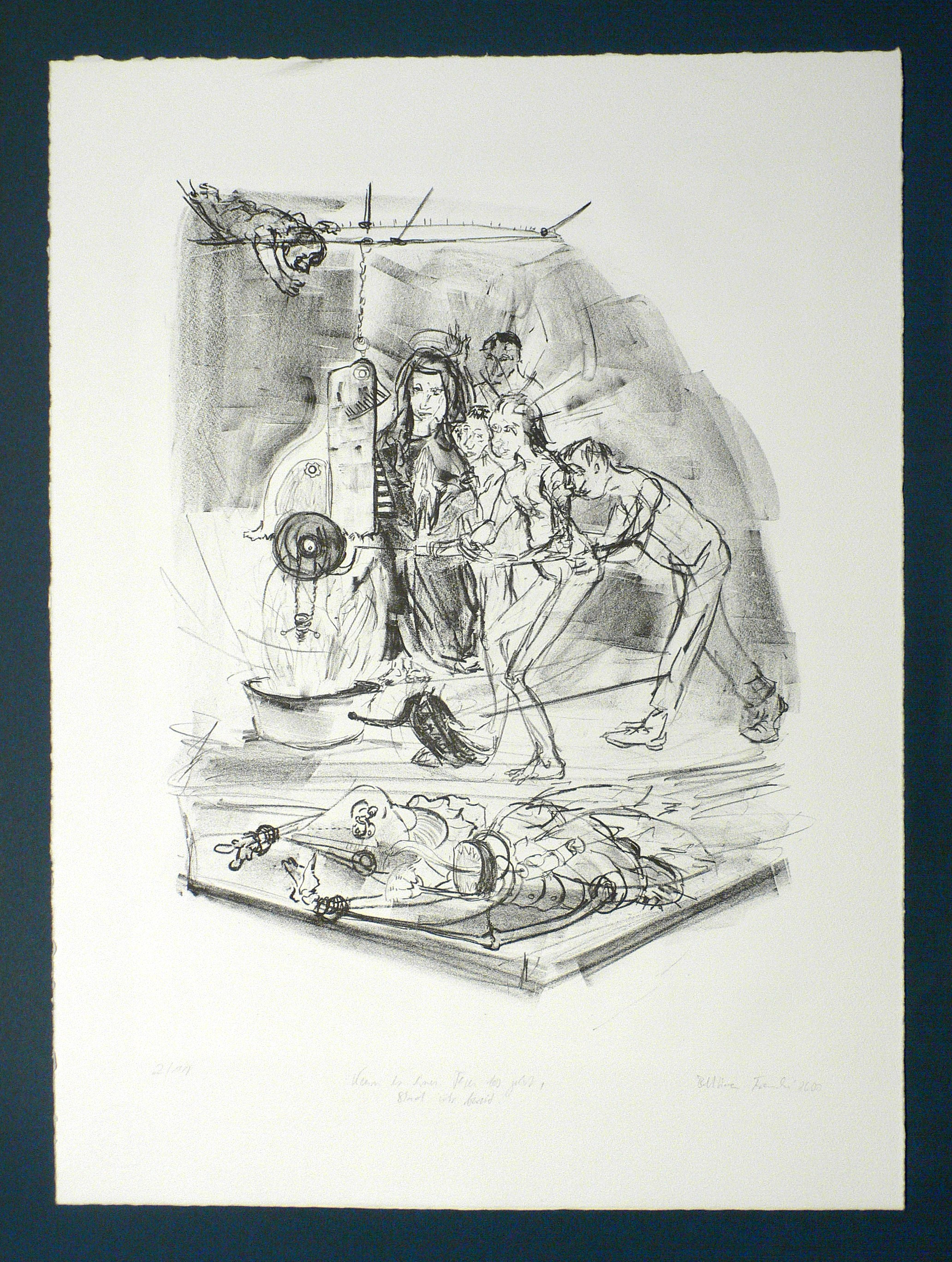 2000. Lithografie / Kreidelithografie, auf Hahnemühle-Bütten. – Von Bettina Francke. – Auflage Exemplar Nr. 2/11. – 40,5 x 30,5 cm (Darstellung / Stein), 53 x 40 cm (Blatt).