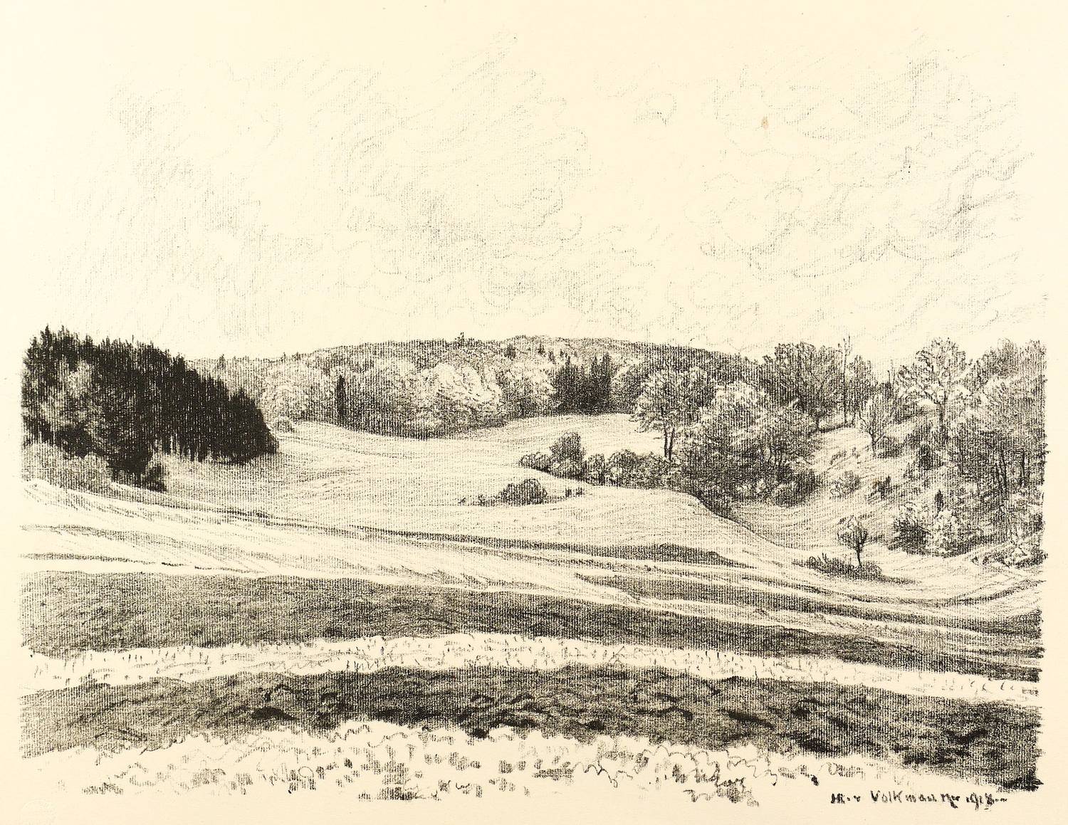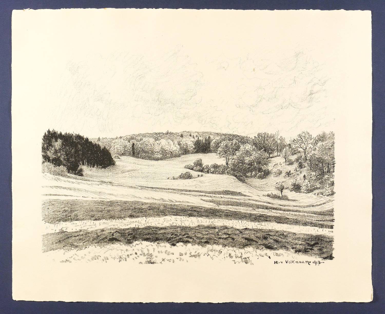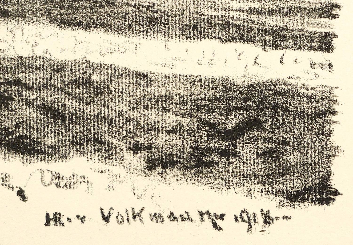 Hans Richard von Volkmann (1860 Halle/Saale - 1927 Halle/Saale). Deutscher Landschaftsmaler und Grafiker. Mitglied der Schwälmer Willingshäuser Malerkolonie. 1880-88 Studium an der Akademie in Düsseldorf. 1892 als Meisterschüler von Gustav Schönleber dem Älteren 1892 an der Kunstschule in Karlsruhe. Entwickelte sich dort zum bedeutendsten Vertreter der sogenannten Karlsruher Landschaftsschule. Seine Farblithografien und Radierungen gehören neben denen von Hans Thoma zum Besten, was diese Schule hervorbrachte.