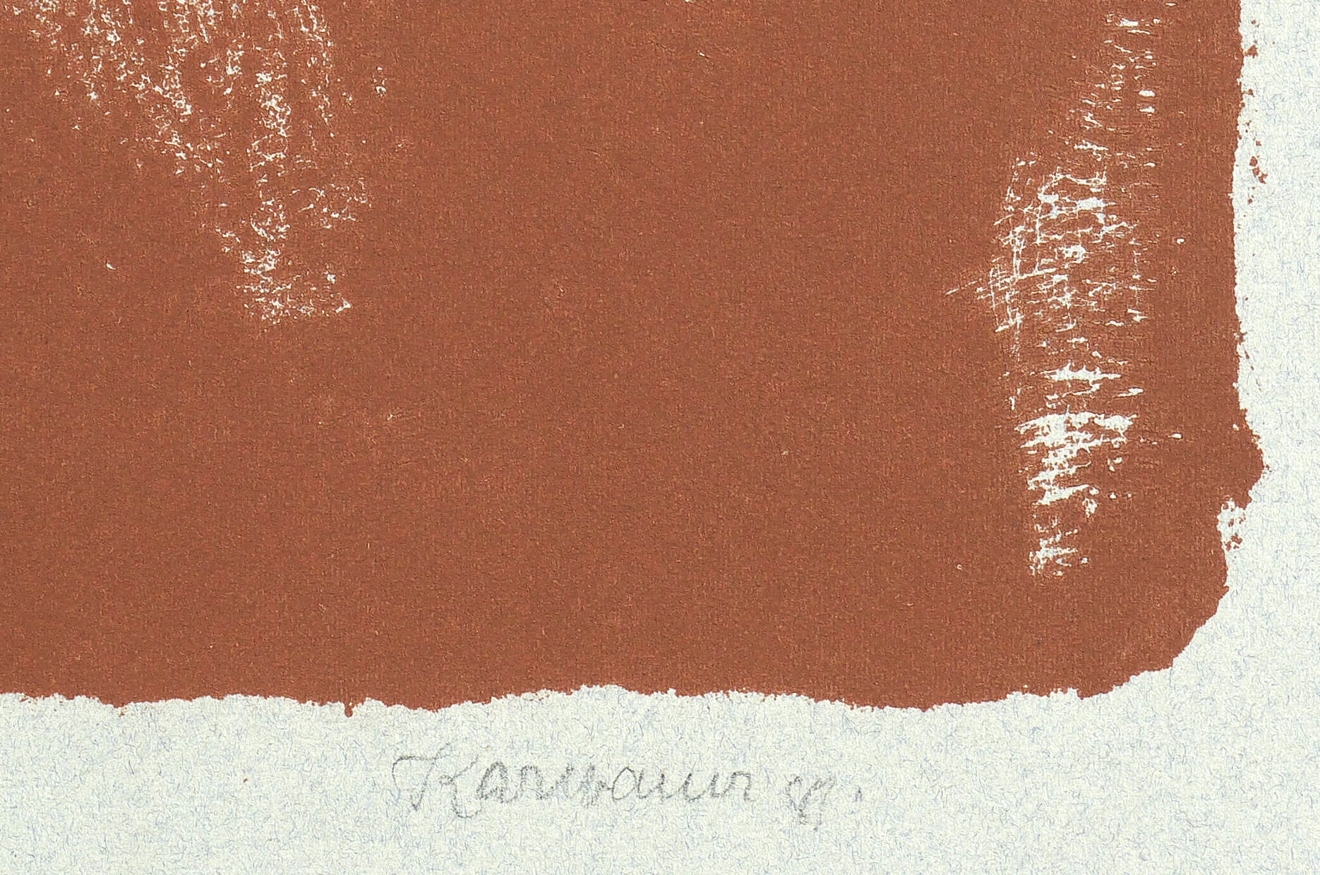 1901. Lithografie / Pinsel- & Kreidelithografie, partiell geschabt, in Rotbraun, auf blaugrauem Büttenkarton. – Originale Künstlergrafik, von Karl Bauer. – 37,8 x 28,9 cm (Darstellung / Druckbild), 47 x 35 cm (Blatt).