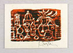 1978. Farbholzschnitt, in Dunkelorange & Schwarz, auf hellgelbem Velinkarton. – Originale Künstlergrafik, von Helmut Schmidt-Kirstein. – 7,8 x 12,0 cm (Darstellung / Druckstock), 10,8 x 14,8 cm (Blatt).