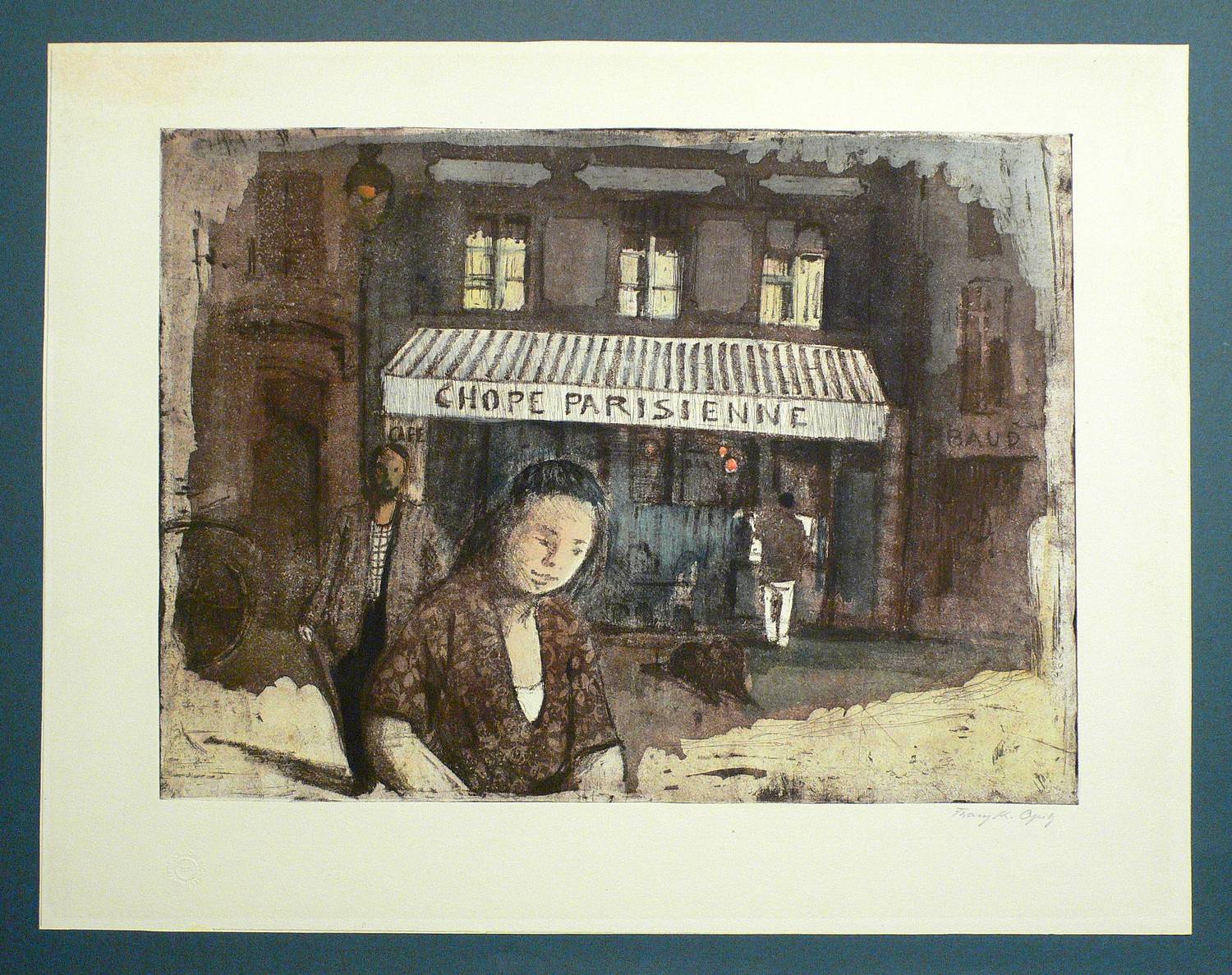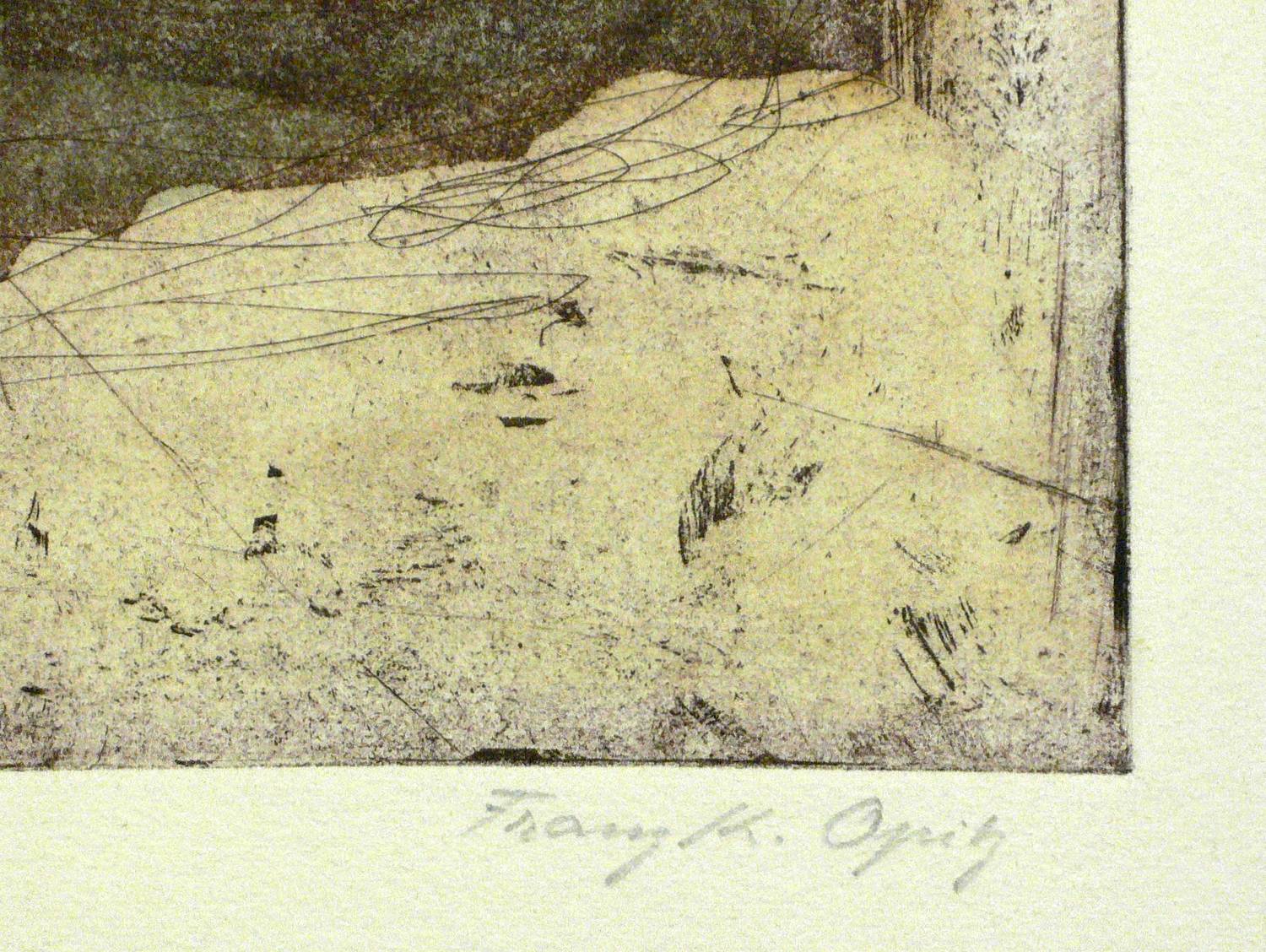 Franz Karl Opitz (1916 Zürich - 1998 Oberfelden). Schweizer Maler, Grafiker, Musiker und Autor. 1932-34 Malunterricht bei Willy Fries und 1938-40 bei Otto Friedrich Emil Séquin in Zürich. Ab 1938 arbeitete er in den Techniken Holzschnitt, Lithografie, Radierung und Aquatinta. Ab 1940 freischaffend. Ab 1944 Studienaufenthalte in Paris, in den Niederlanden, Belgien, Südfrankreich, Italien, Spanien und Marokko. Ab 1949 Mitglied im Verein für Originalgraphik. Ab 1950 Natursteinmosaiken. 1951 Mitglied der Künstlergruppe Octogon.