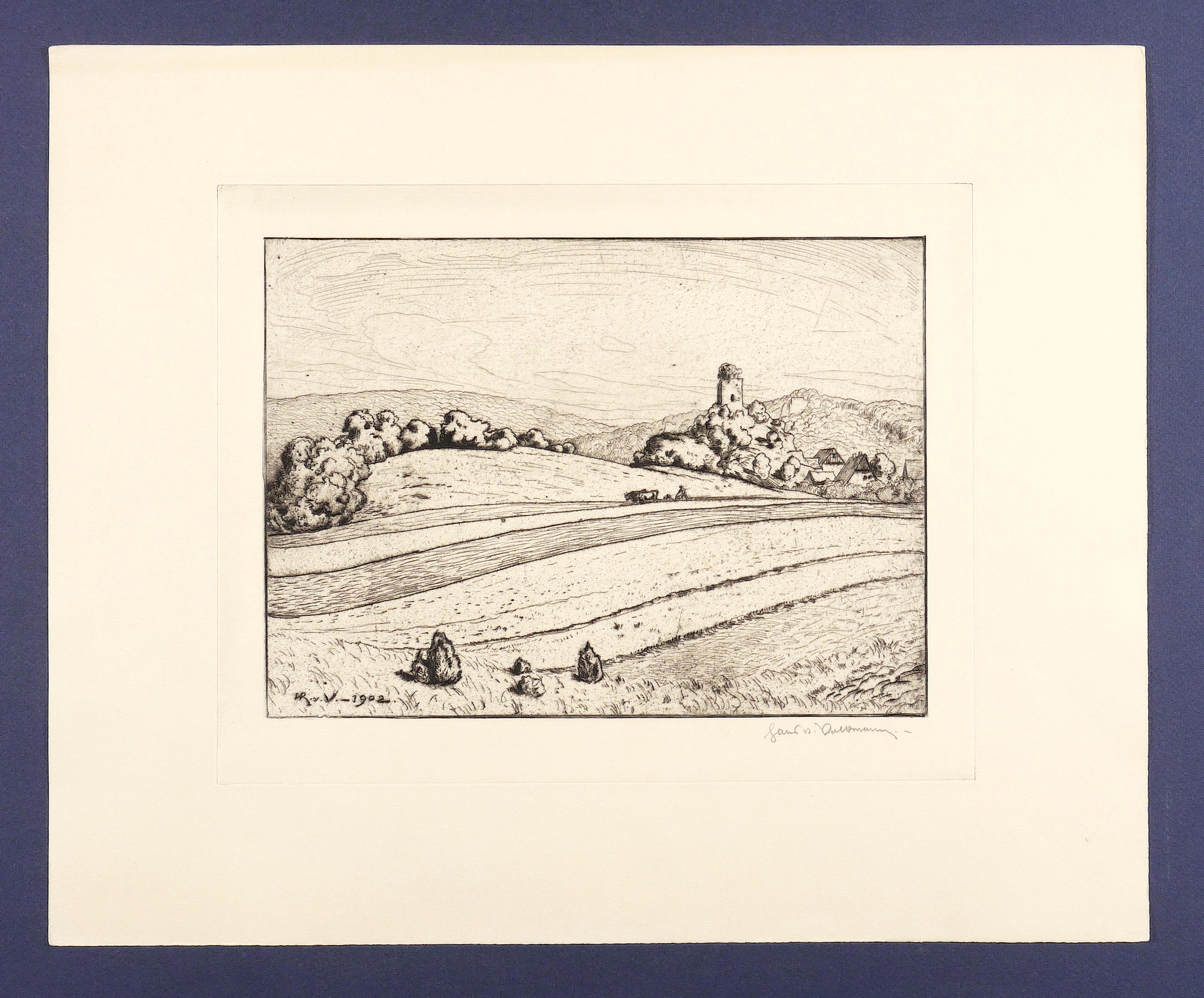 1902. Radierung / Strichätzung & Kaltnadel, mit Plattenton, in Schwarz, auf Kupferdruckkarton. – Originale Künstlergrafik, von Hans Richard von Volkmann. – 19,9 x 27,4 cm (Darstellung), 24,6 x 31,2 cm (Platte), 37 x 45 cm (Blatt).