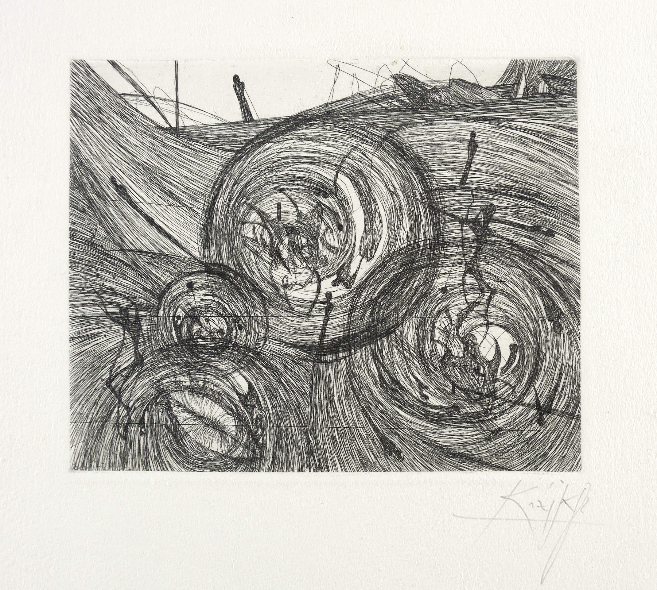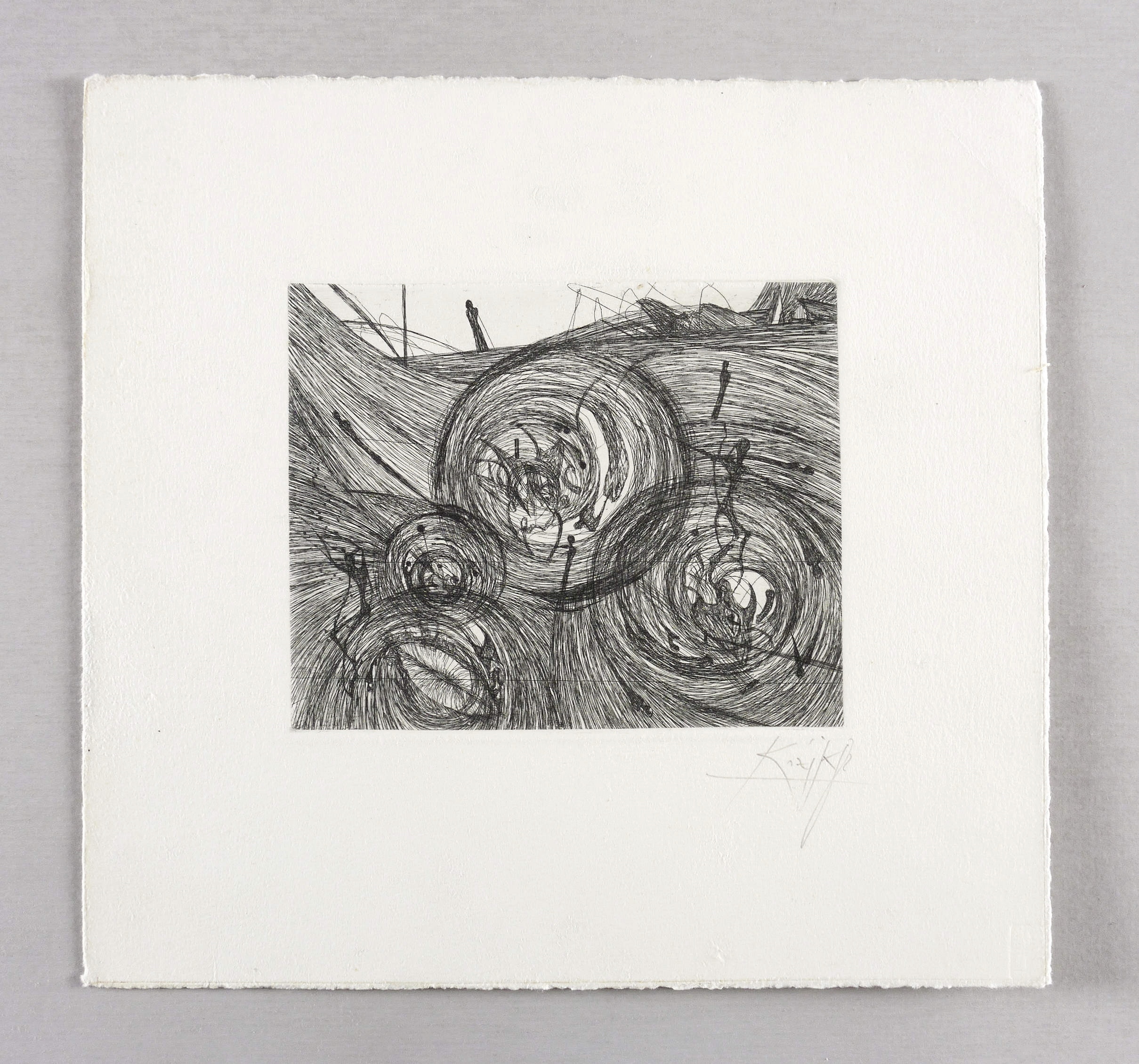 1982. Radierung / Strichätzung, Vernis mou & Roulette, in Schwarz, auf hellchamois Velin. – Originale Künstlergrafik, von Gregor Torsten Kozik. – 12,7 x 15,4 cm (Darstellung / Platte), 26 x 27 cm (Blatt).
