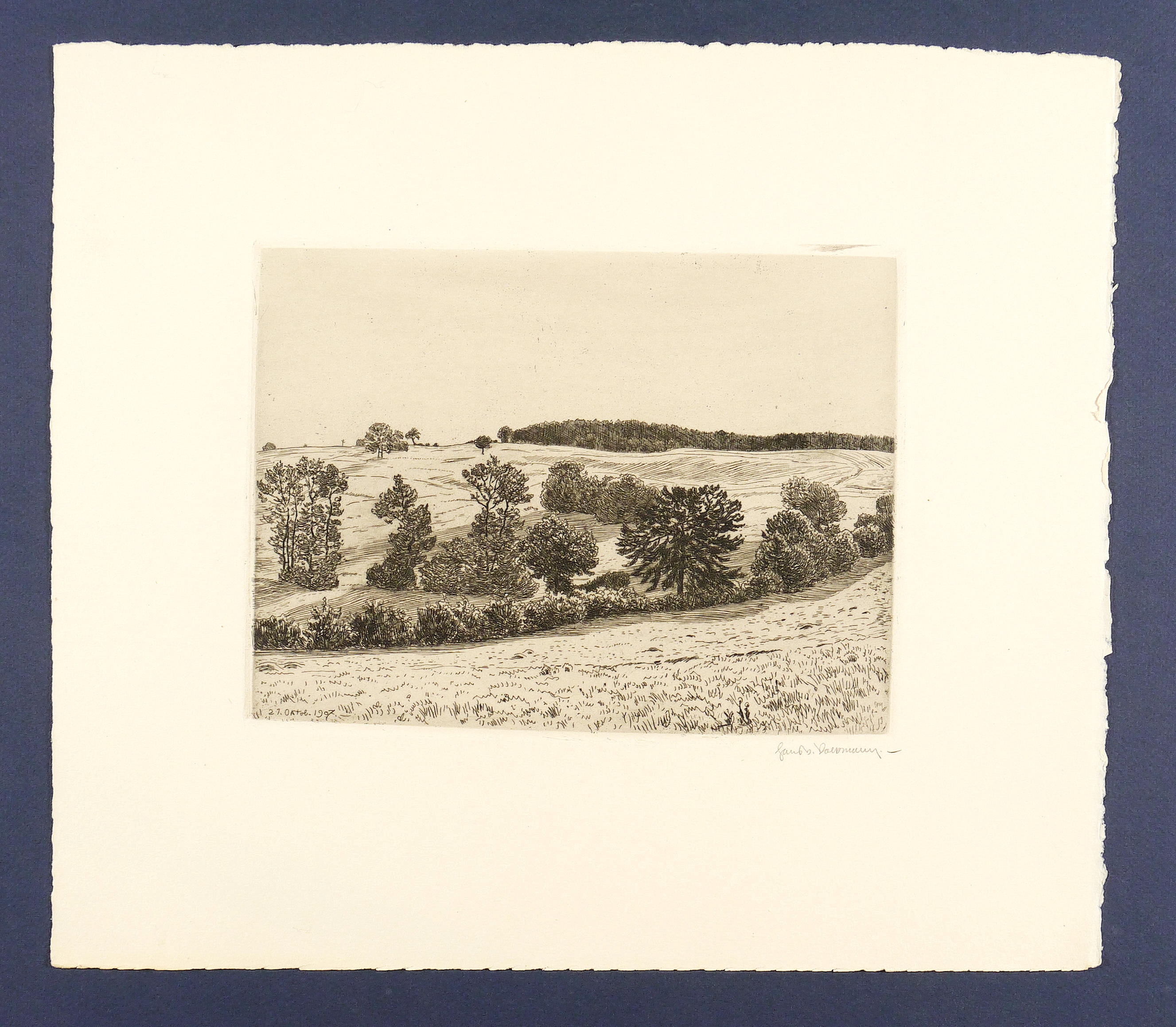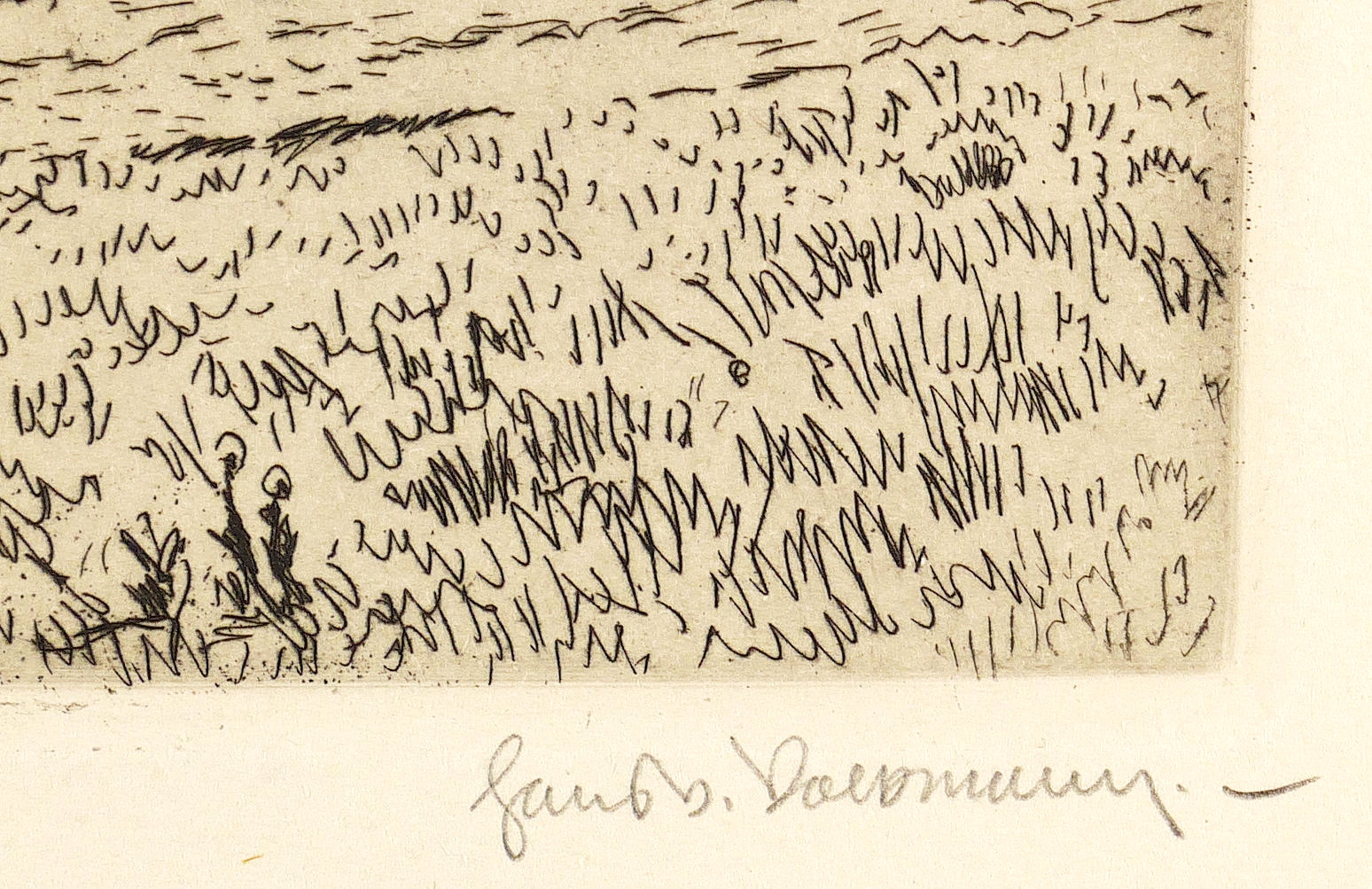 1907. Radierung / Strichätzung & Kaltnadel, mit Plattenton, in Schwarz, auf hellgelbem Kupferdruckbütten. – Originale Künstlergrafik, von Hans Richard von Volkmann. – 17,3 x 23,1 cm (Darstellung), 18,0 x 23,6 cm (Platte), 34 x 38 cm (Blatt).